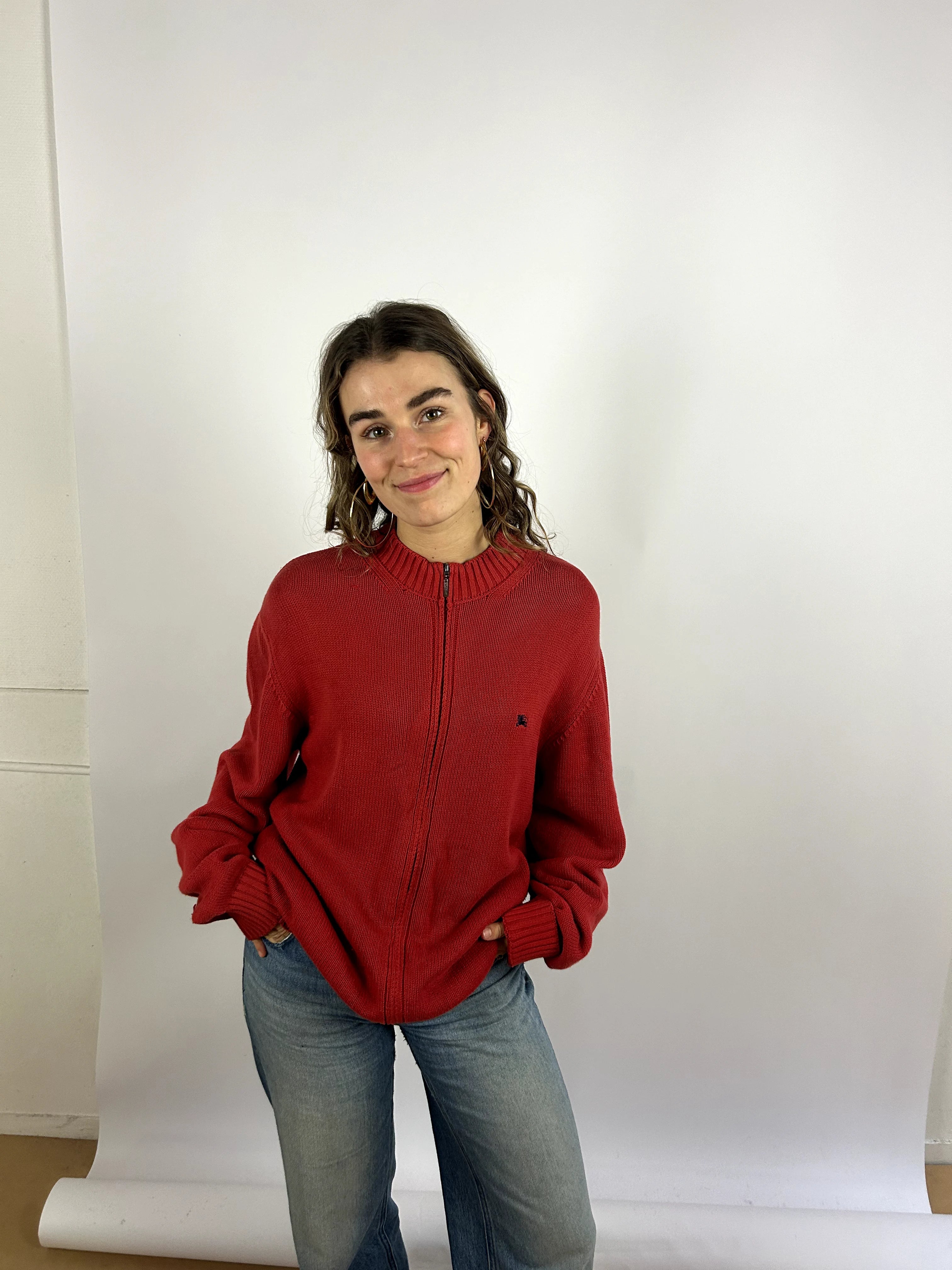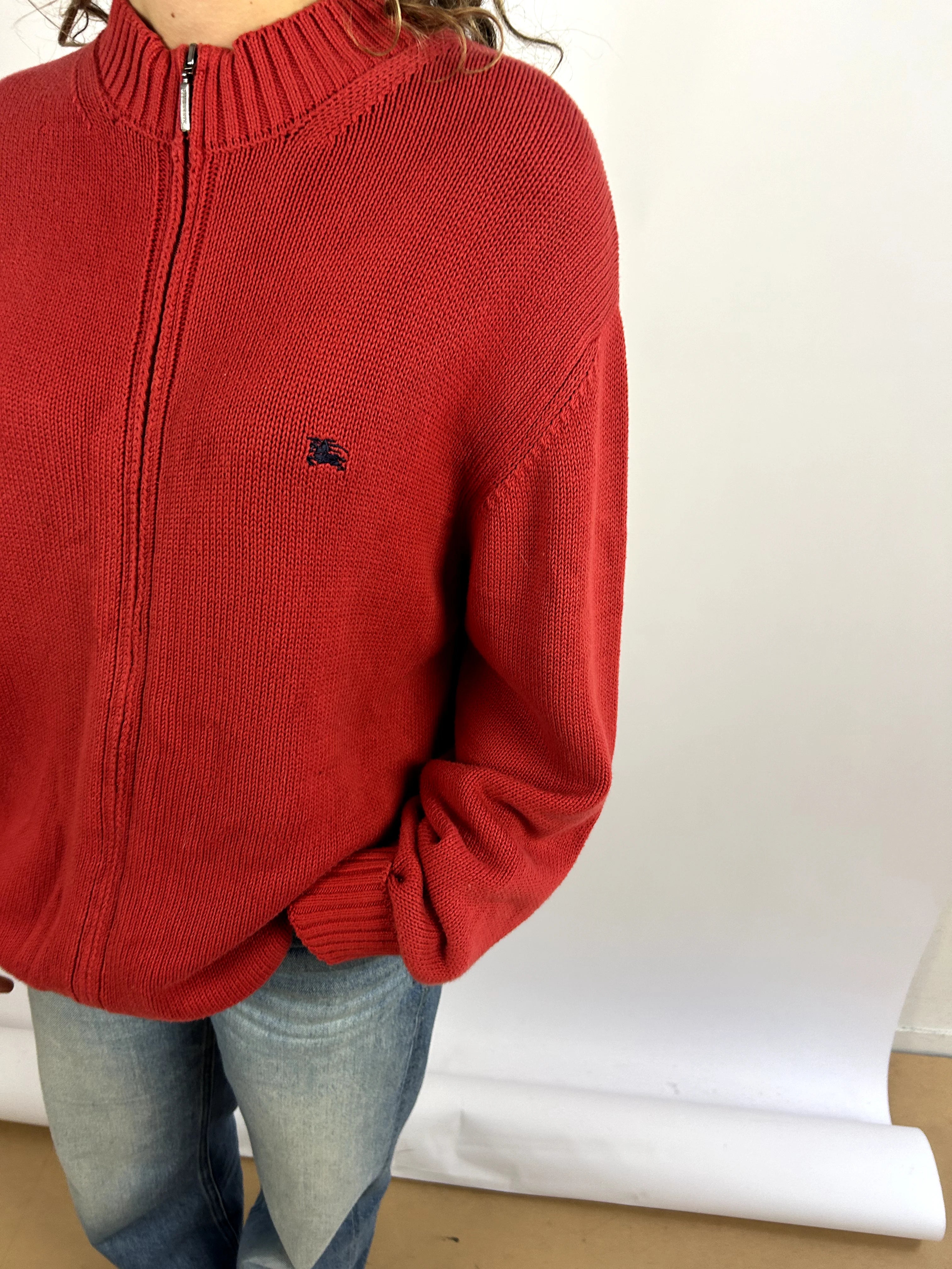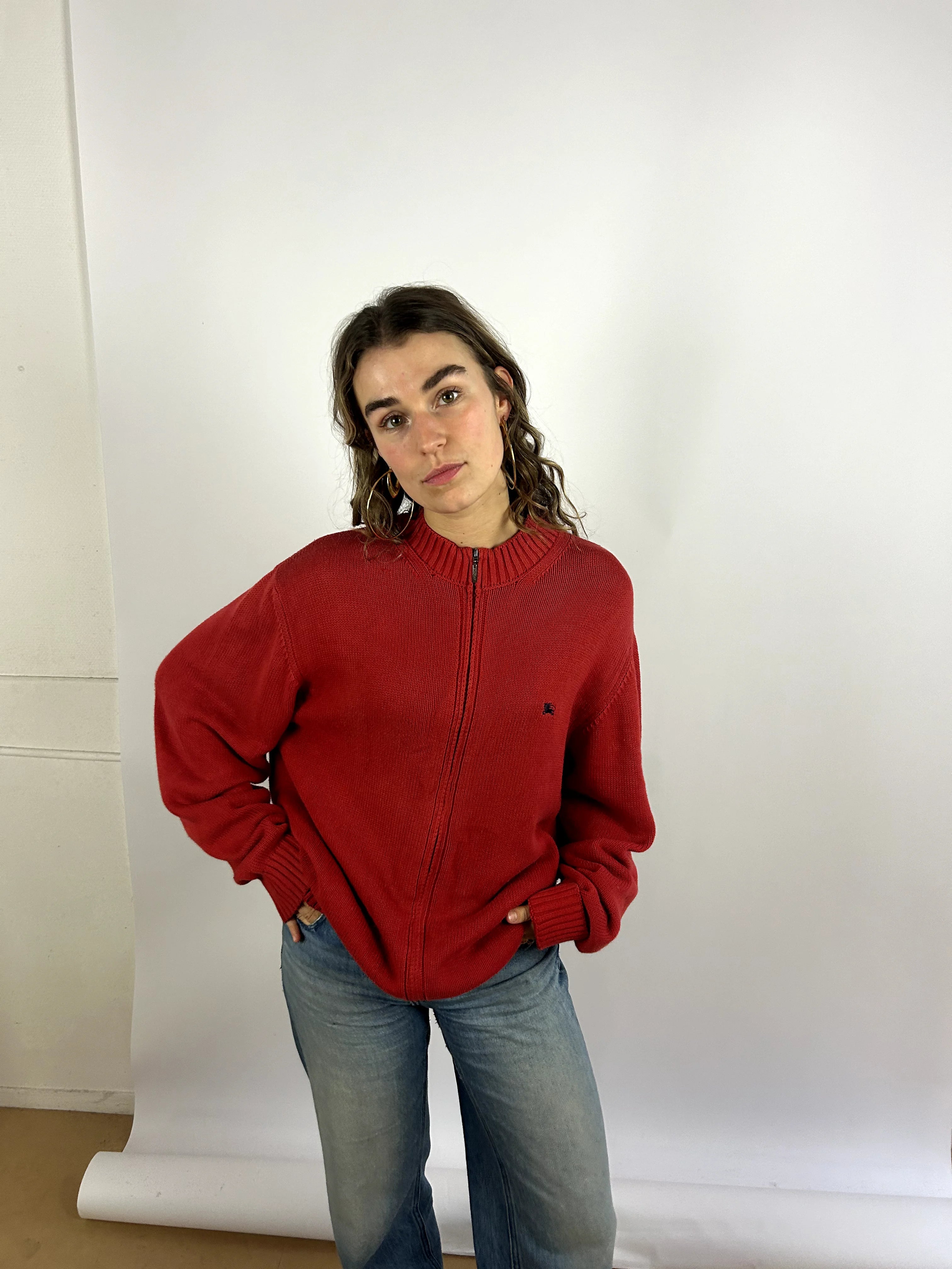 Product details: Rode gebreide zip-up trui, ribgebreide kraag en manchetten, klein logo geborduurd op de borst. Klassieke rechte fit en old-school uitstraling.