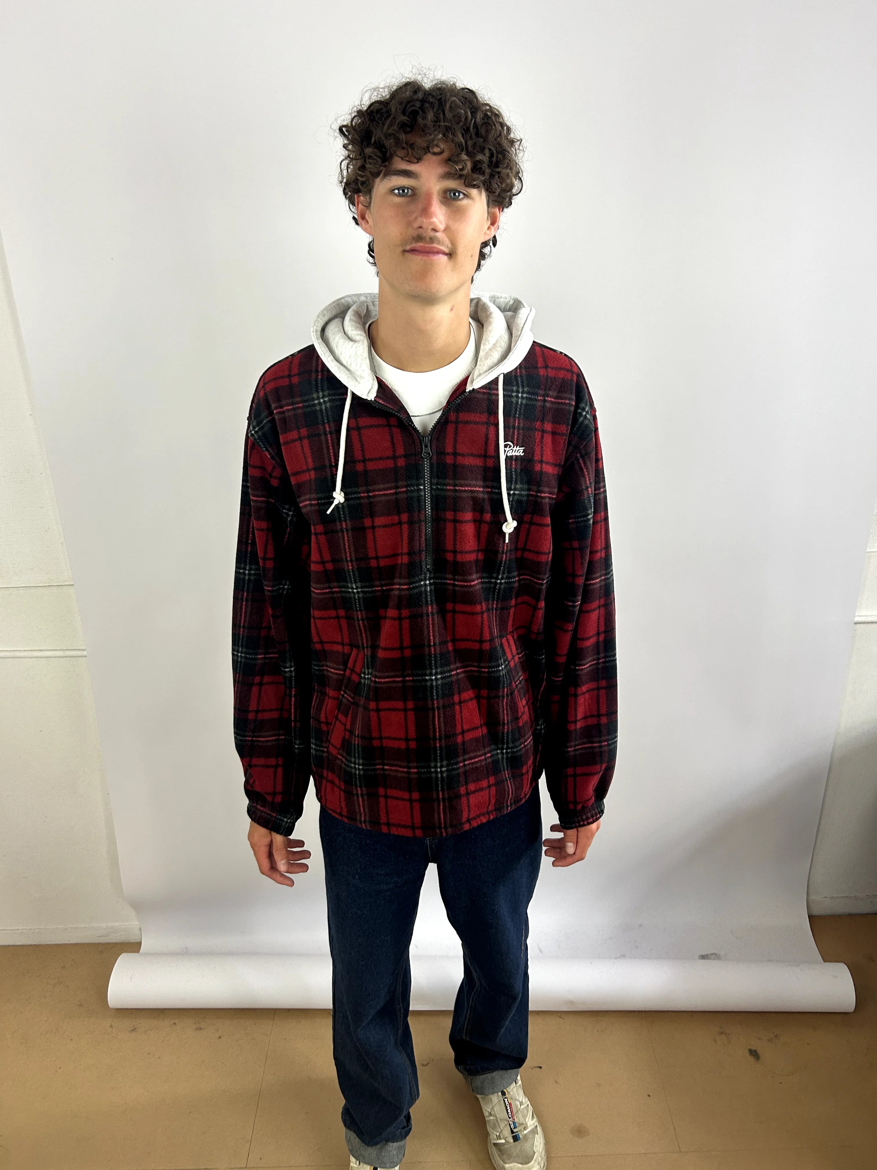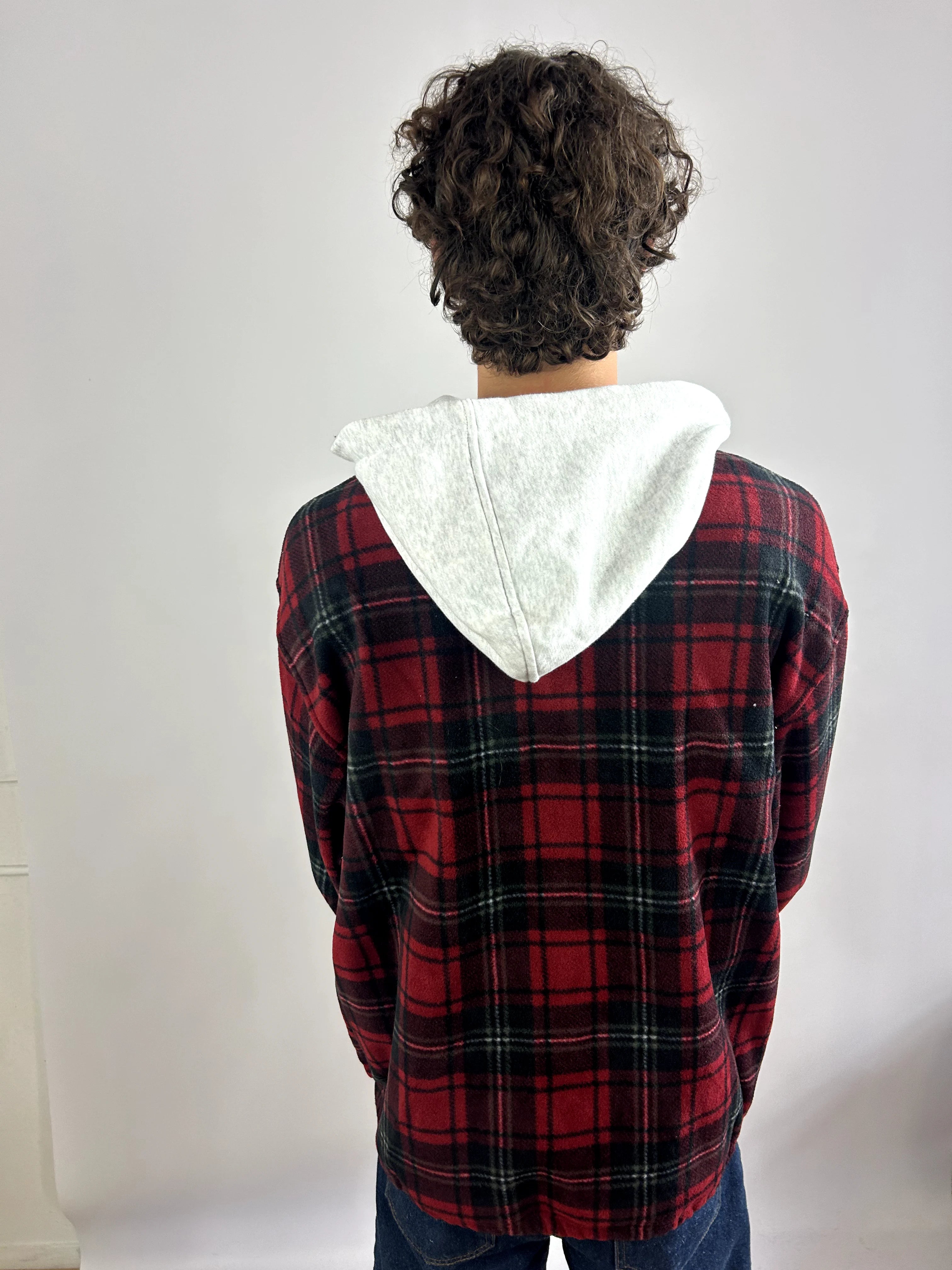 Product details: Geruit patroon rood/groen, grijze capuchon, ritssluiting, outdoor look.