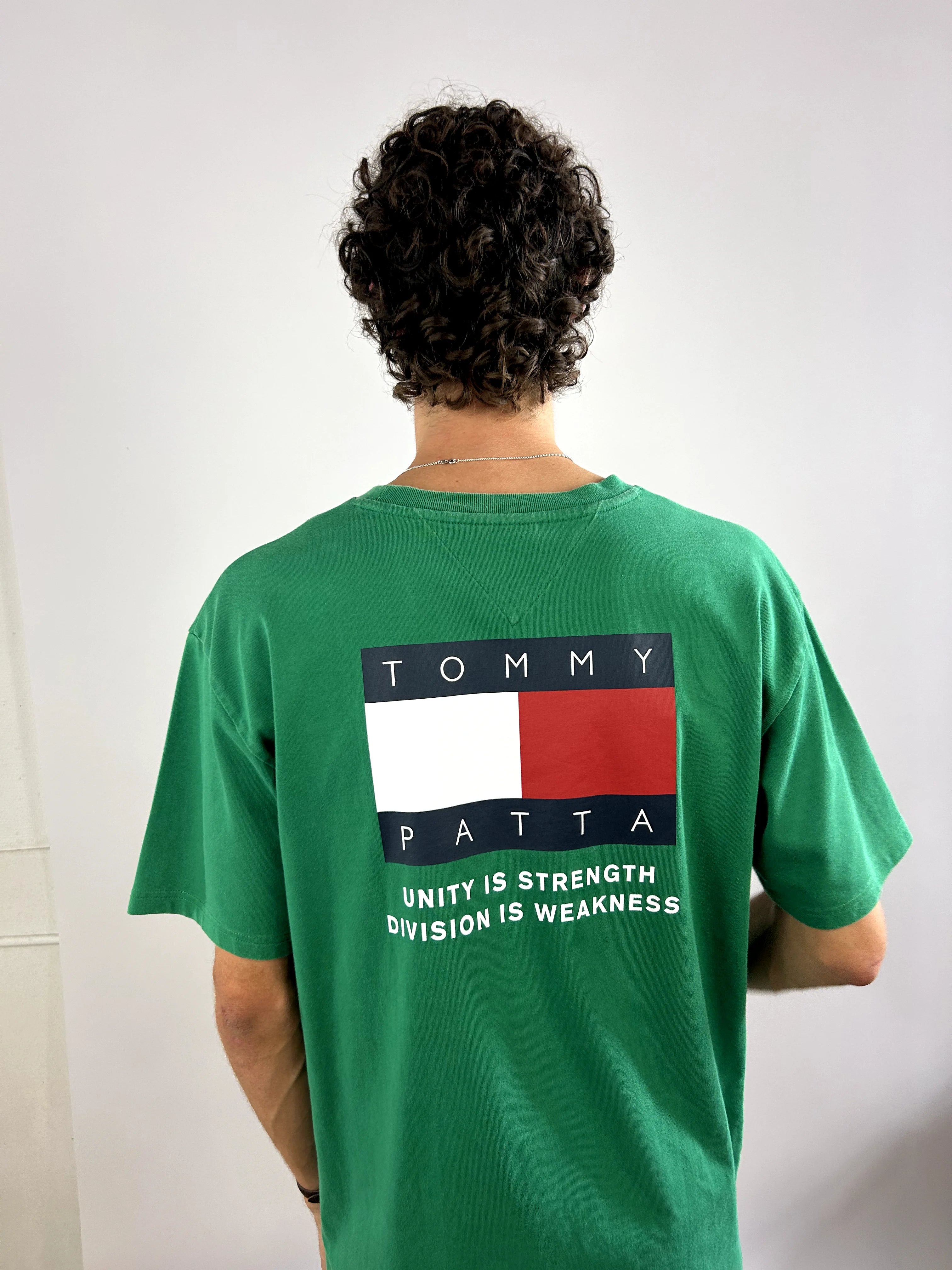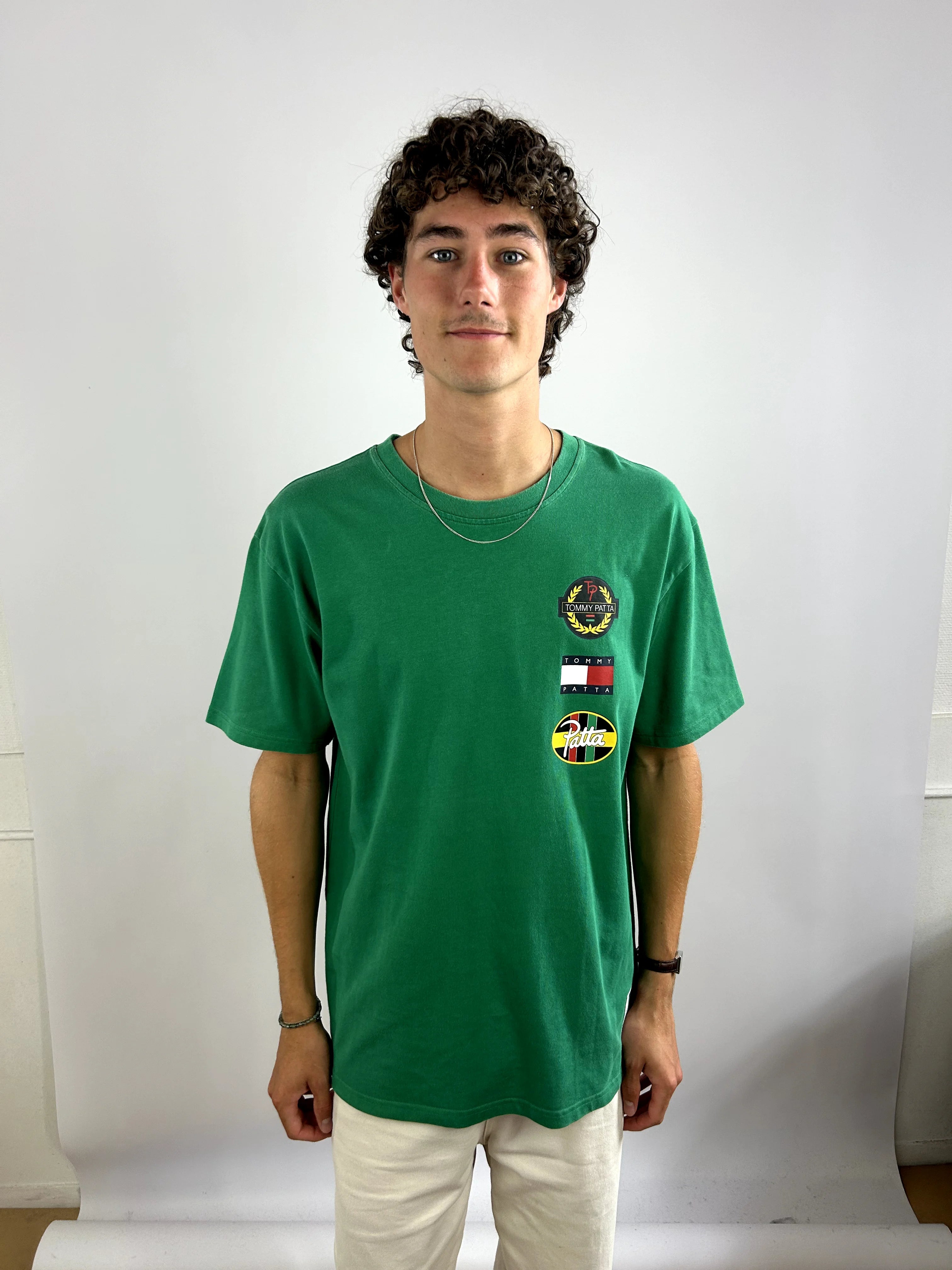 Product details: Meerdere borstlogo's, opvallende Tommy Patta rugprint, ronde hals, recht model.