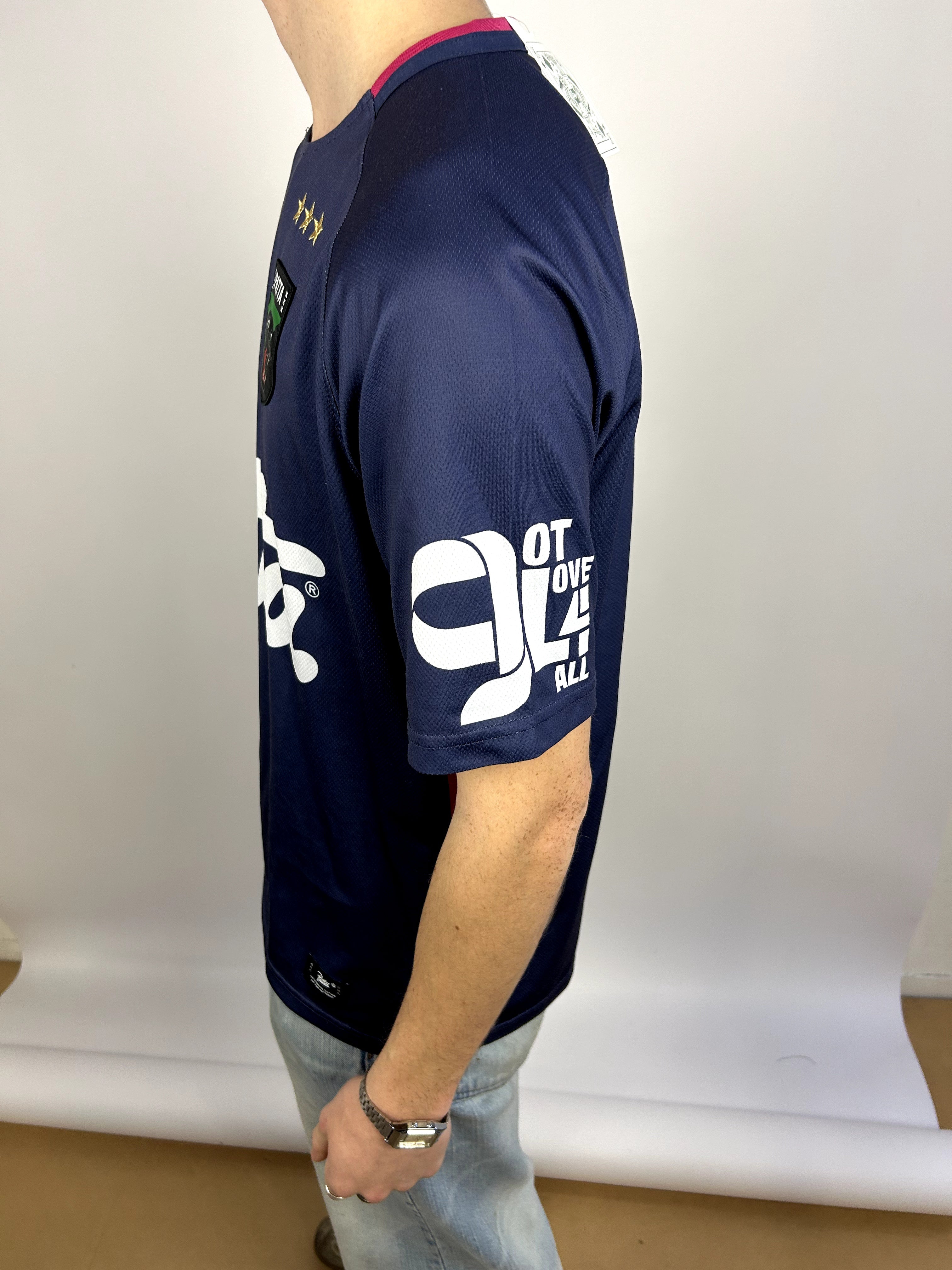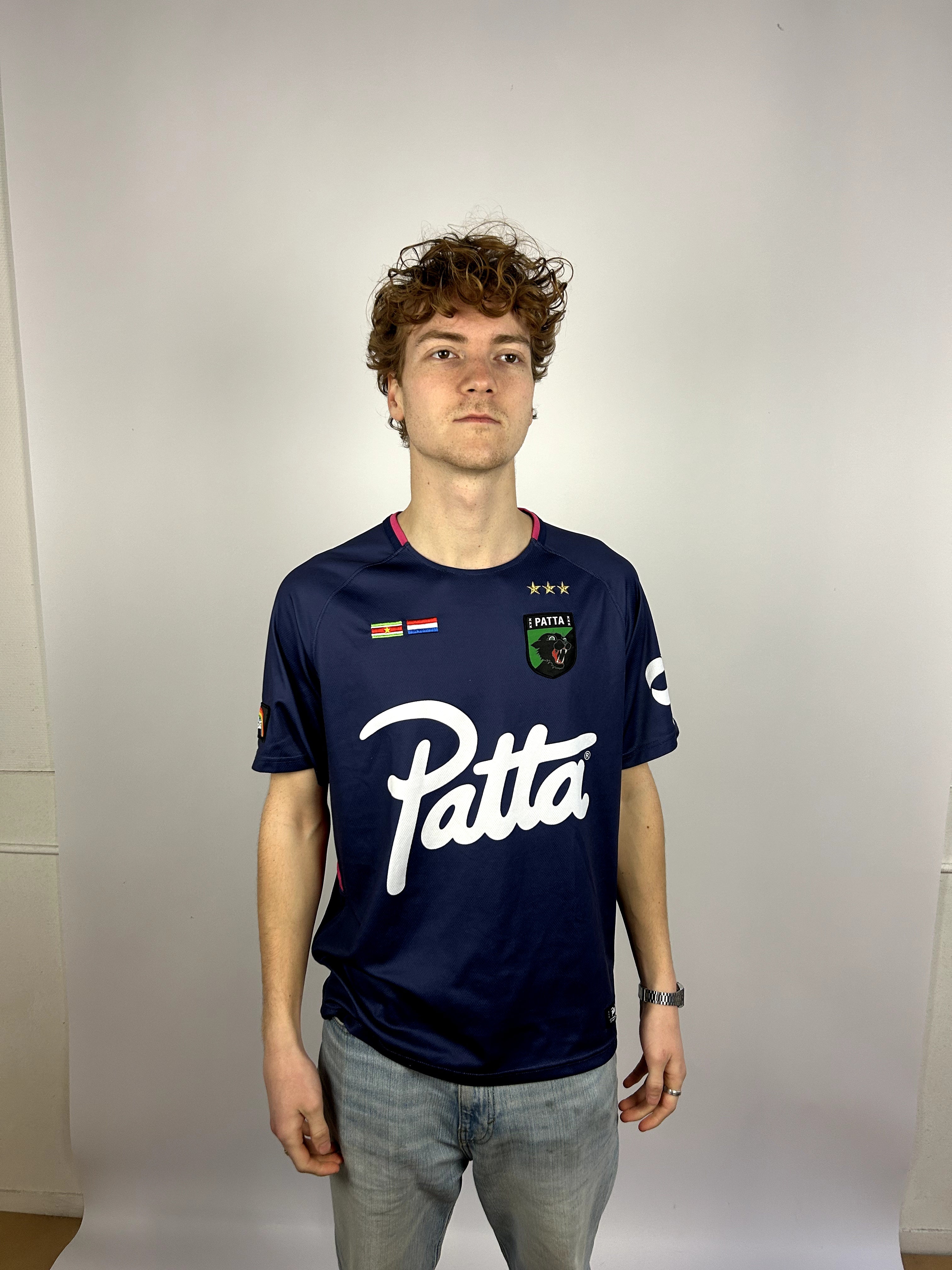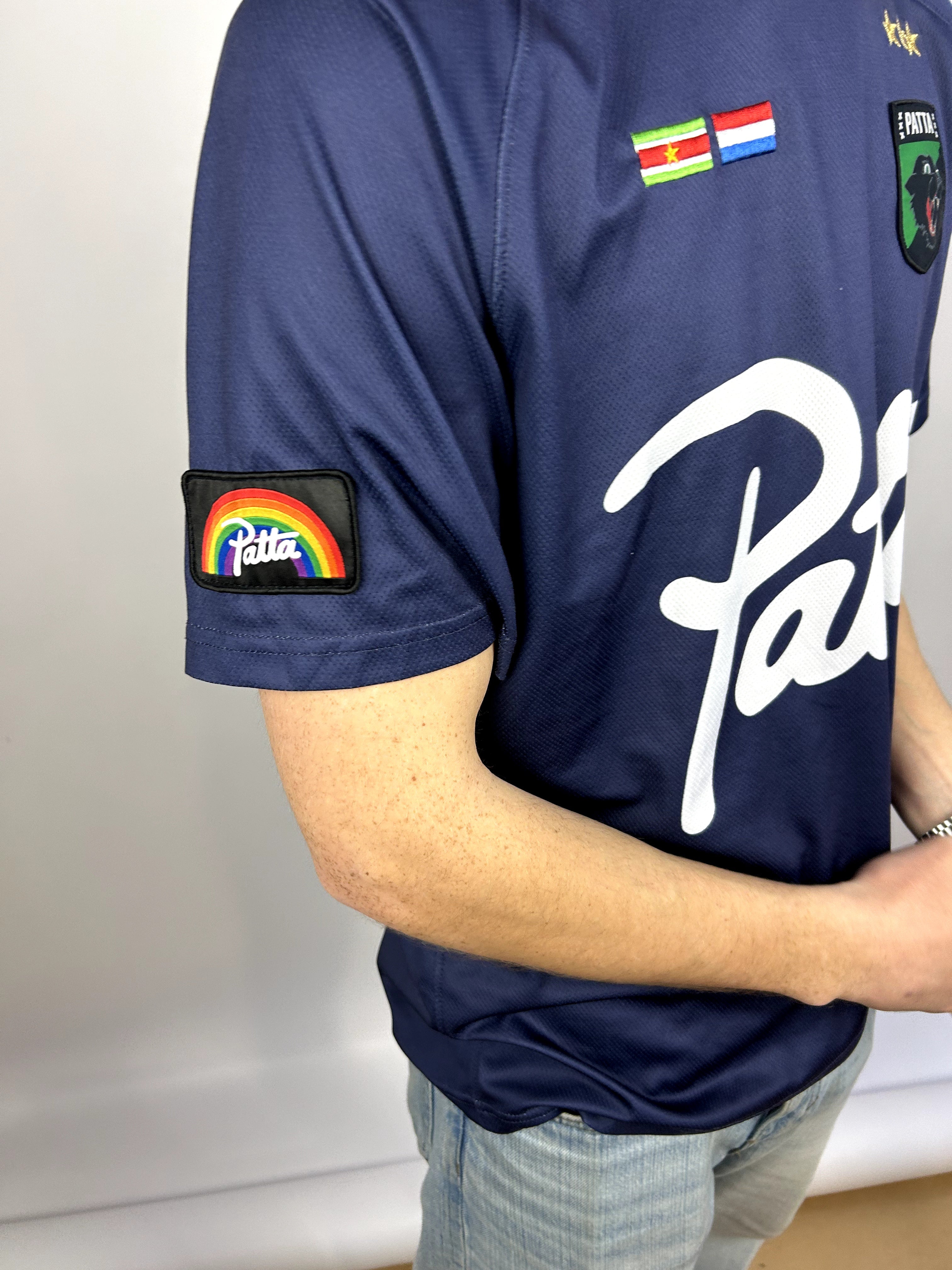 Product details: Donkerblauw sport/voetbal-jersey model van mesh-achtige polyester stof met raglanmouwen. Grote witte ‘Patta’ scriptprint op de voorkant, clubbadge met panter/kat en drie sterren op de borst, kleine vlagpatches (Suriname en Nederland) en mouwpatches: regenboog ‘Patta’ en wit ‘OT over 4 all’ logo. Contrasterende roze bies bij de hals.
