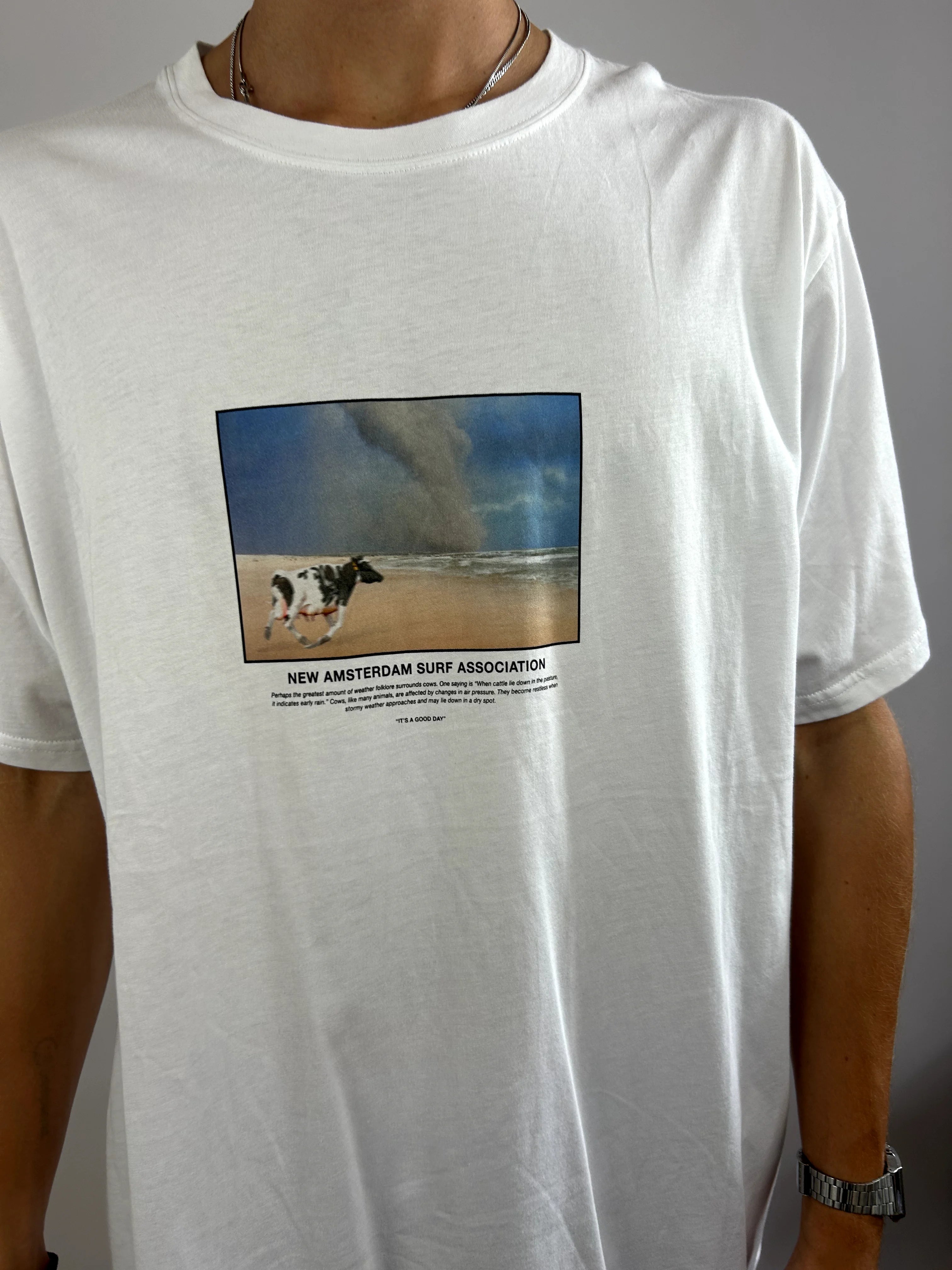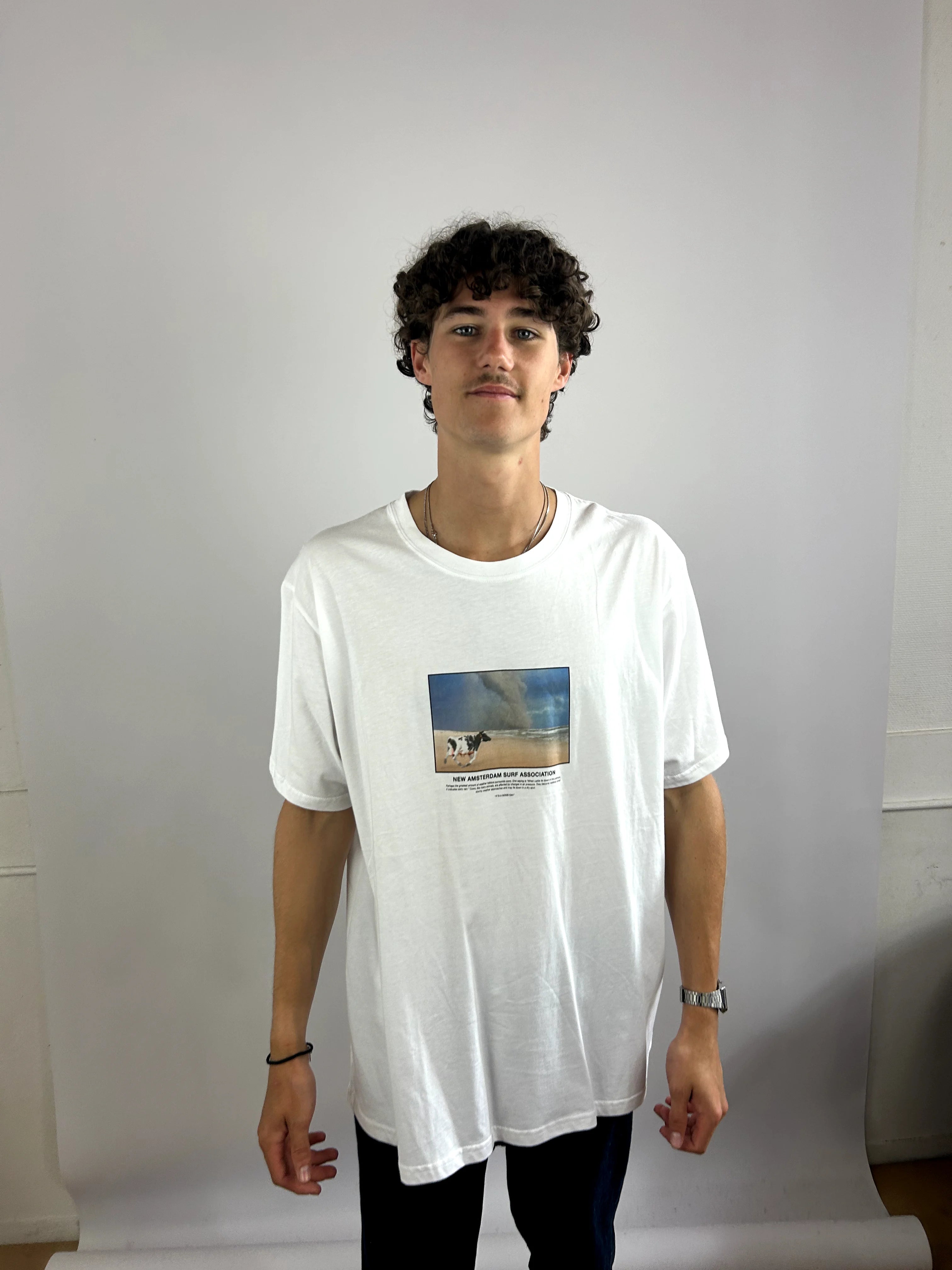 Product details: Wit, fotoprint van een koe op het strand, merknaam 'New Amsterdam Surf Association', artistiek en urban geïnspireerd.