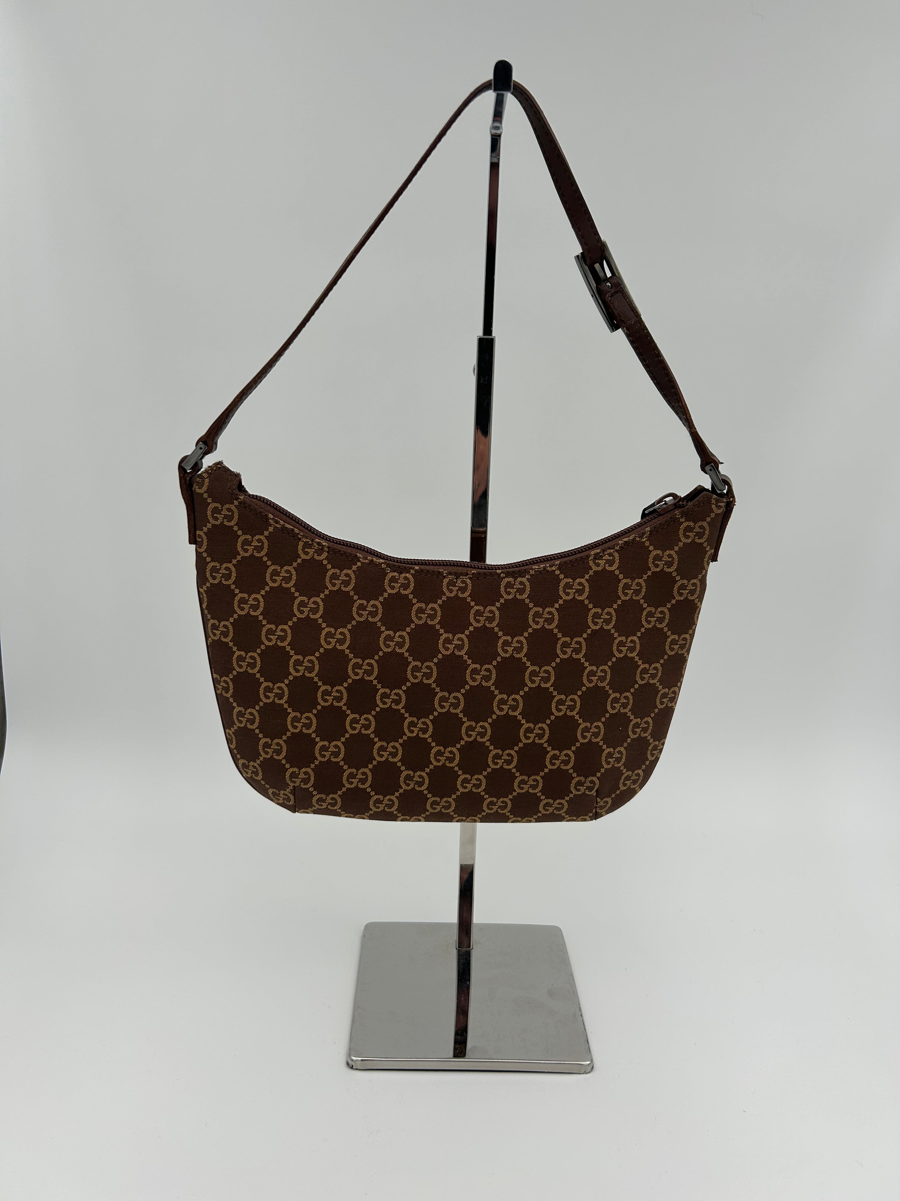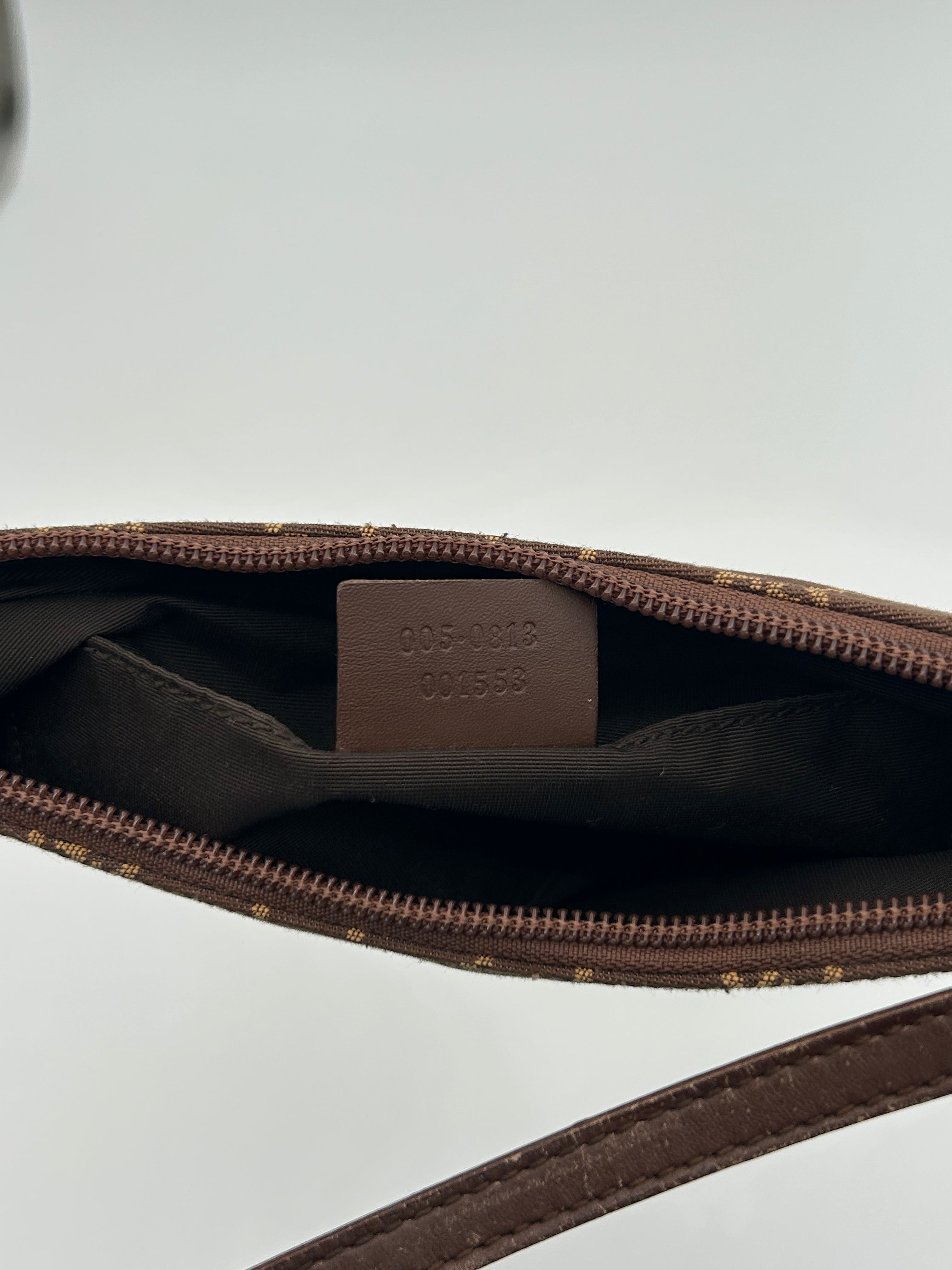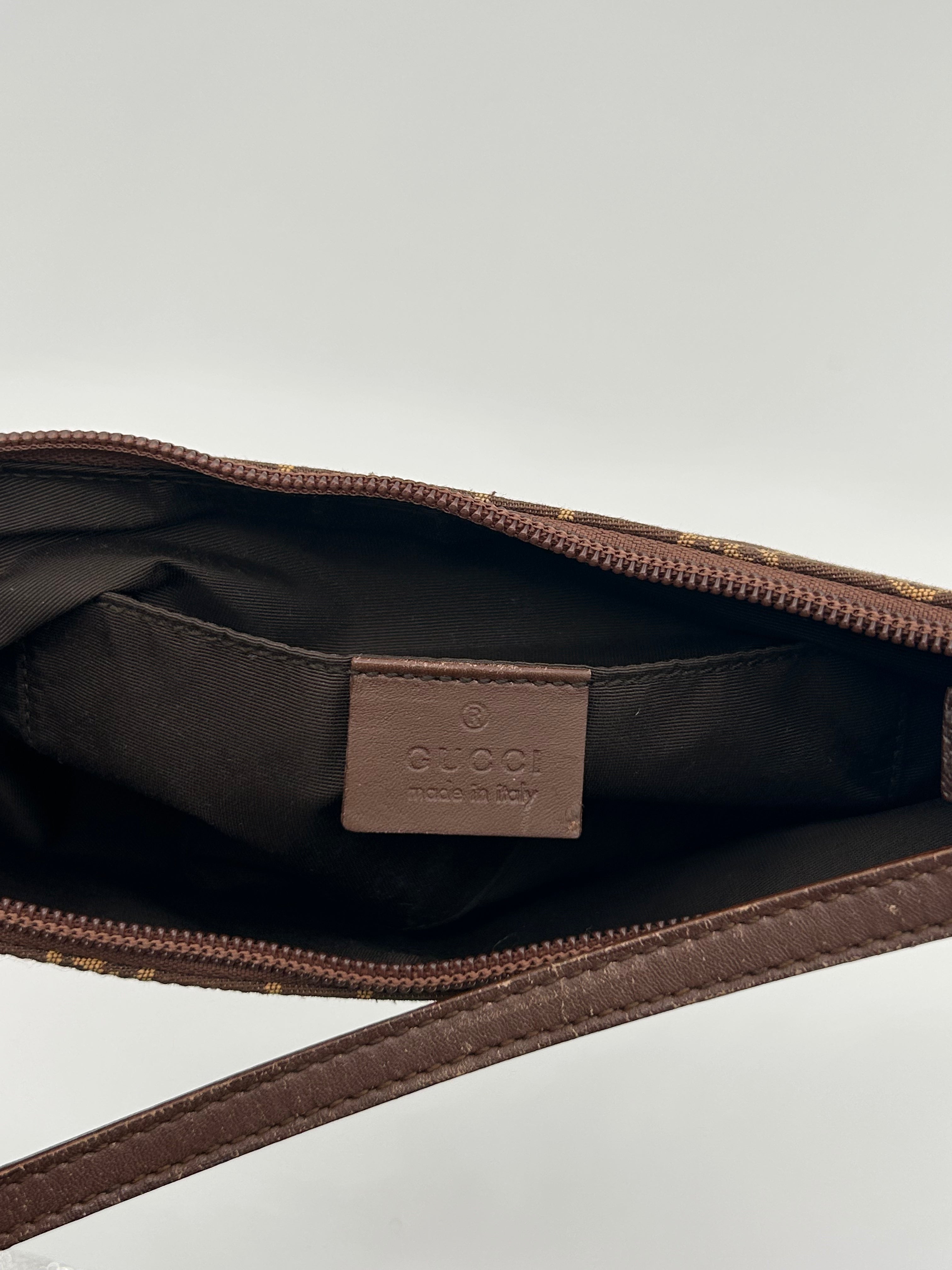 Gucci GC Canvas Baguette , waarschijnlijk geproduceerd rond 2000, met afmetingen 27 × 17 × 4 cm (width x height x depth) met nummer 0050813 001553 De tas verkeert in goede vintage staat en is zorgvuldig gecontroleerd op authenticiteit en kwaliteit.