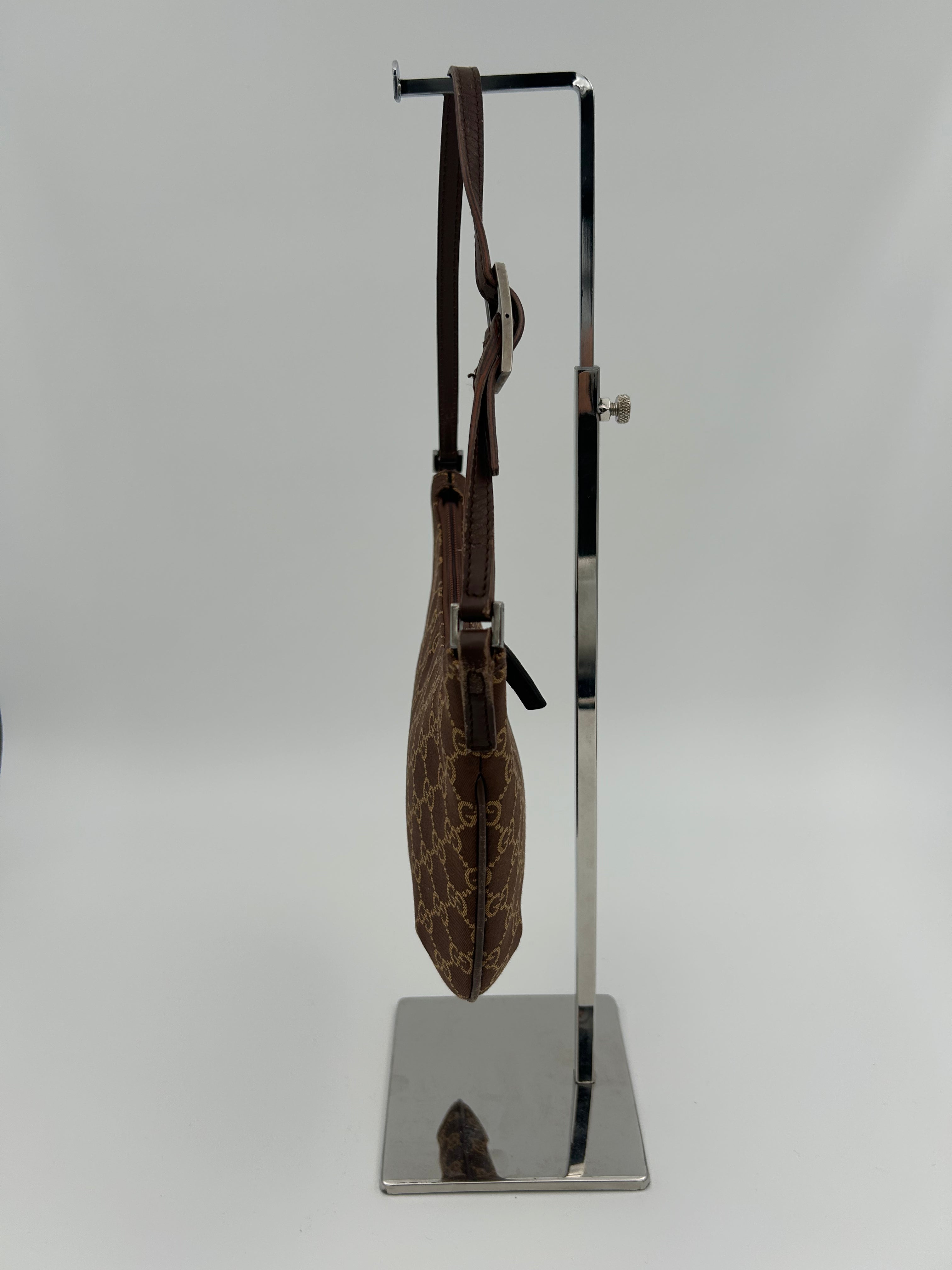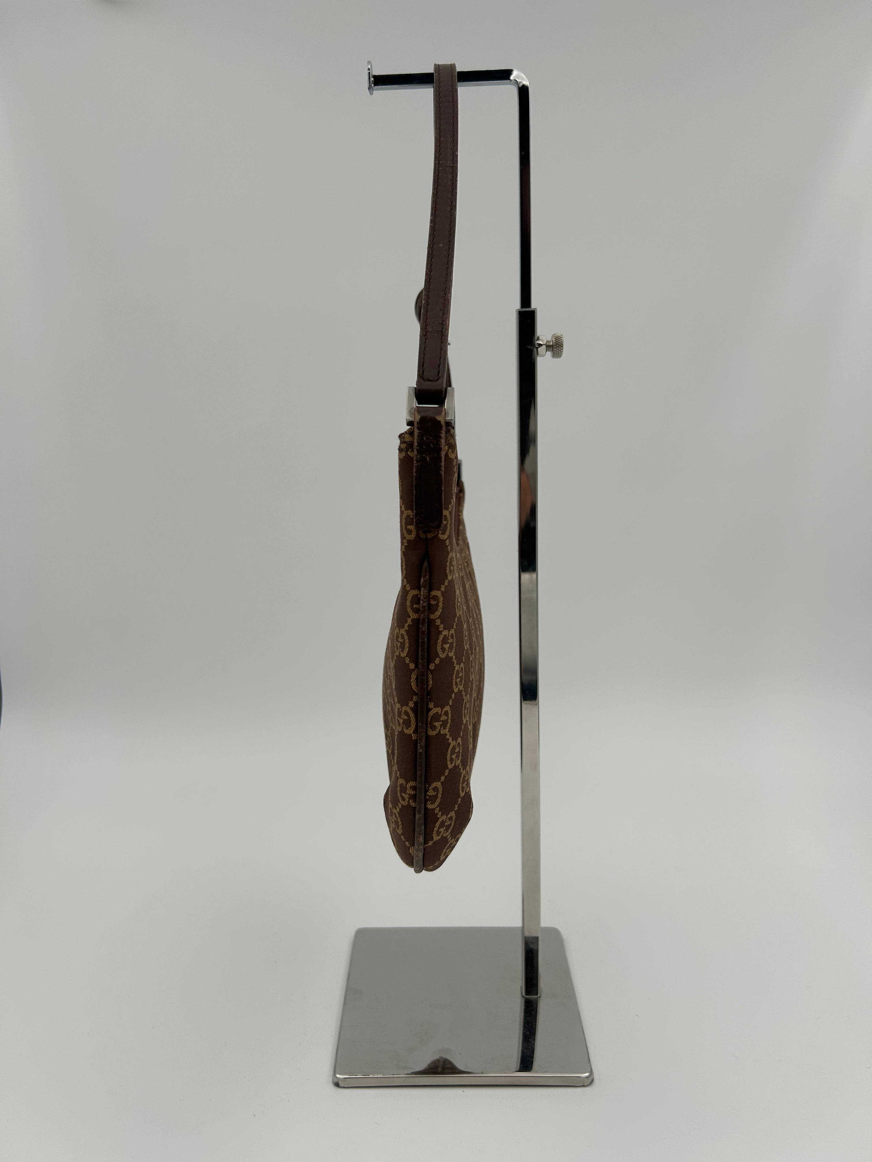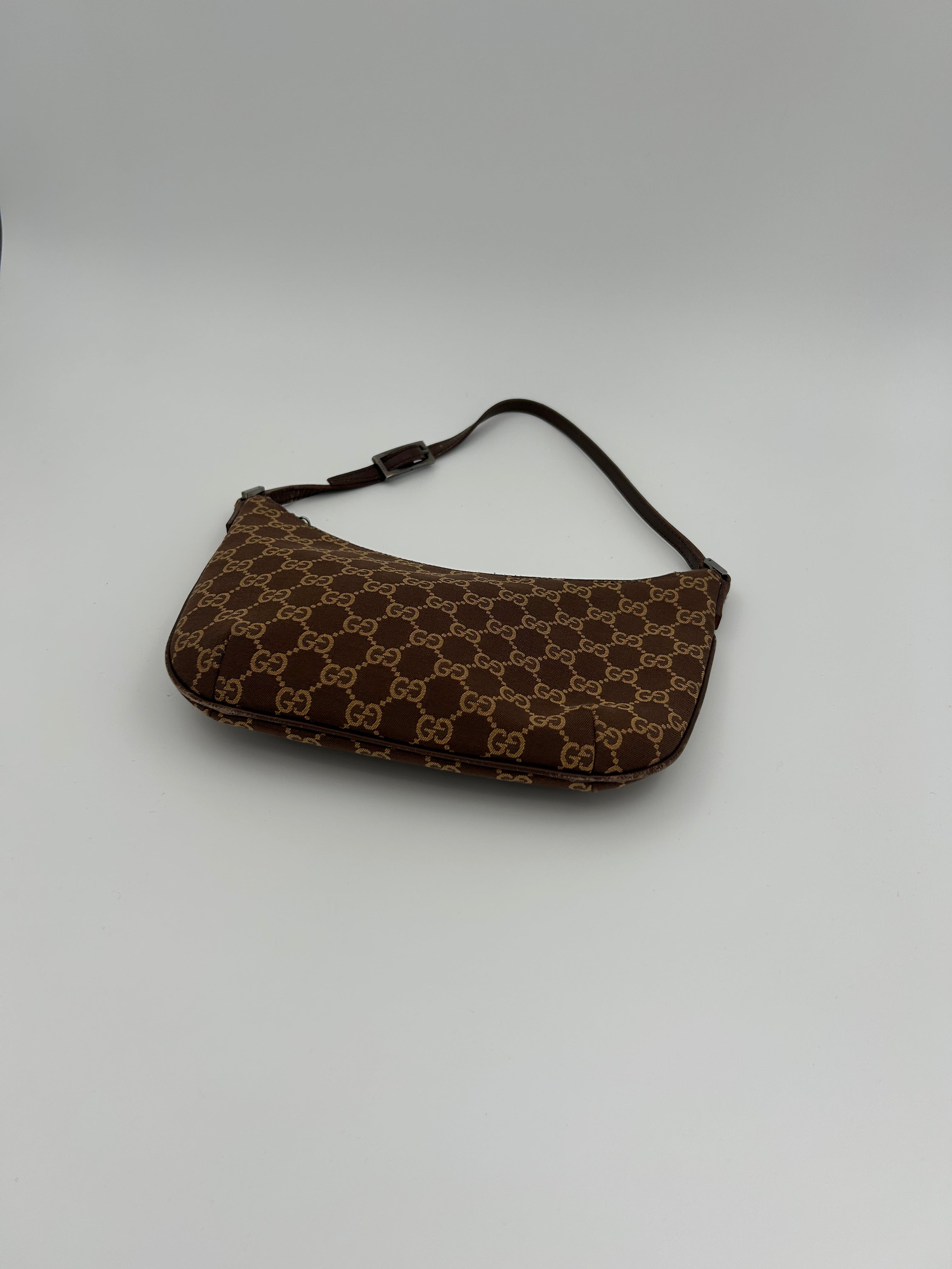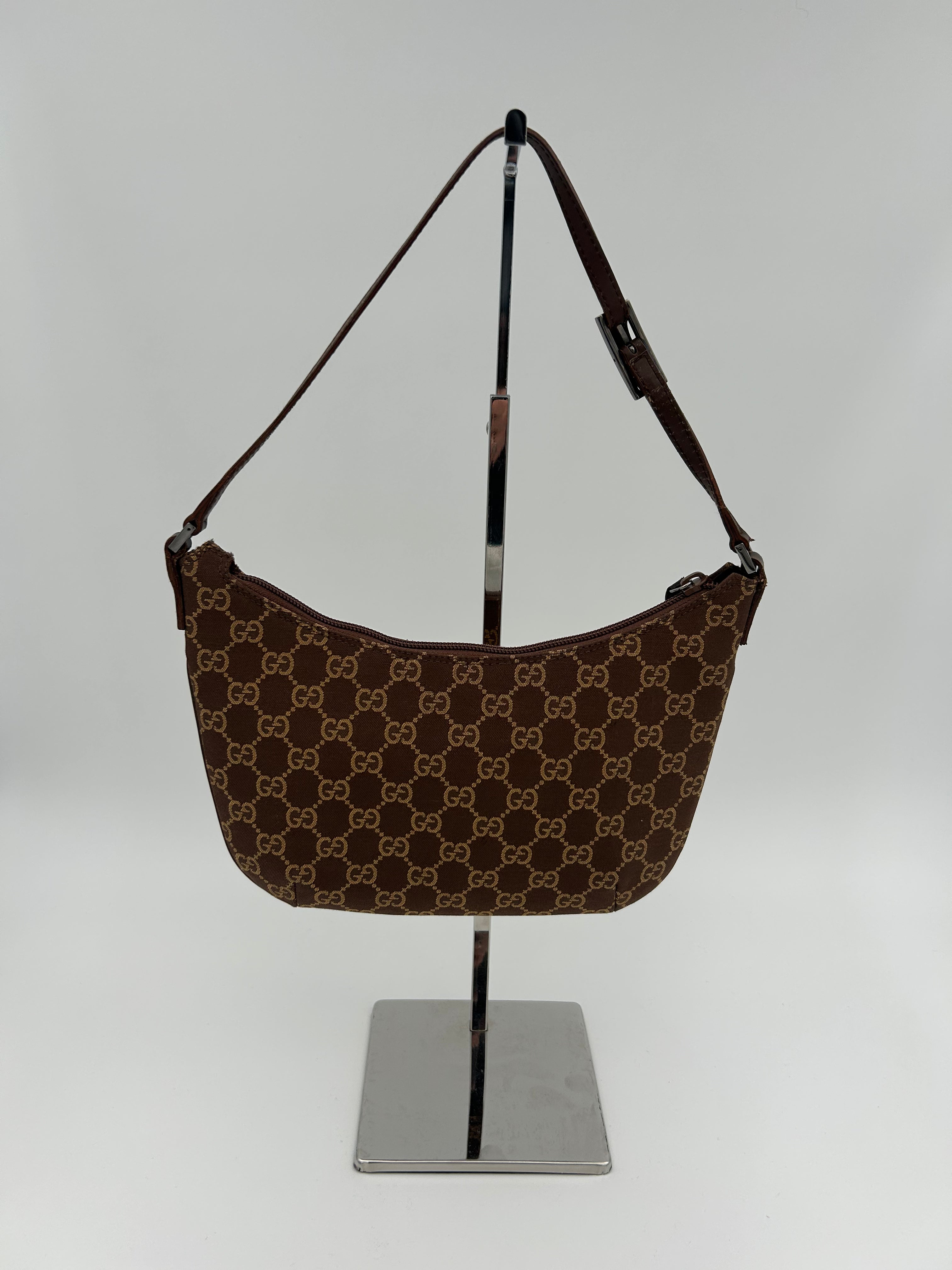 Gucci GC Canvas Baguette , waarschijnlijk geproduceerd rond 2000, met afmetingen 27 × 17 × 4 cm (width x height x depth) met nummer 0050813 001553 De tas verkeert in goede vintage staat en is zorgvuldig gecontroleerd op authenticiteit en kwaliteit.