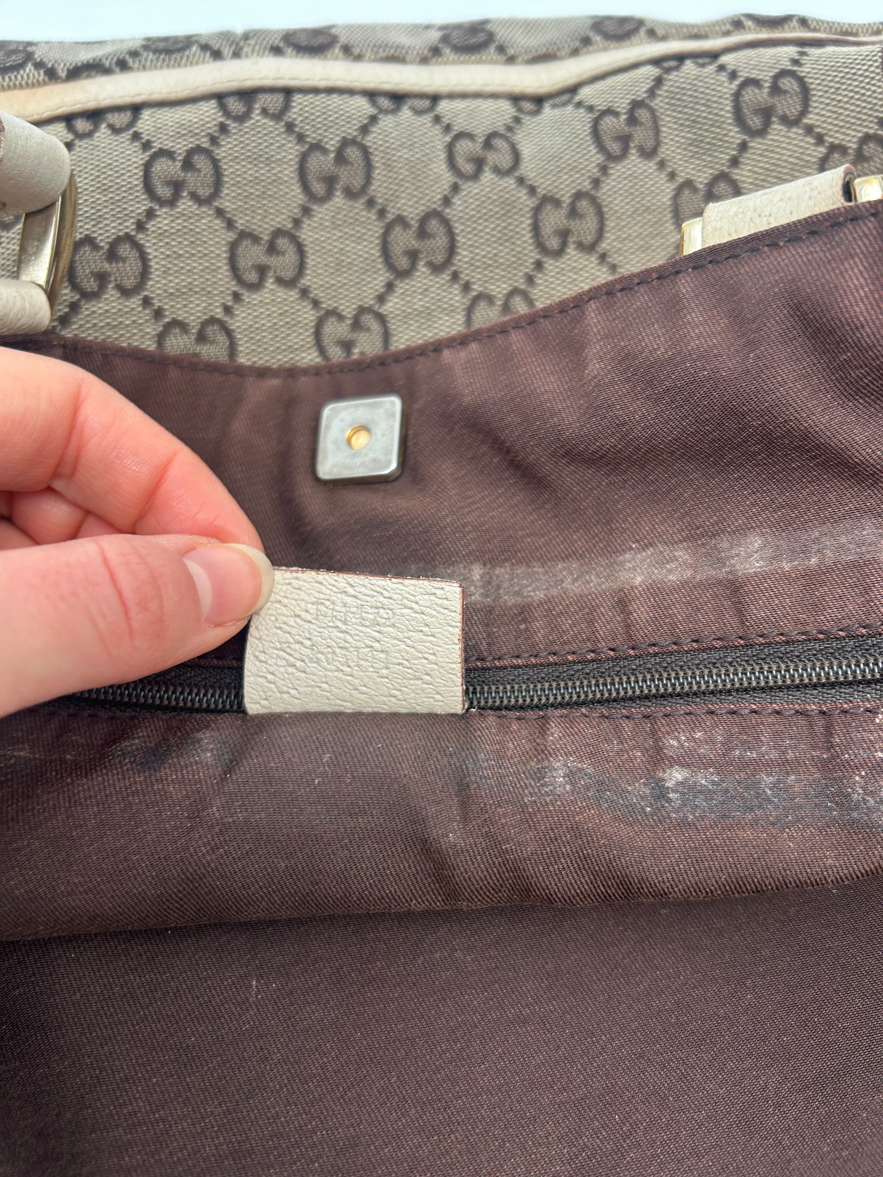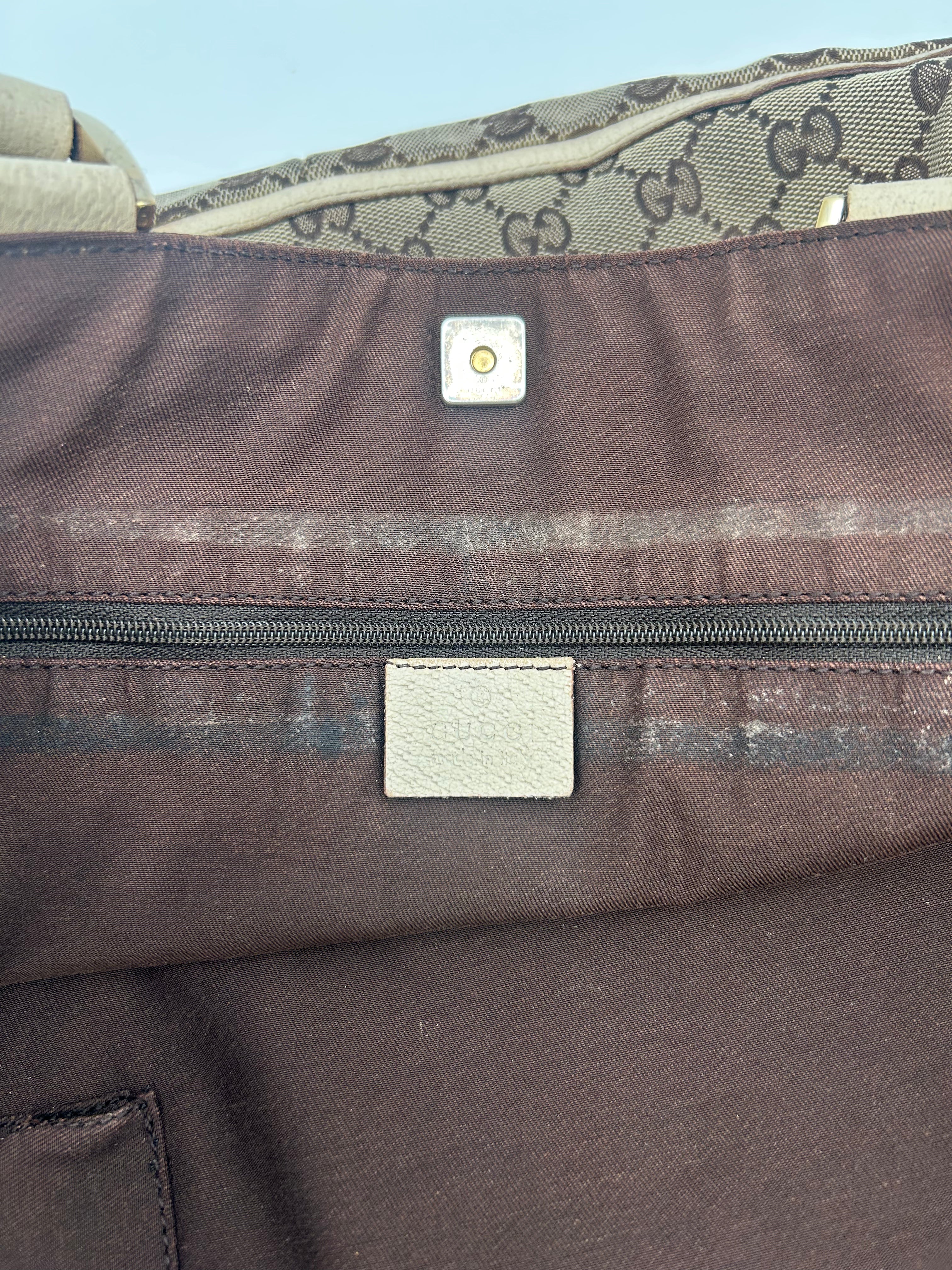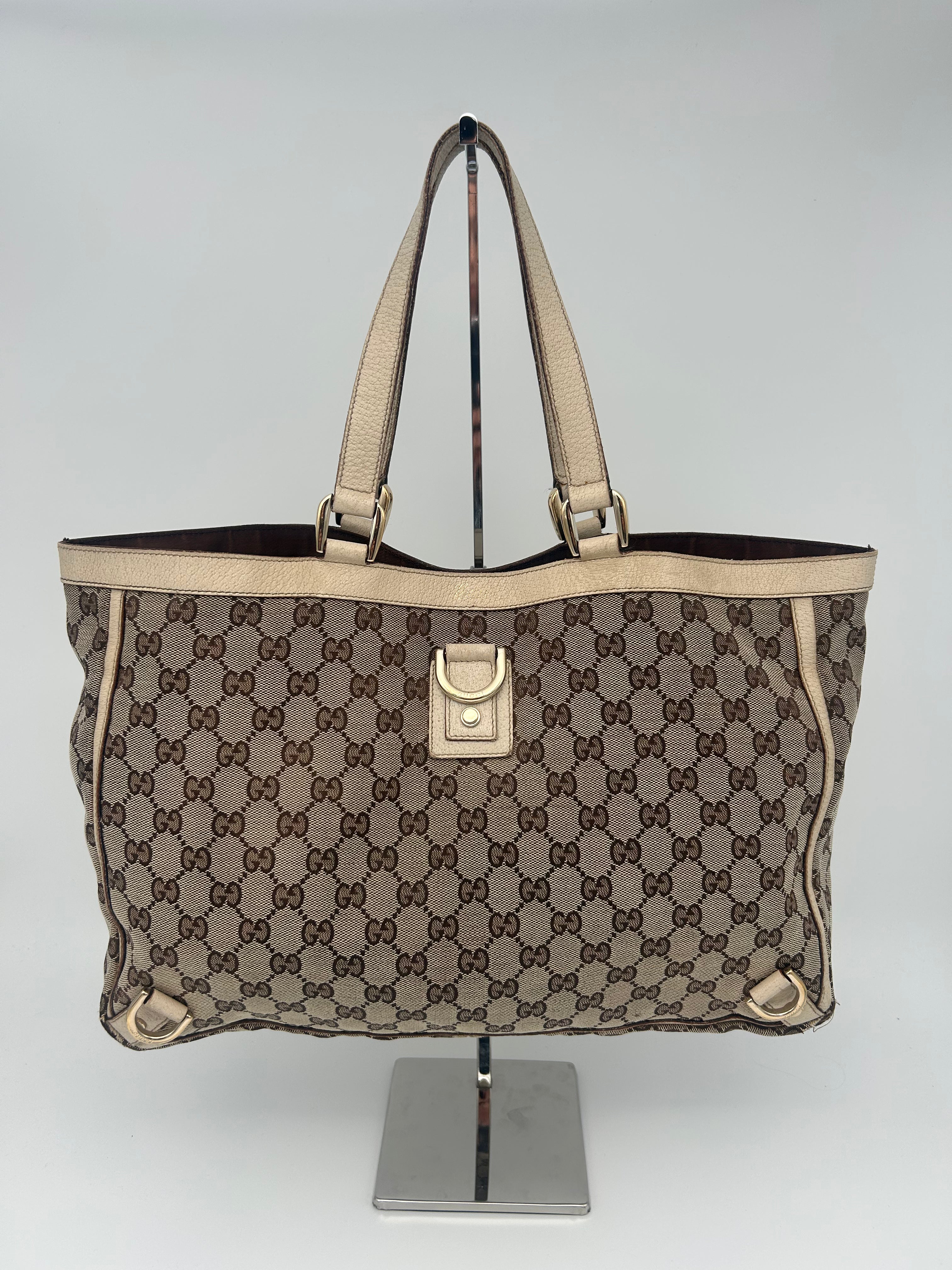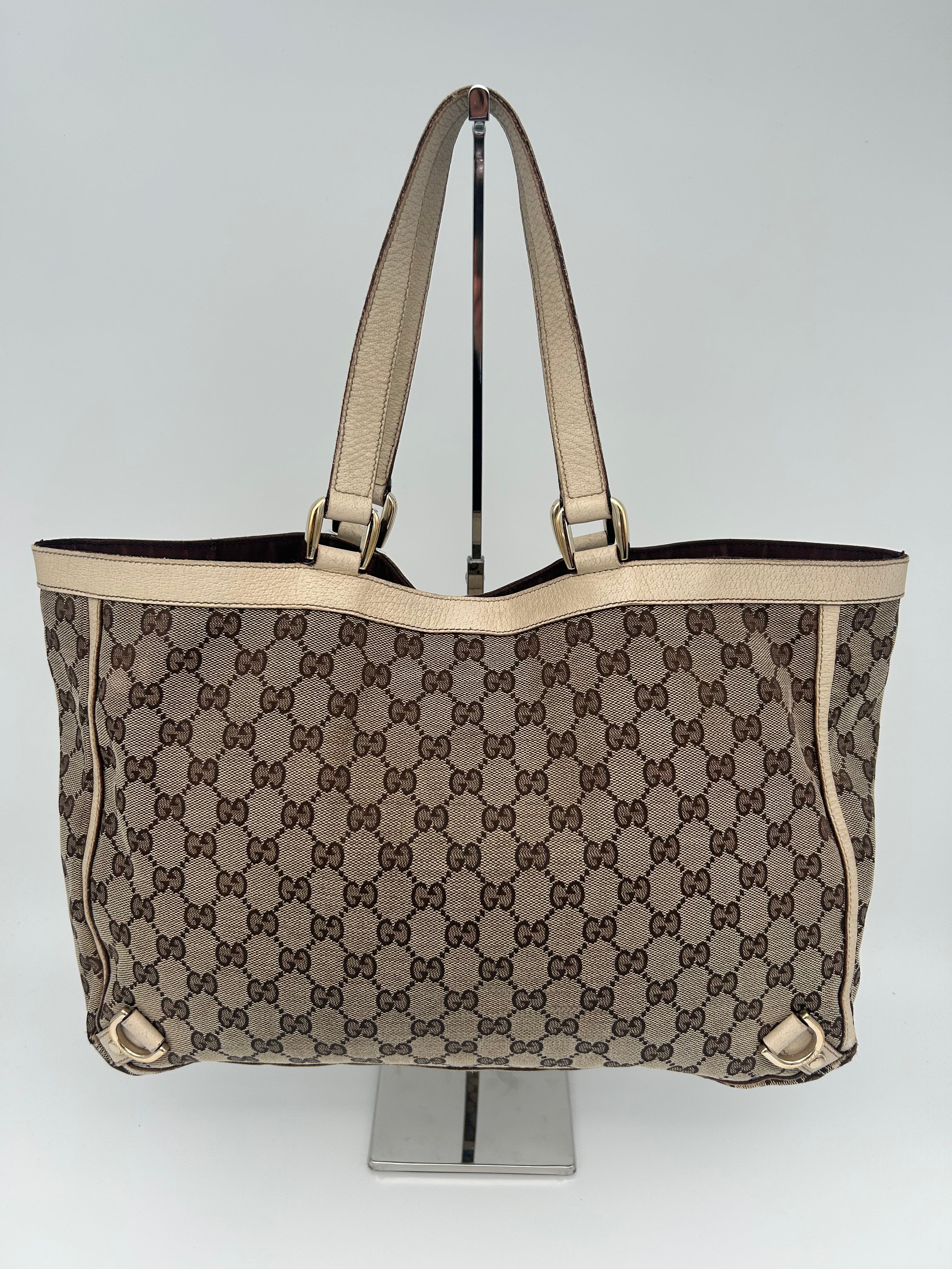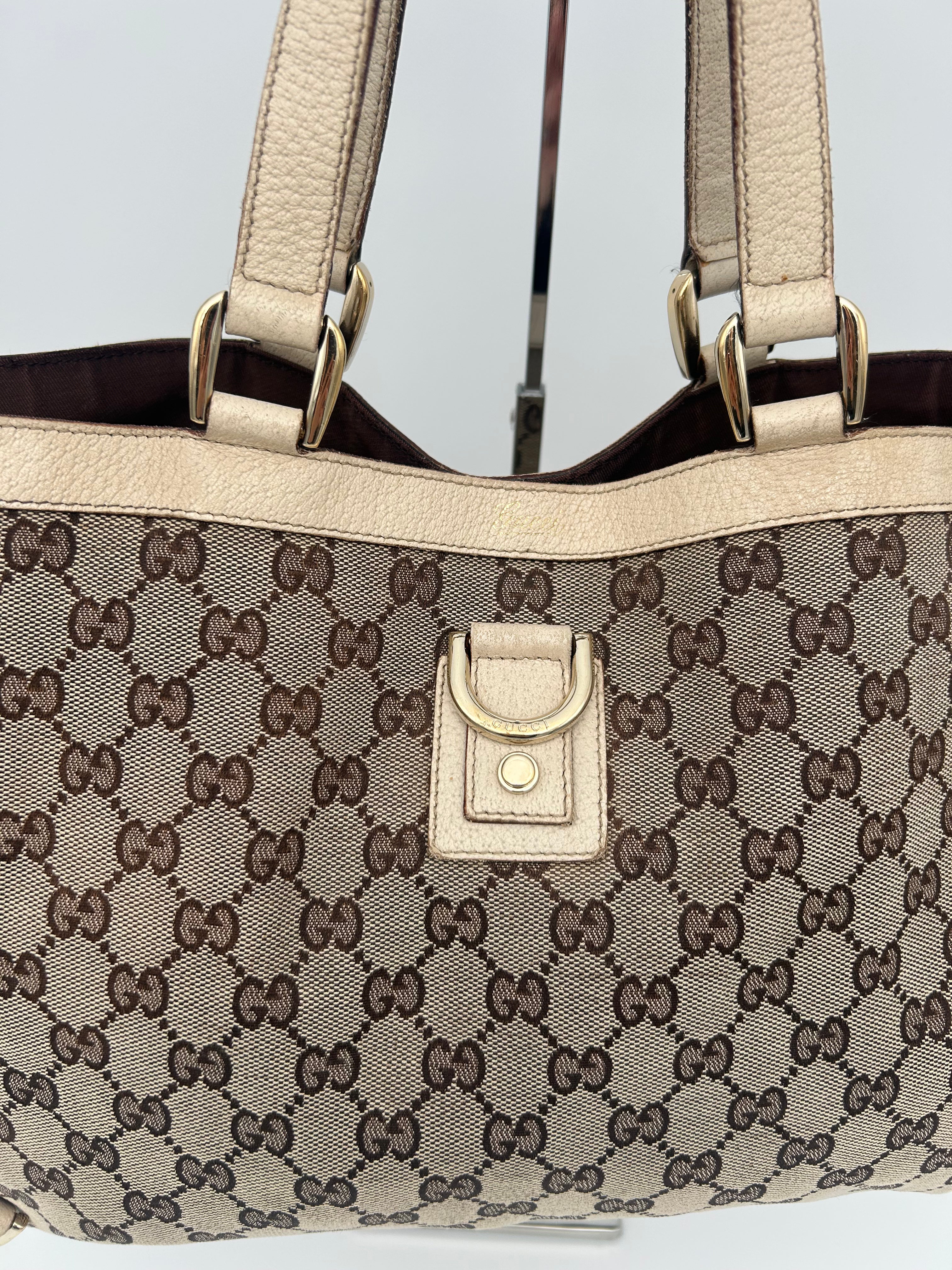 Gucci GG Canvas Abbey Tote Bag, waarschijnlijk geproduceerd tussen 2008 en 2016, met afmetingen 38 × 26 × 11 cm (width x height x depth). De tas verkeert in goede vintage staat en is zorgvuldig gecontroleerd op authenticiteit en kwaliteit.