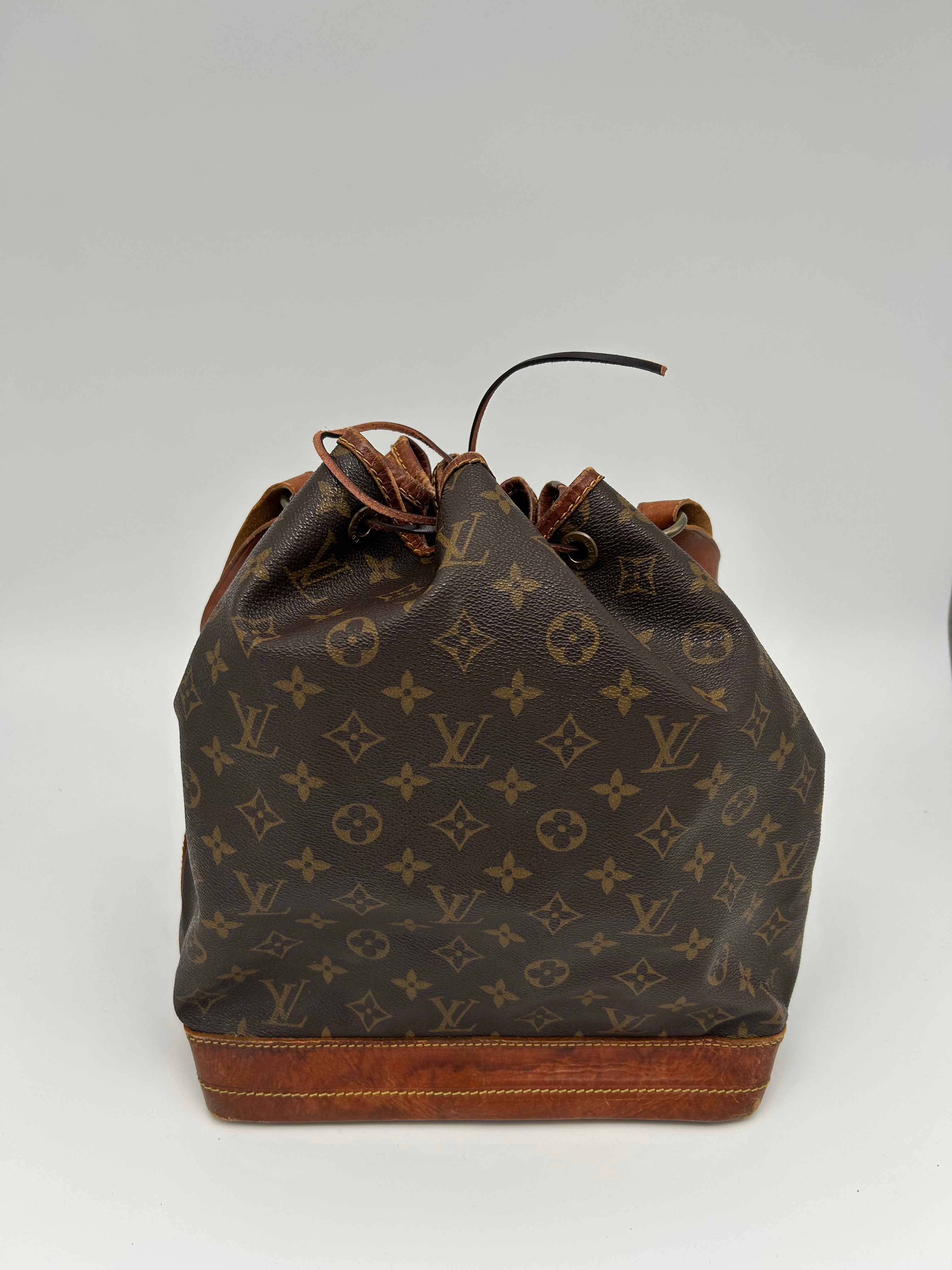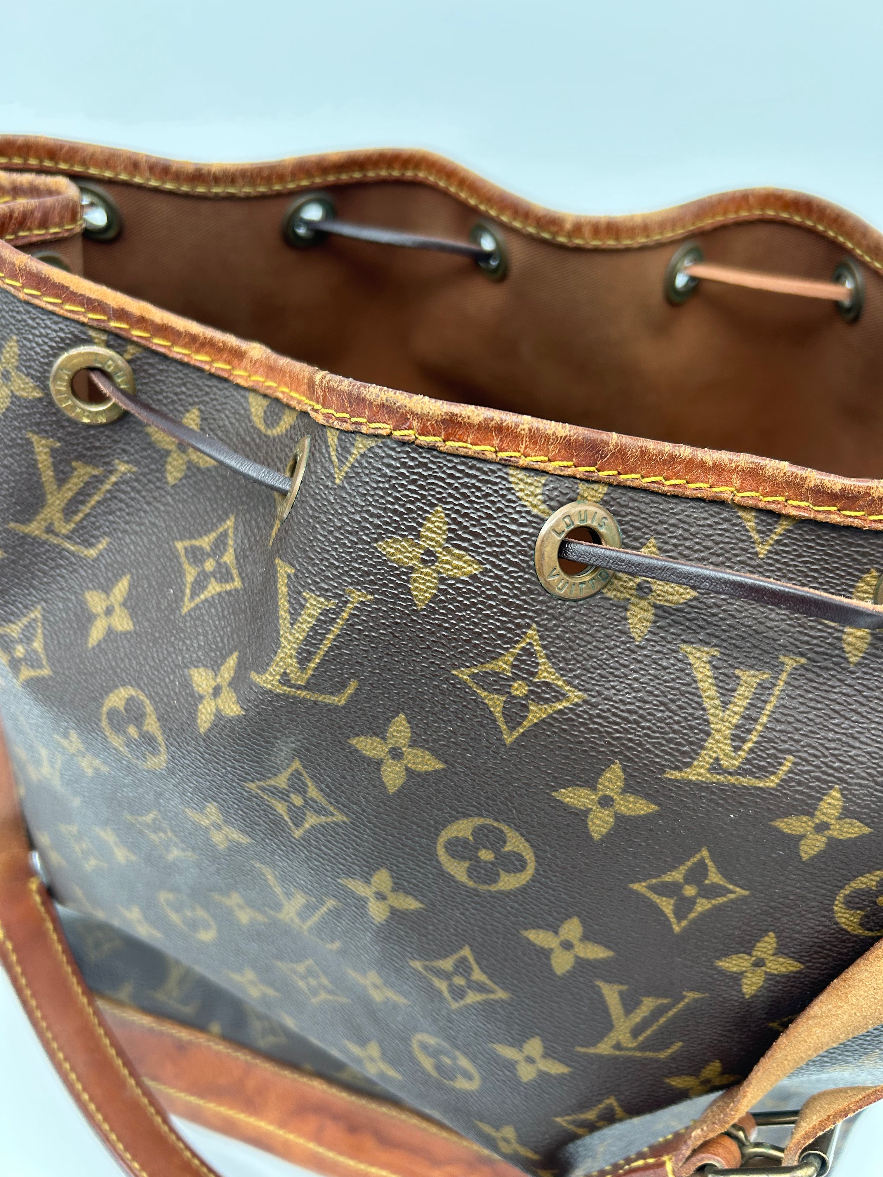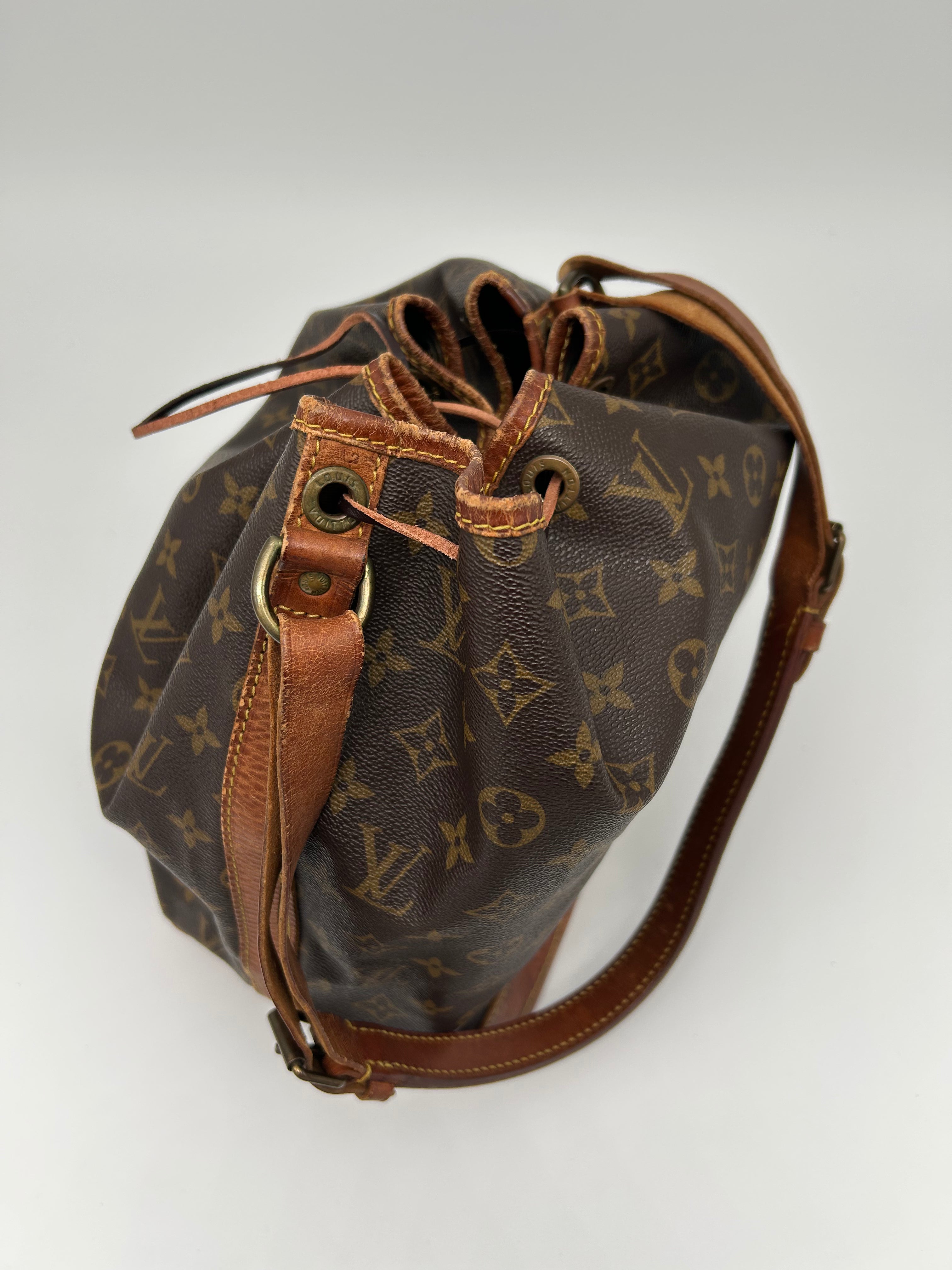 Louis Vuitton Petit Noé, geproduceerd in 1990, met afmetingen 25 x 27 x 18 cm (width x height x depth). De tas verkeert in goede vintage staat en is zorgvuldig gecontroleerd op authenticiteit en kwaliteit.
