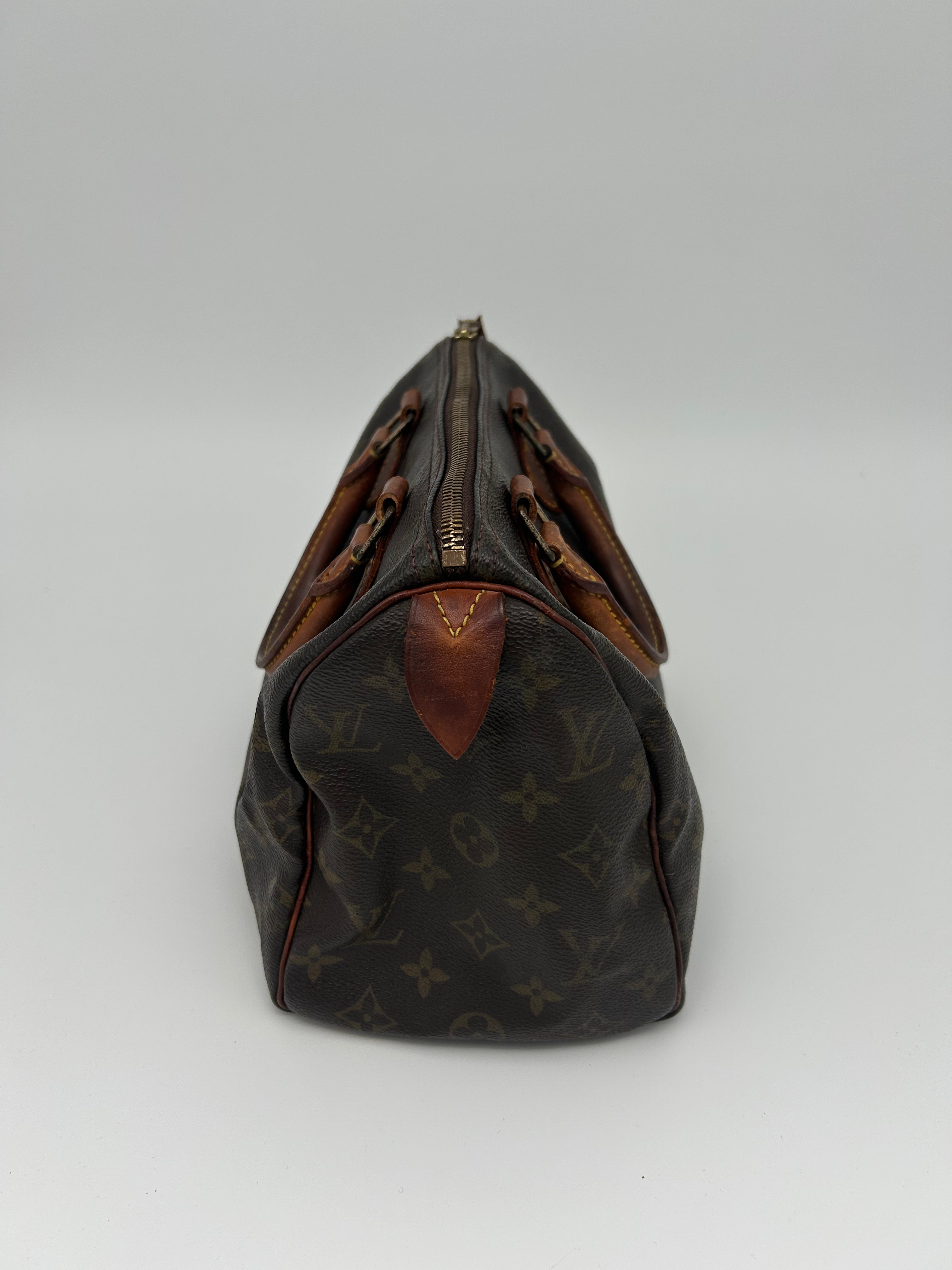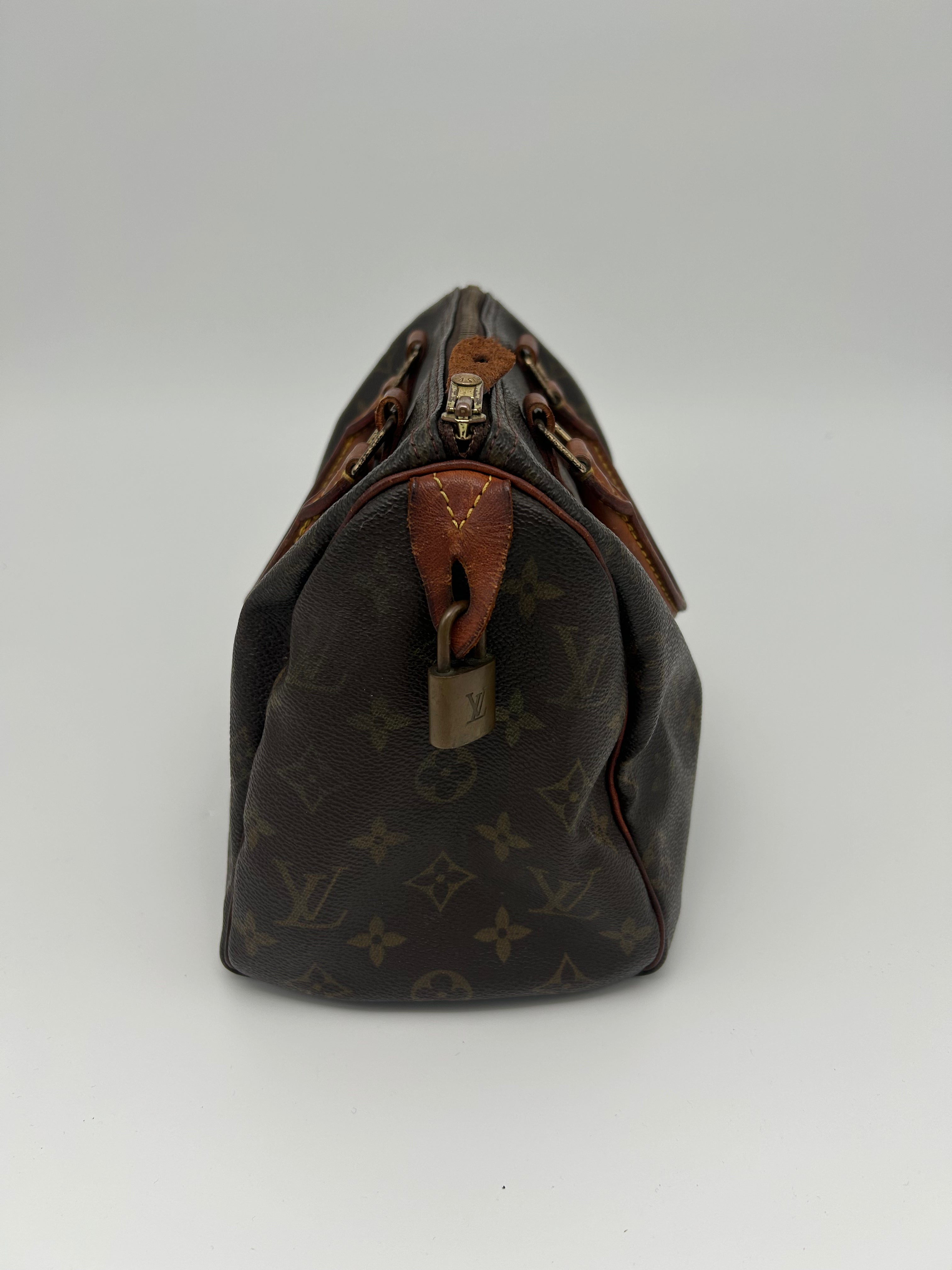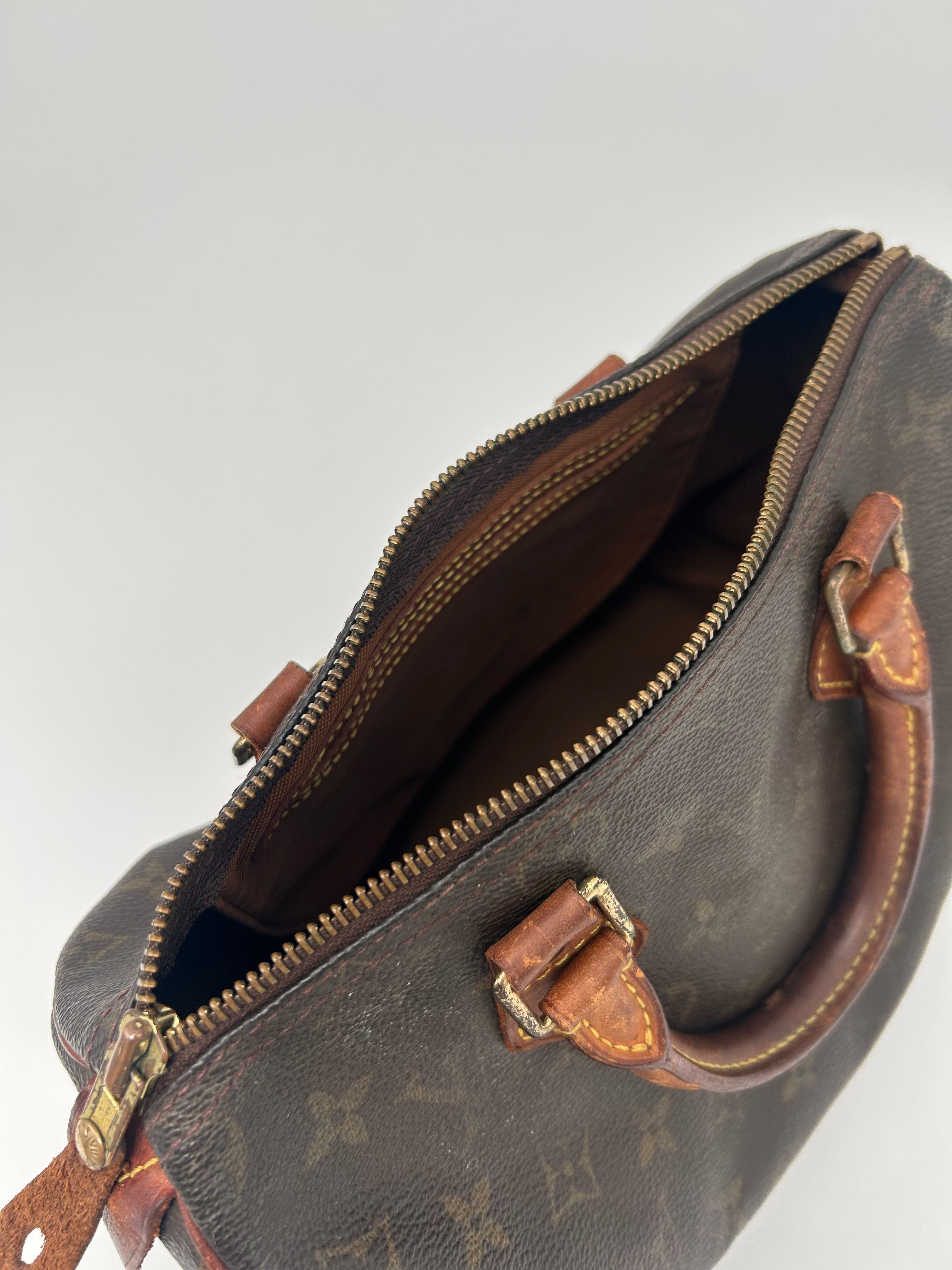 Louis Vuitton Speedy 25, geproduceerd in 2000, met afmetingen 25 x 19 x 15 cm (width x height x depth) en code SP0050. De tas verkeert in goede vintage staat en is zorgvuldig gecontroleerd op authenticiteit en kwaliteit.