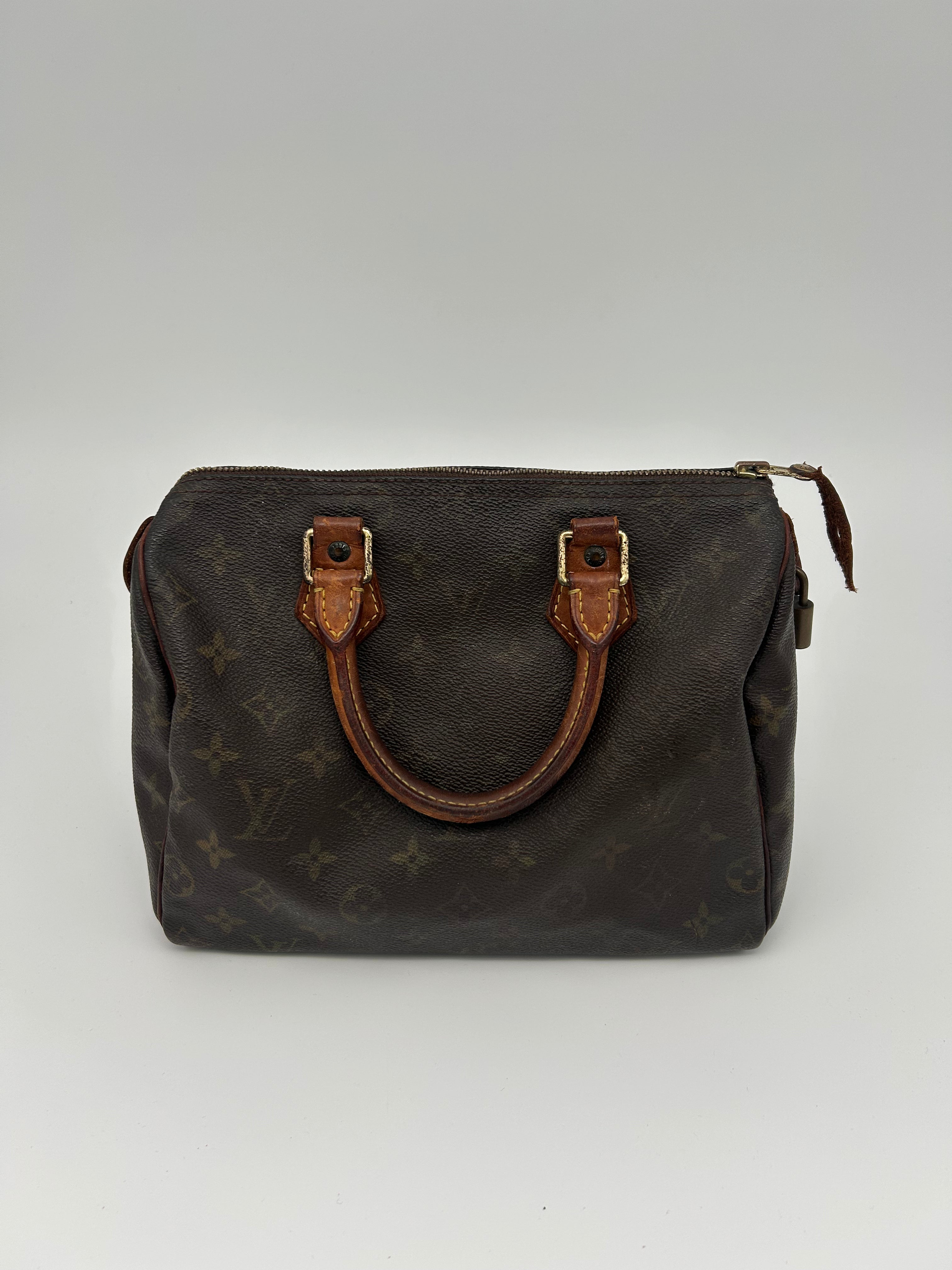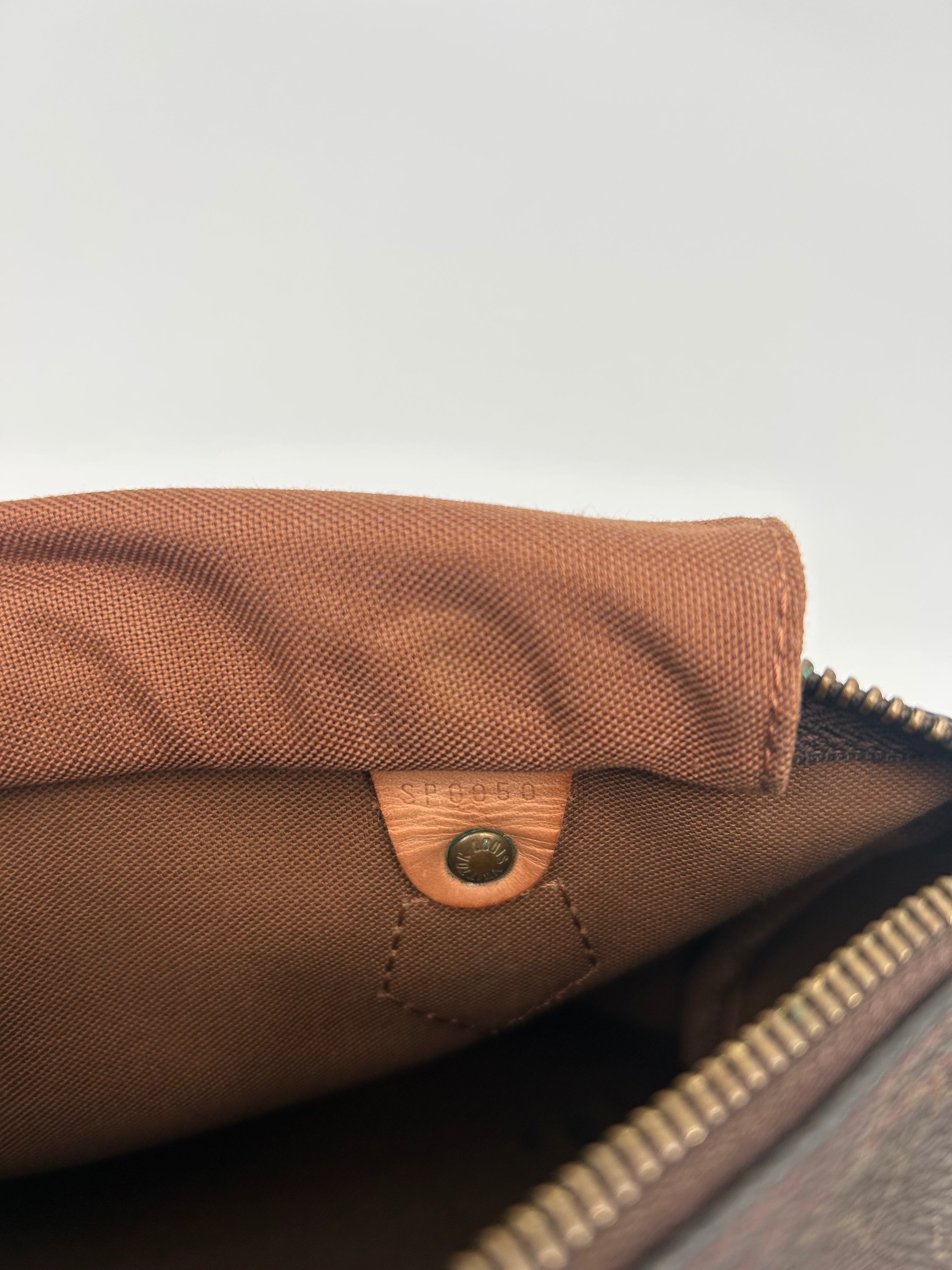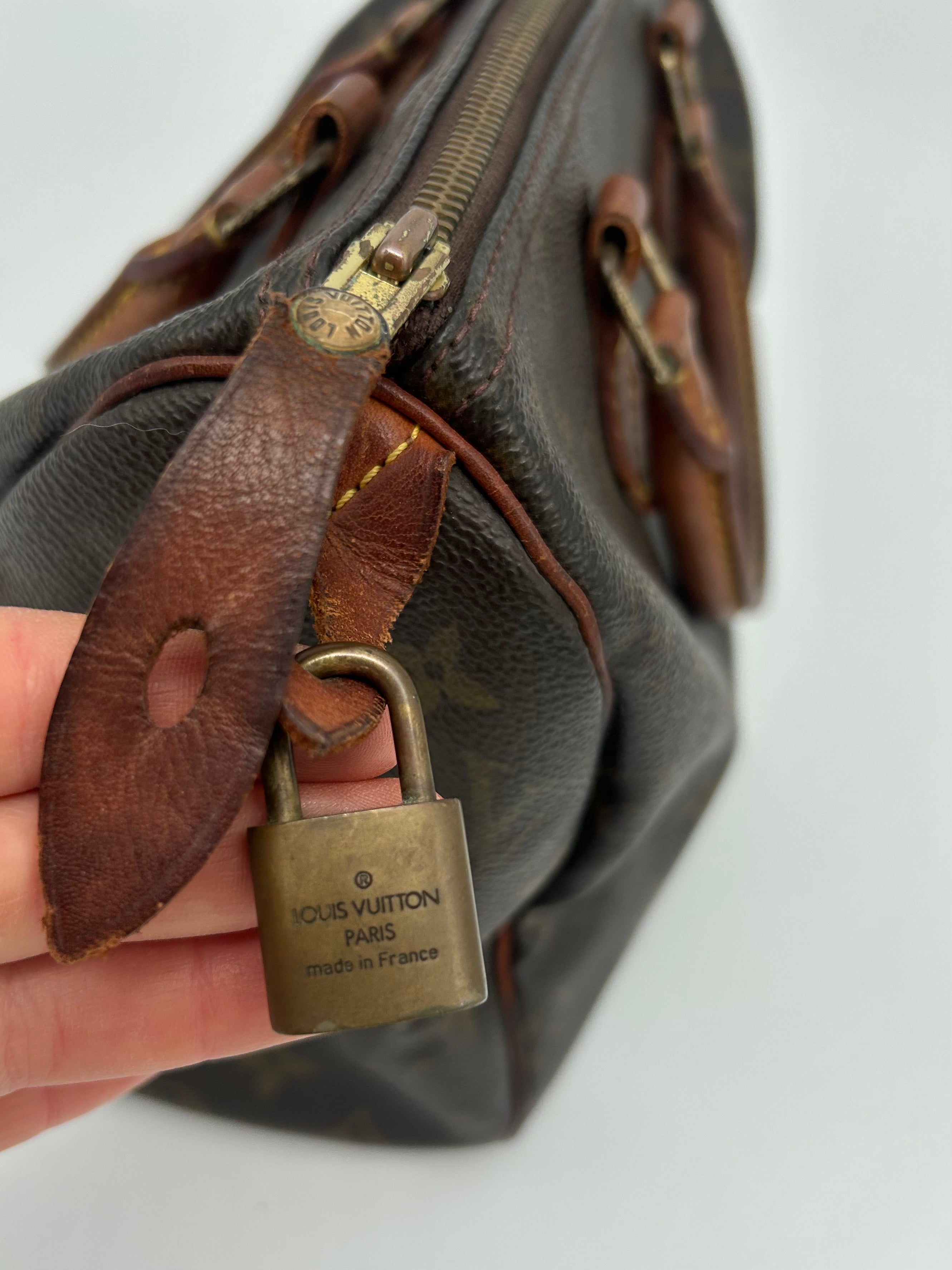 Louis Vuitton Speedy 25, geproduceerd in 2000, met afmetingen 25 x 19 x 15 cm (width x height x depth) en code SP0050. De tas verkeert in goede vintage staat en is zorgvuldig gecontroleerd op authenticiteit en kwaliteit.