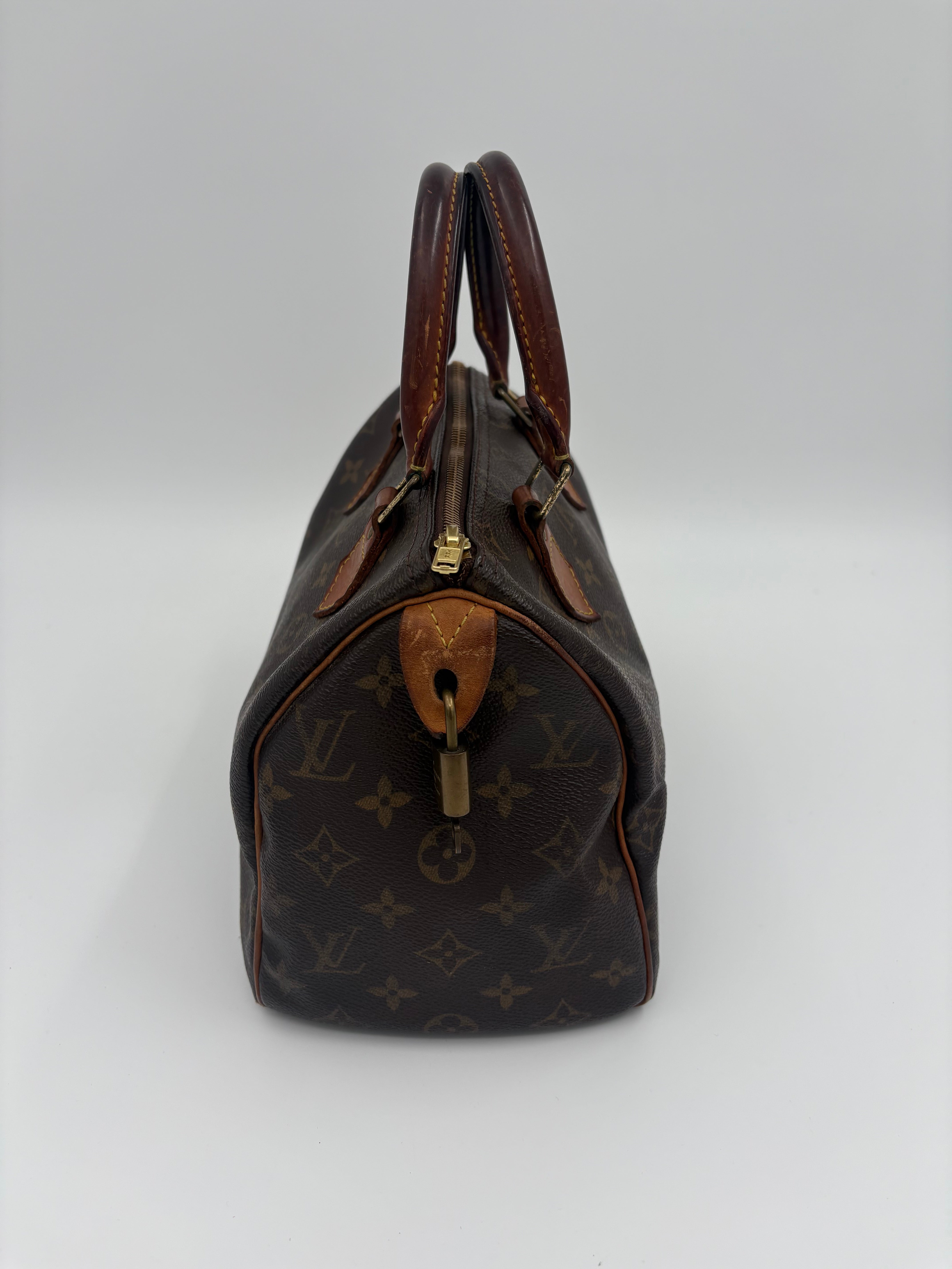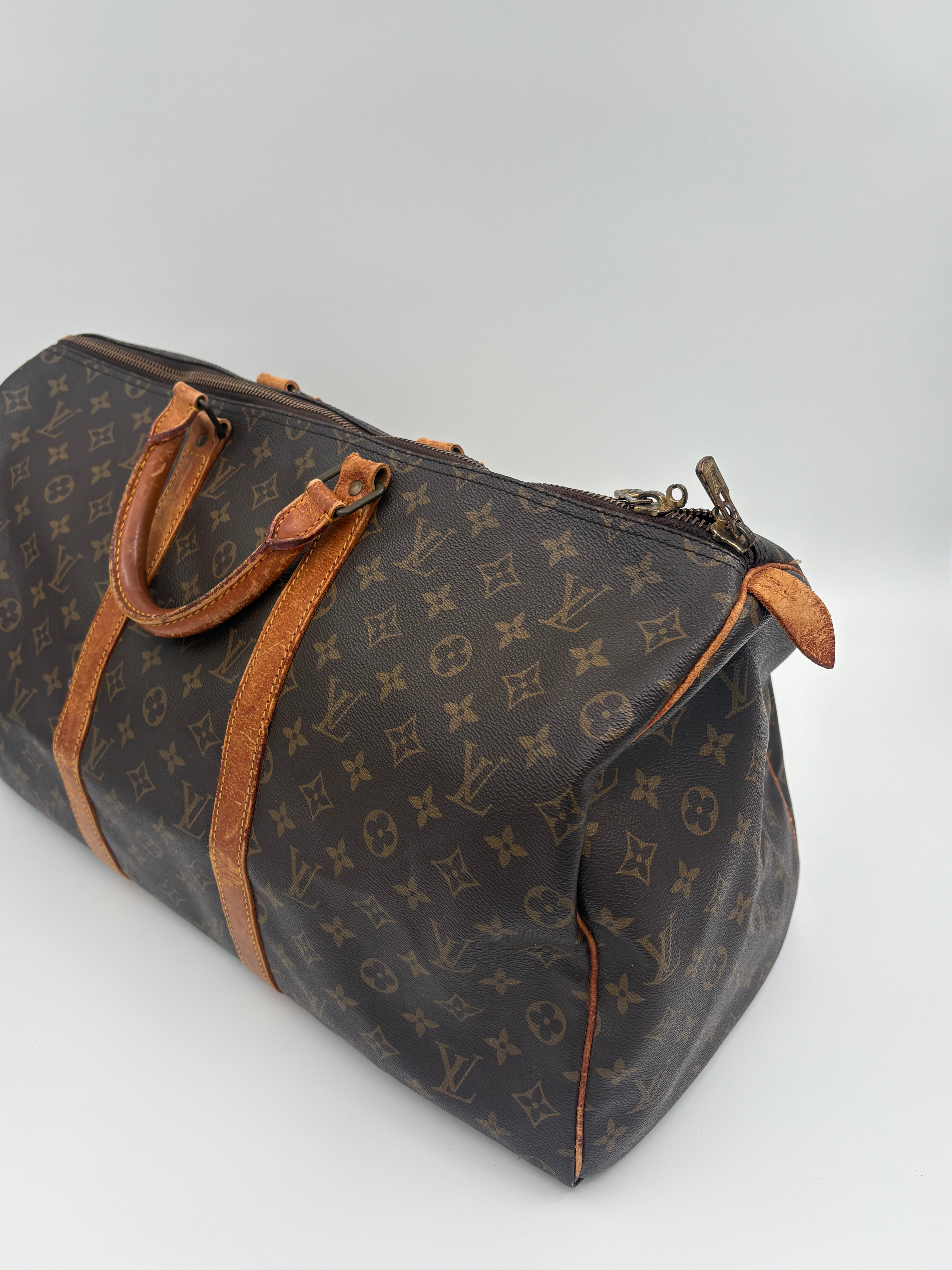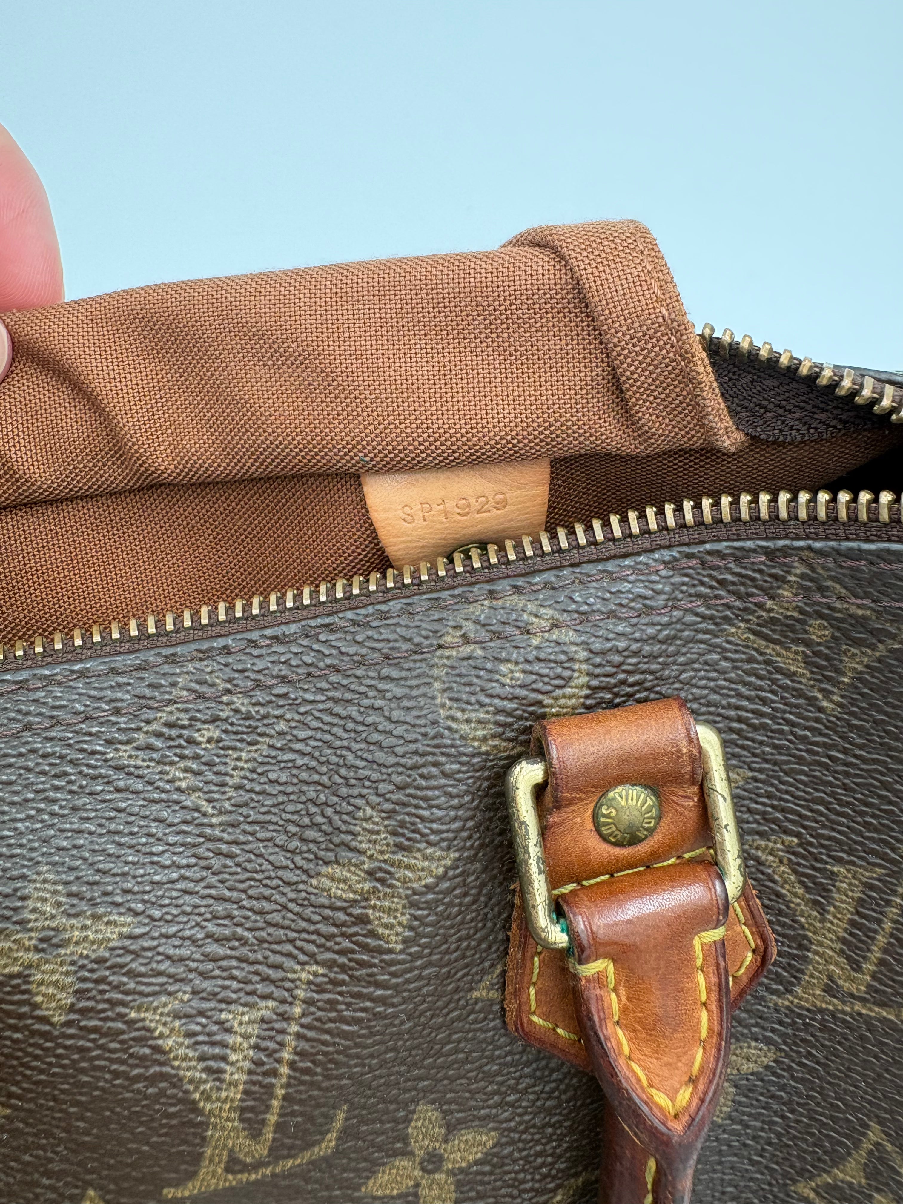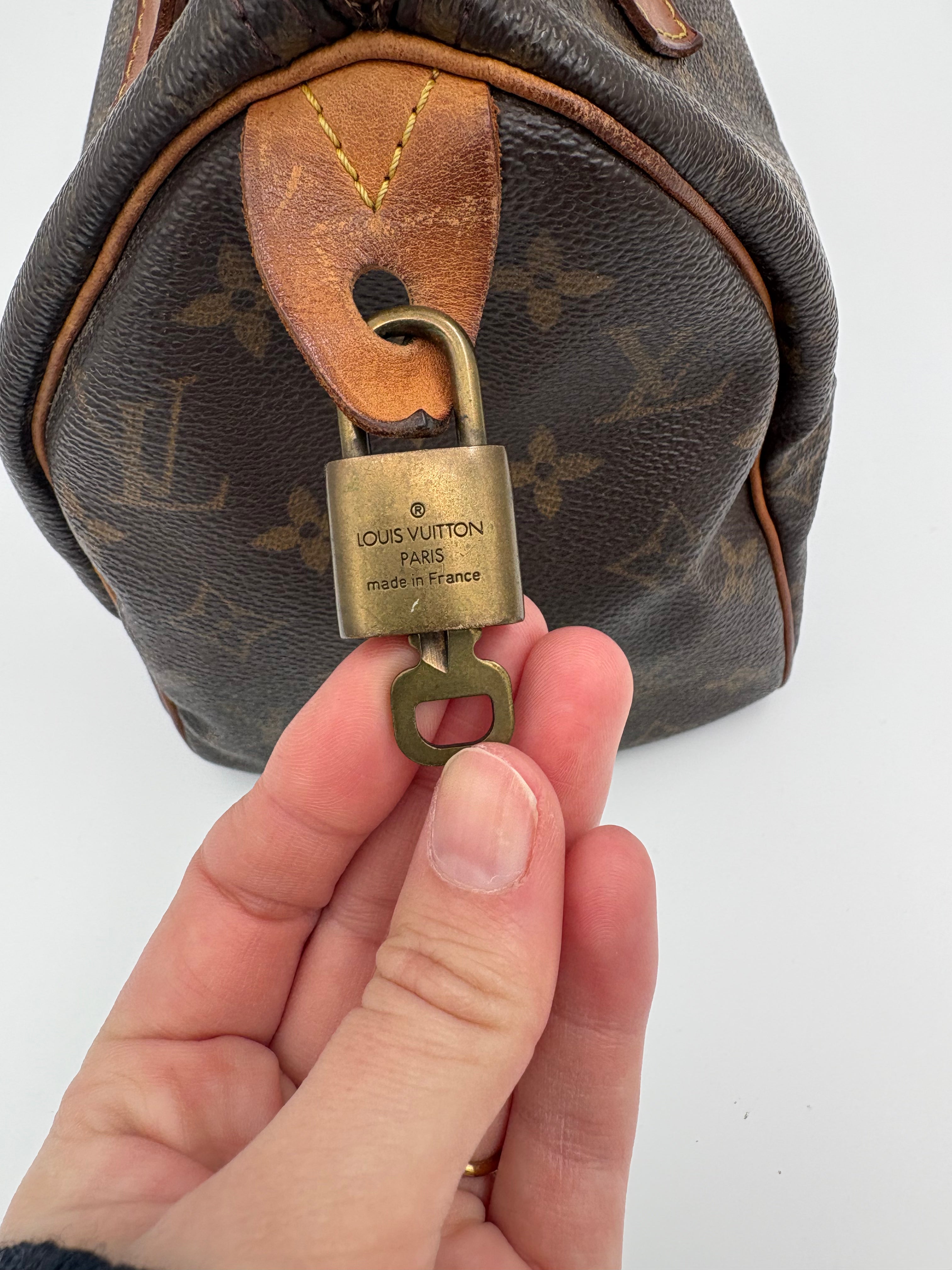 Conditie details: Handvaten zijn over de jaren heen donkerder gekleurd, rits is niet meer origineel. Tas komt inclusief sleutel + slotje