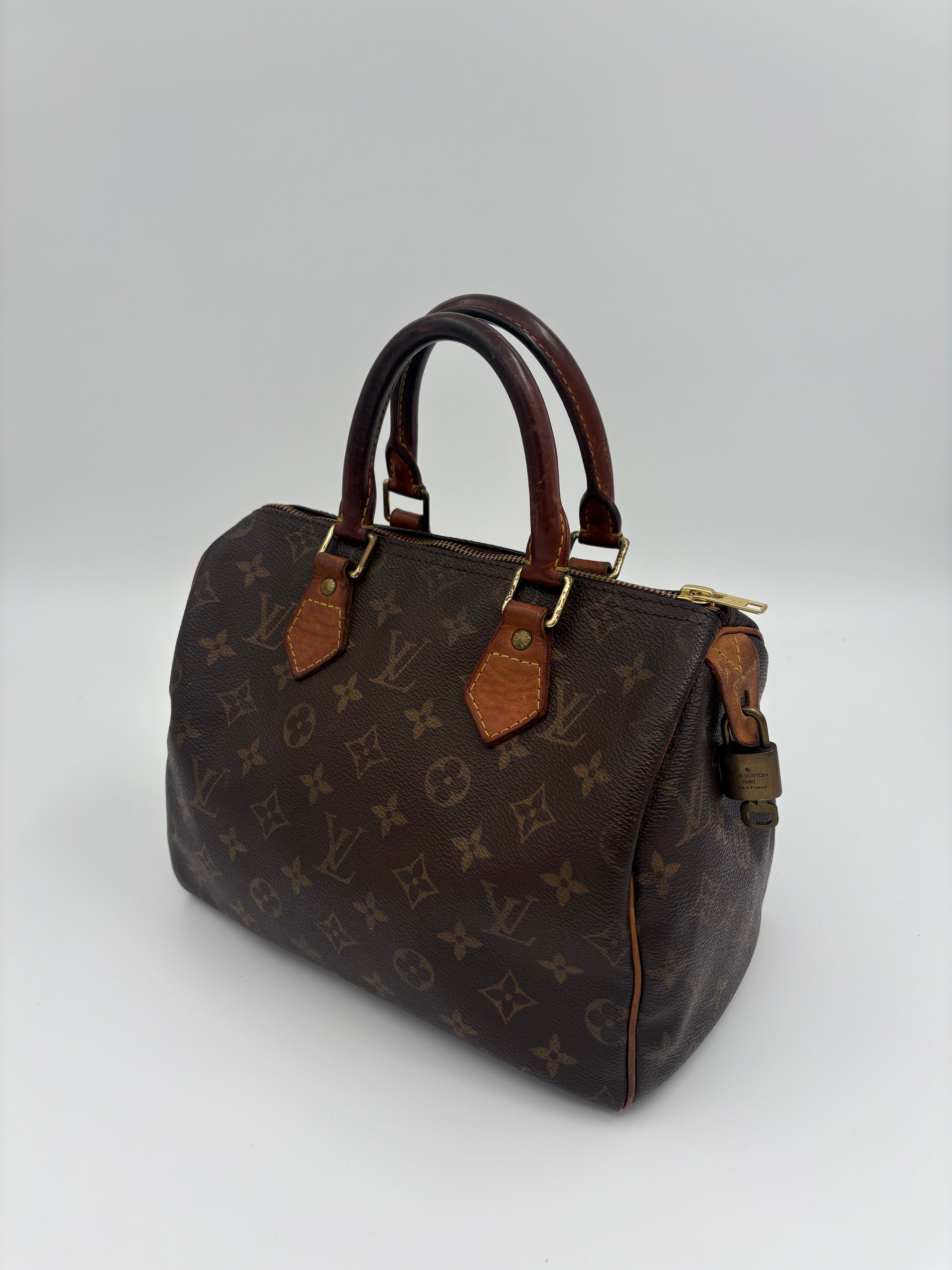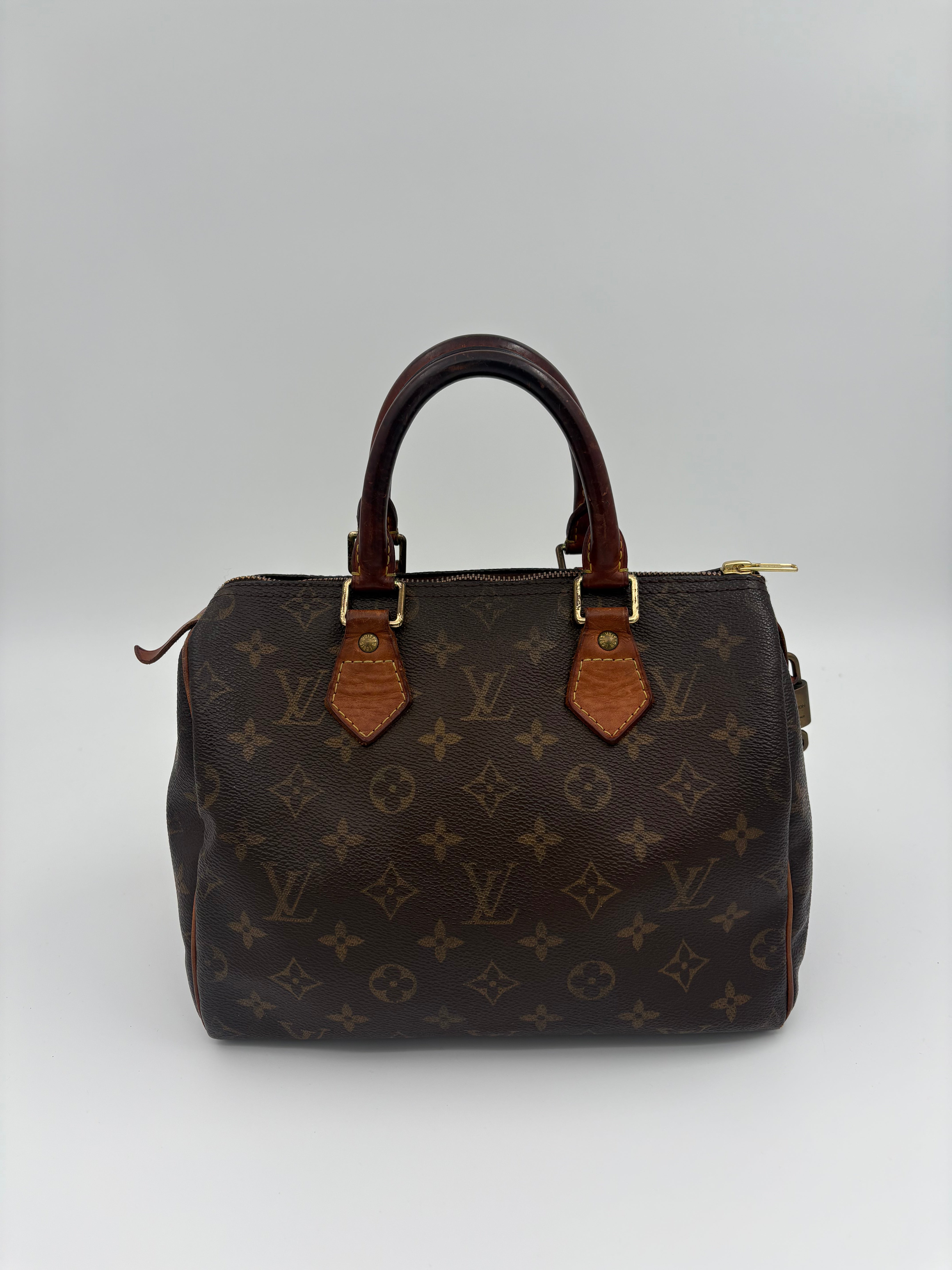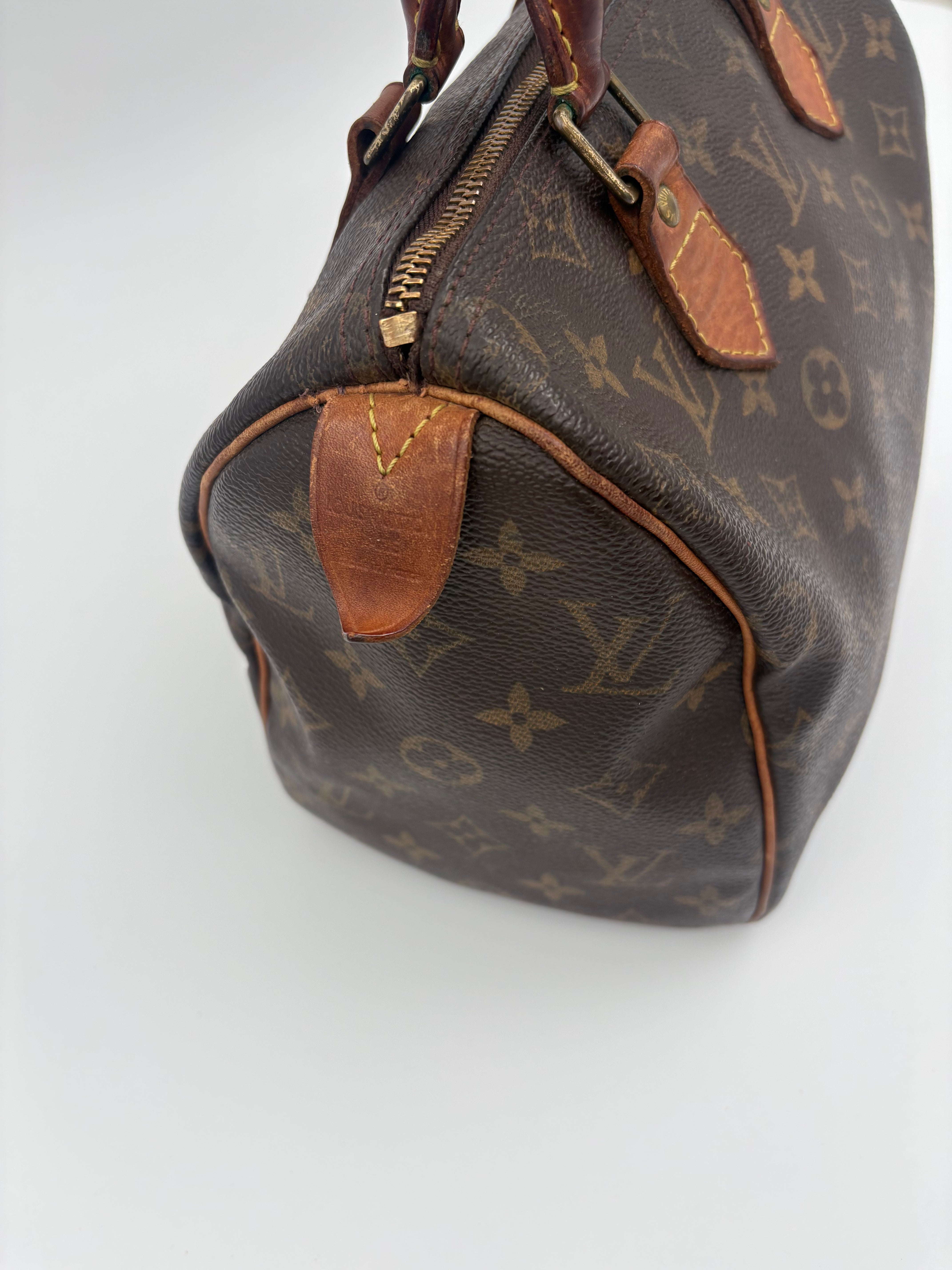 Conditie details: Handvaten zijn over de jaren heen donkerder gekleurd, rits is niet meer origineel. Tas komt inclusief sleutel + slotje