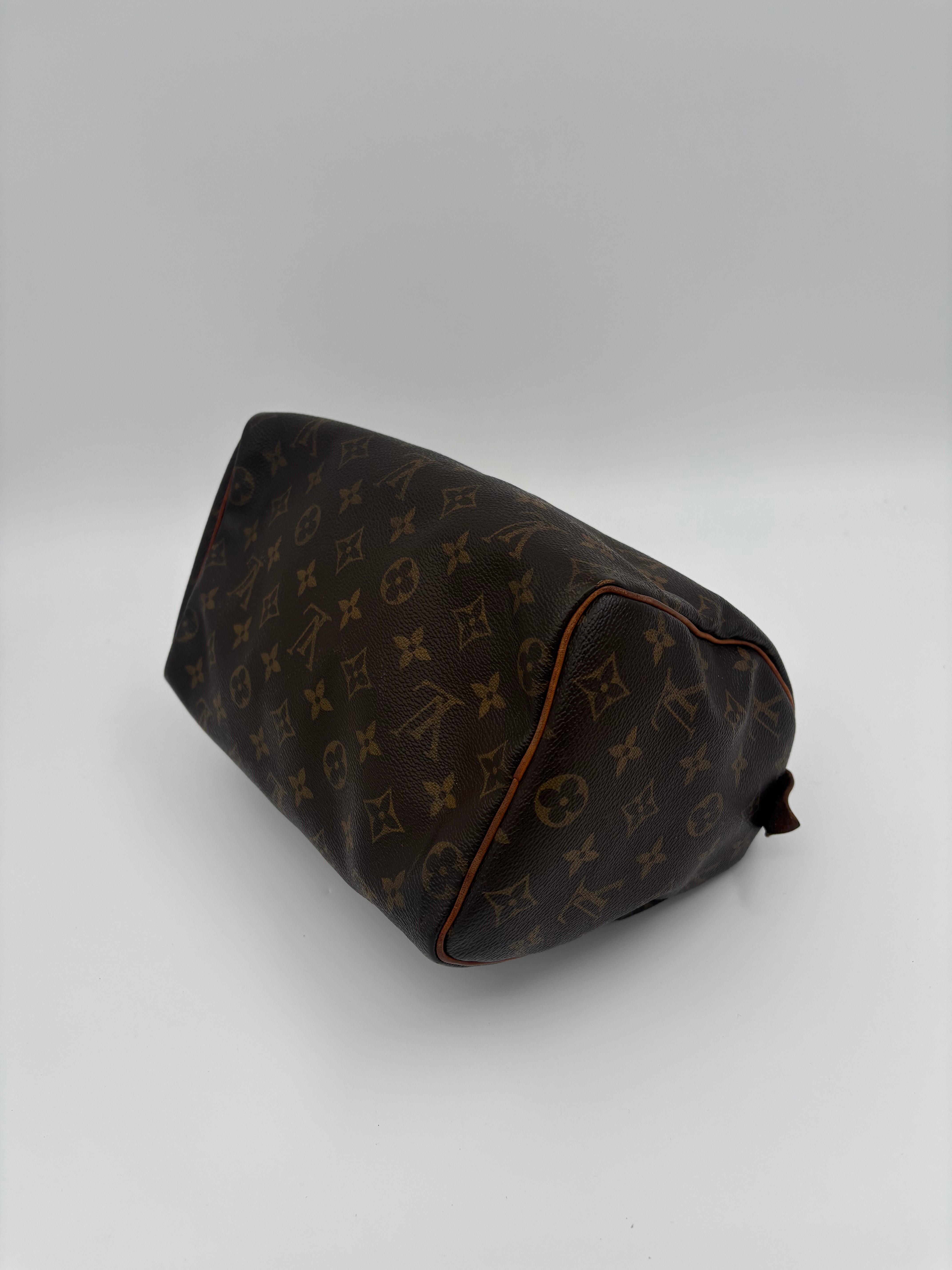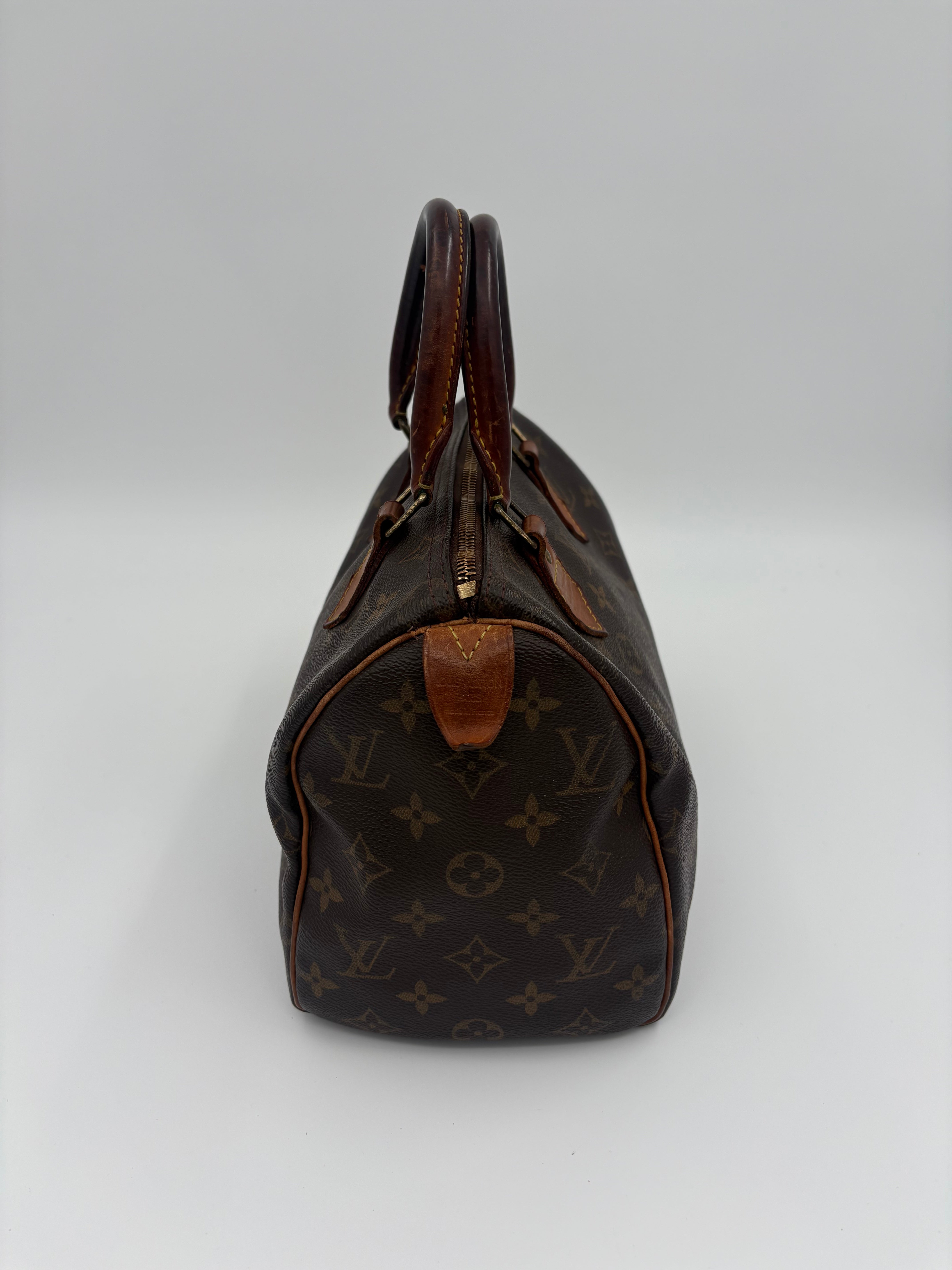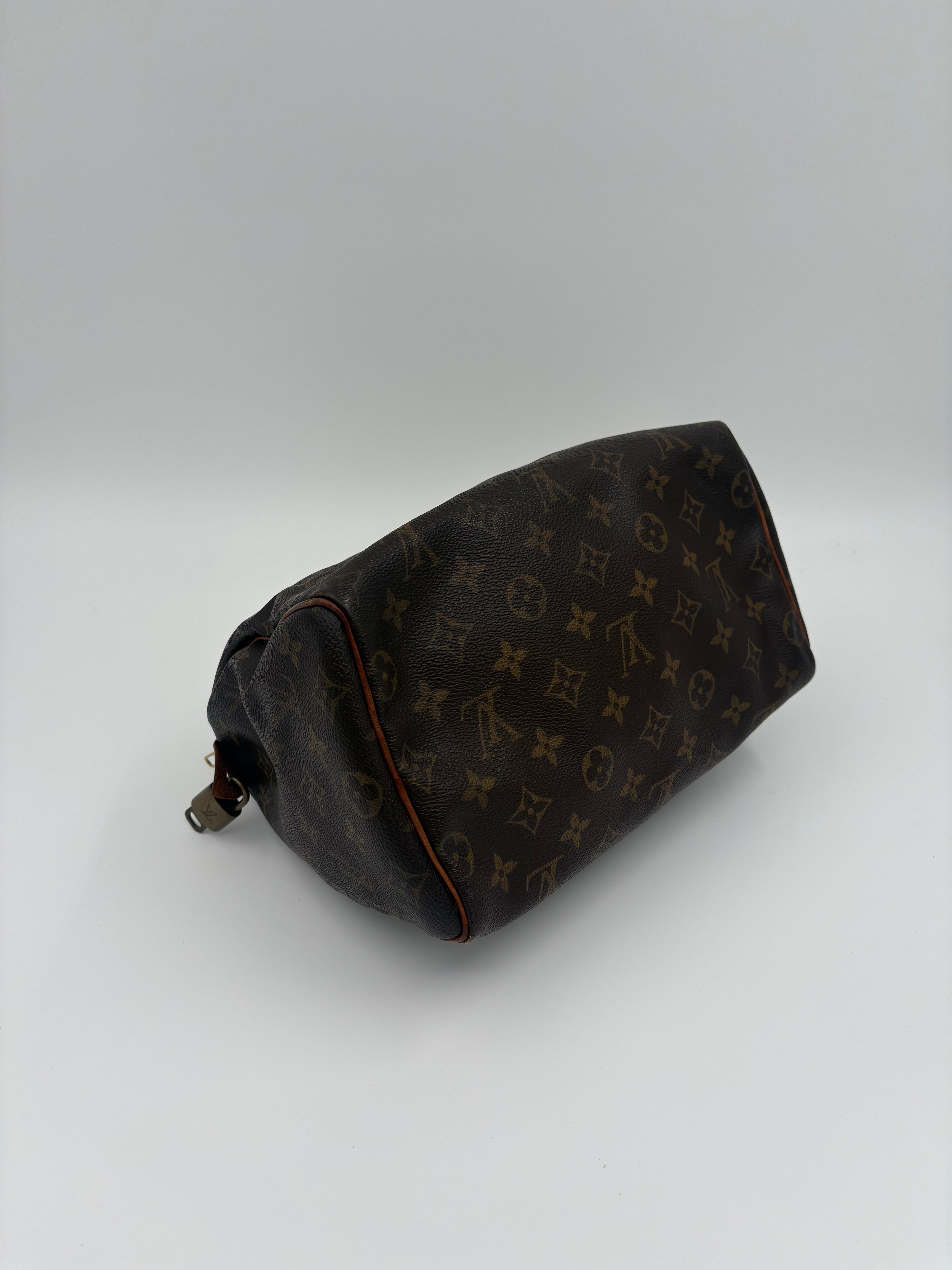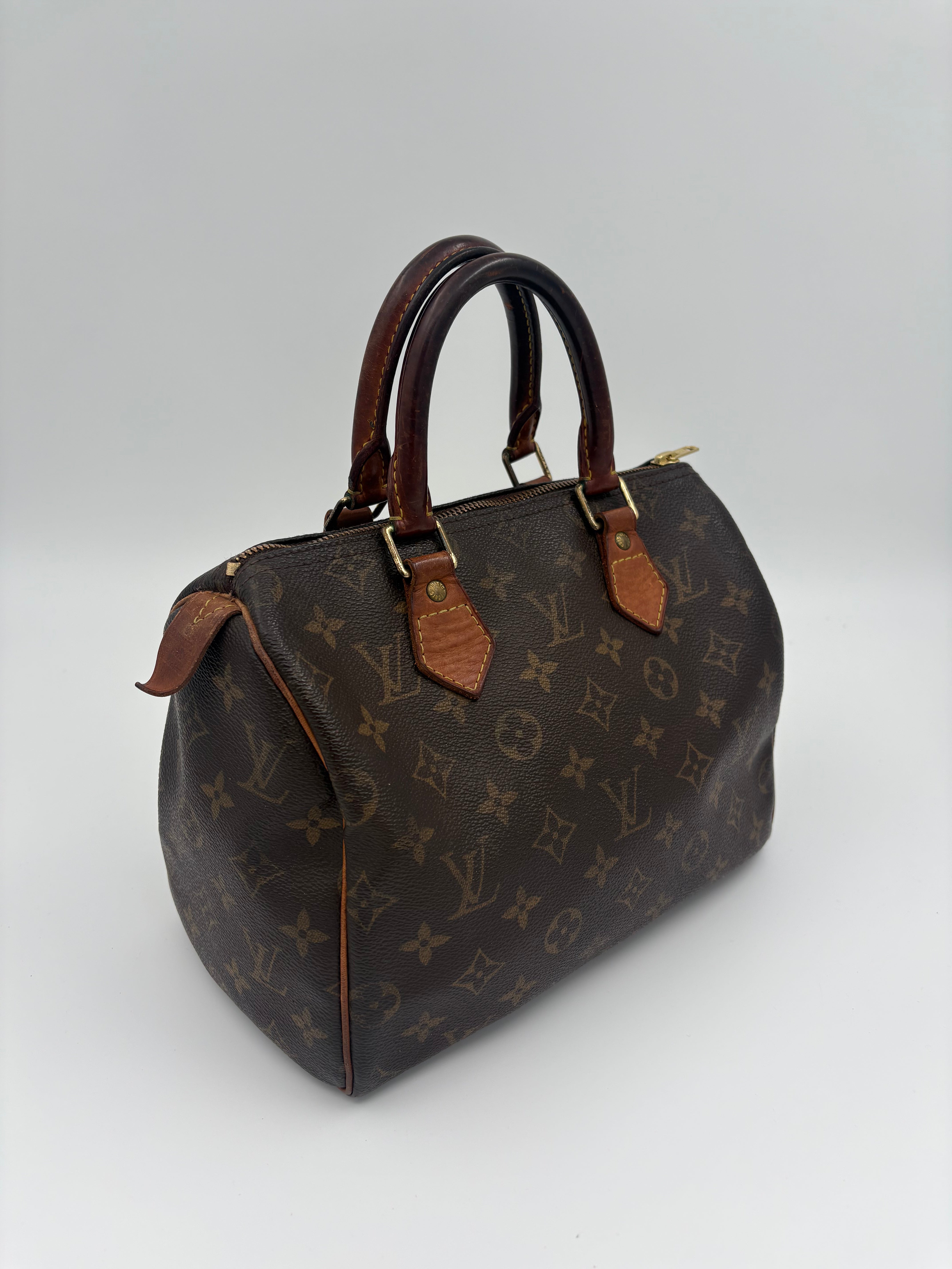 Conditie details: Handvaten zijn over de jaren heen donkerder gekleurd, rits is niet meer origineel. Tas komt inclusief sleutel + slotje