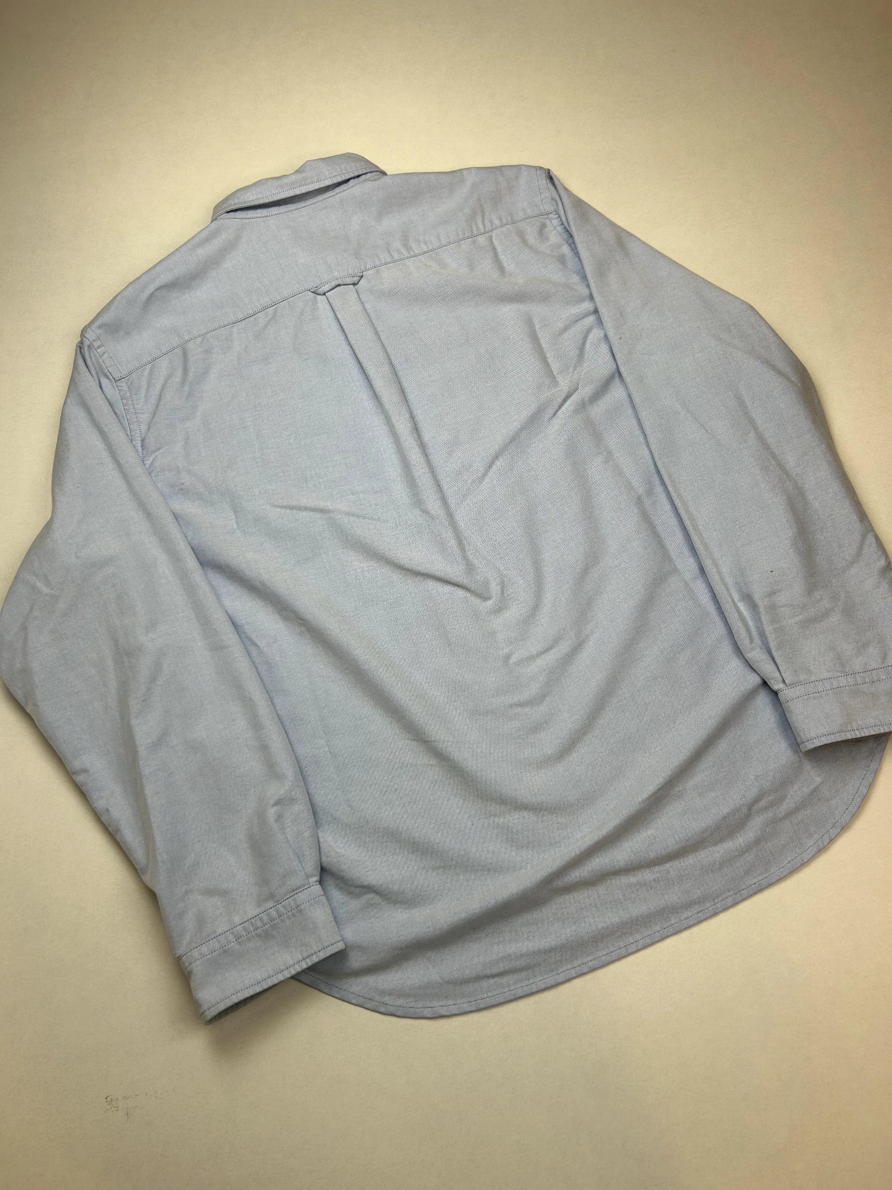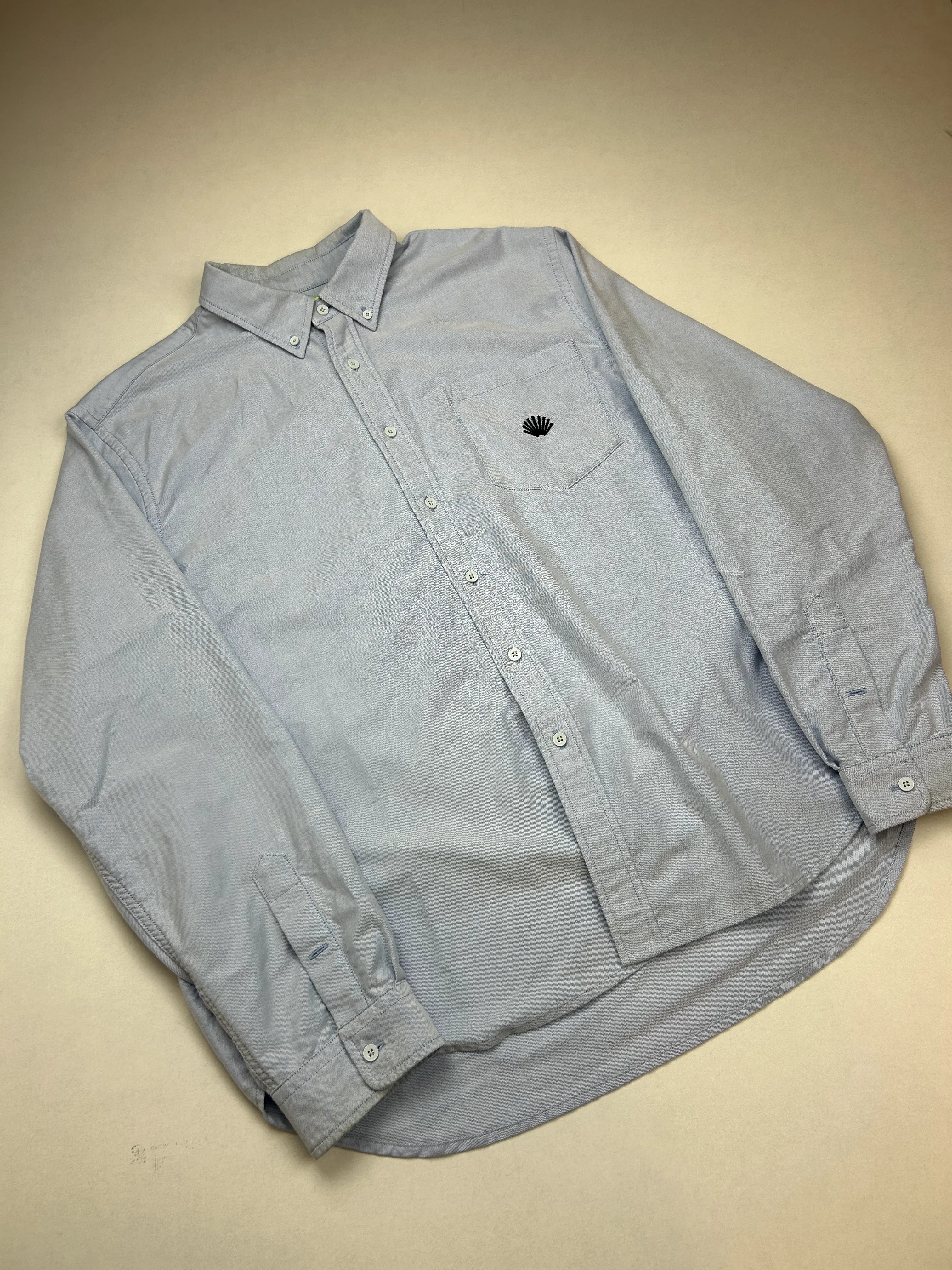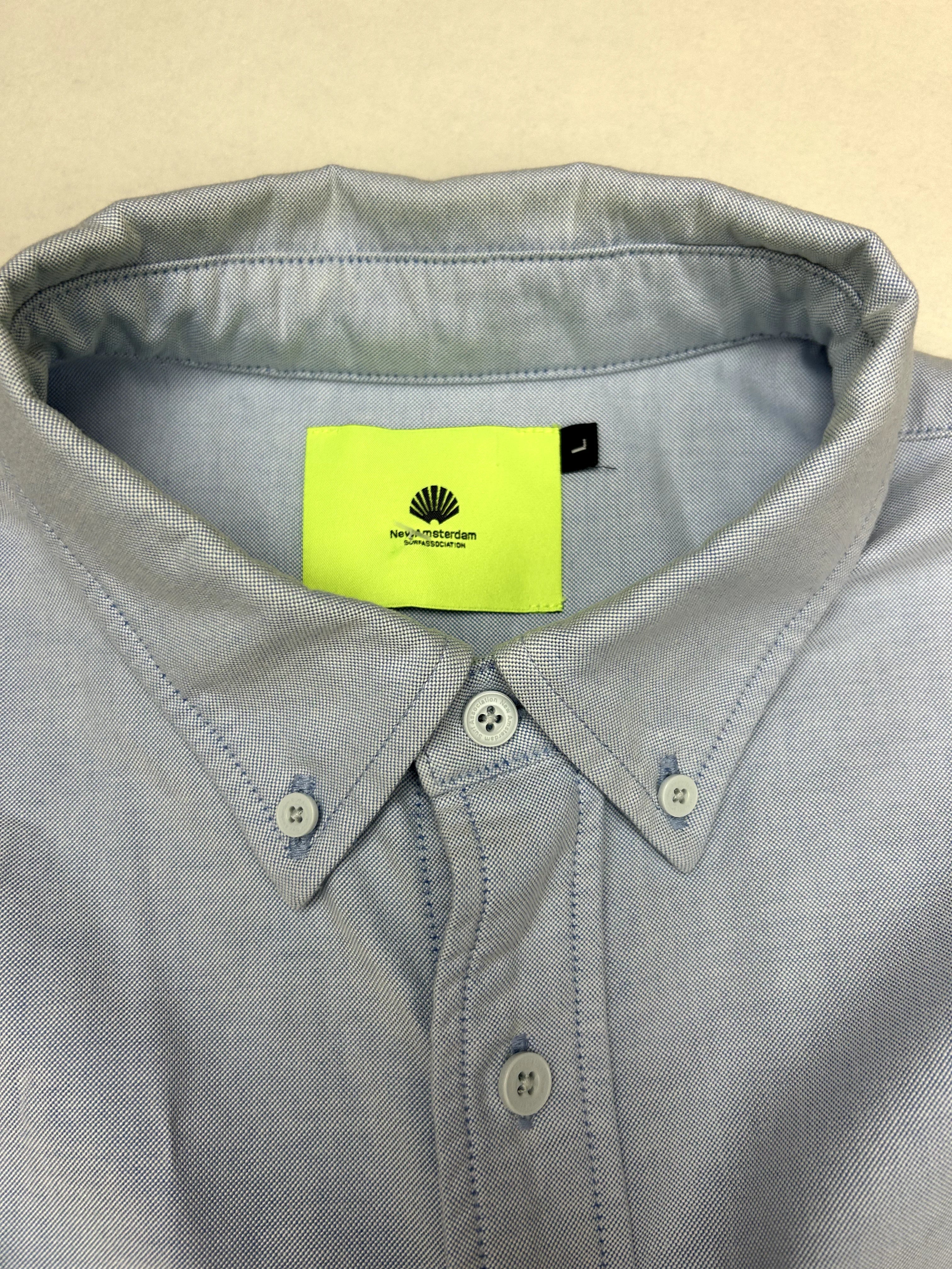 Product details: Lichtblauw overhemd, lange mouw, button-down kraag, volledige knoopsluiting, afgeronde zoom, enkele borstzak met klein zwart logo/schelp-achtig borduursel, rugplooi voor extra ruimte, binnenin neongeel merklabel New Amsterdam Surf Association.