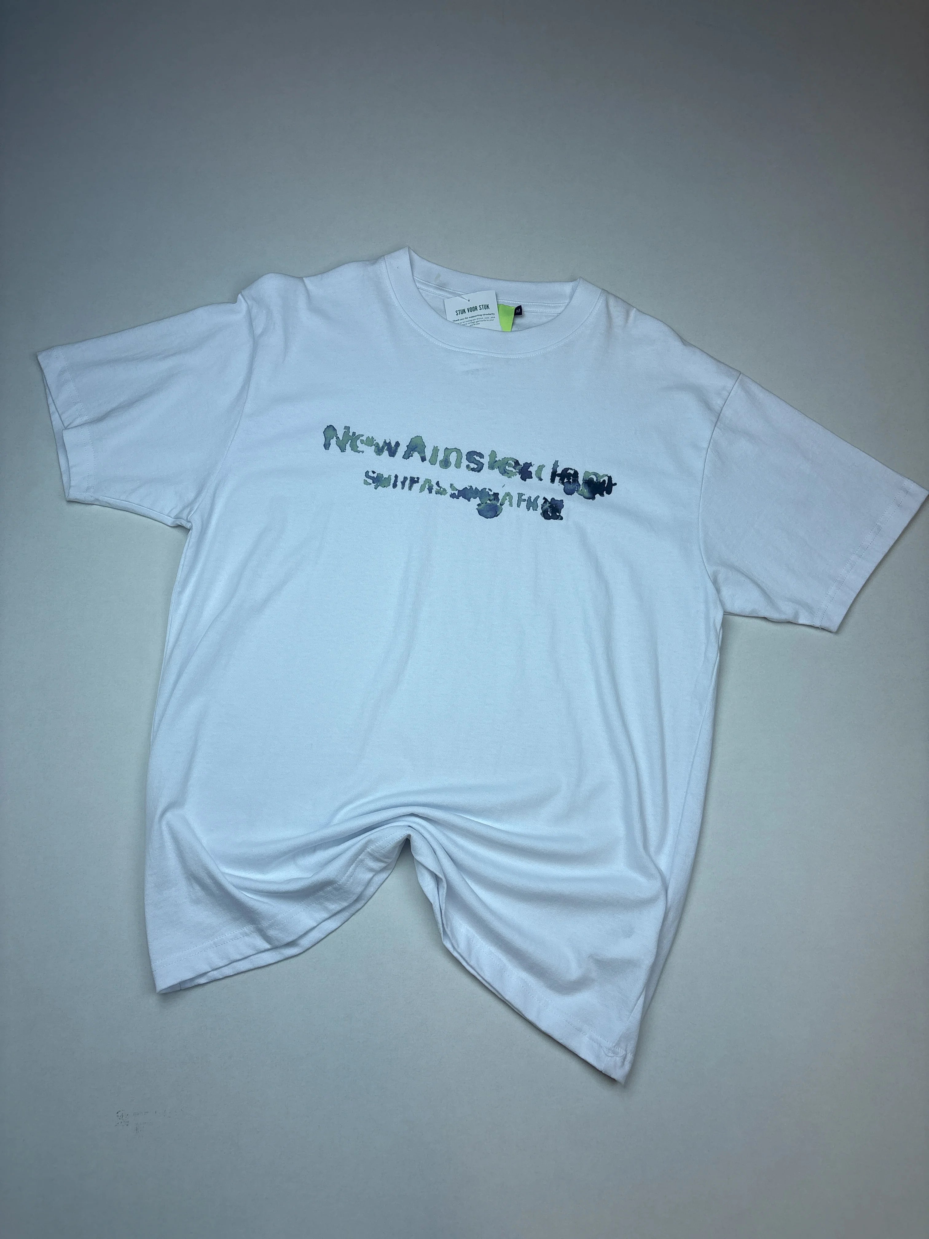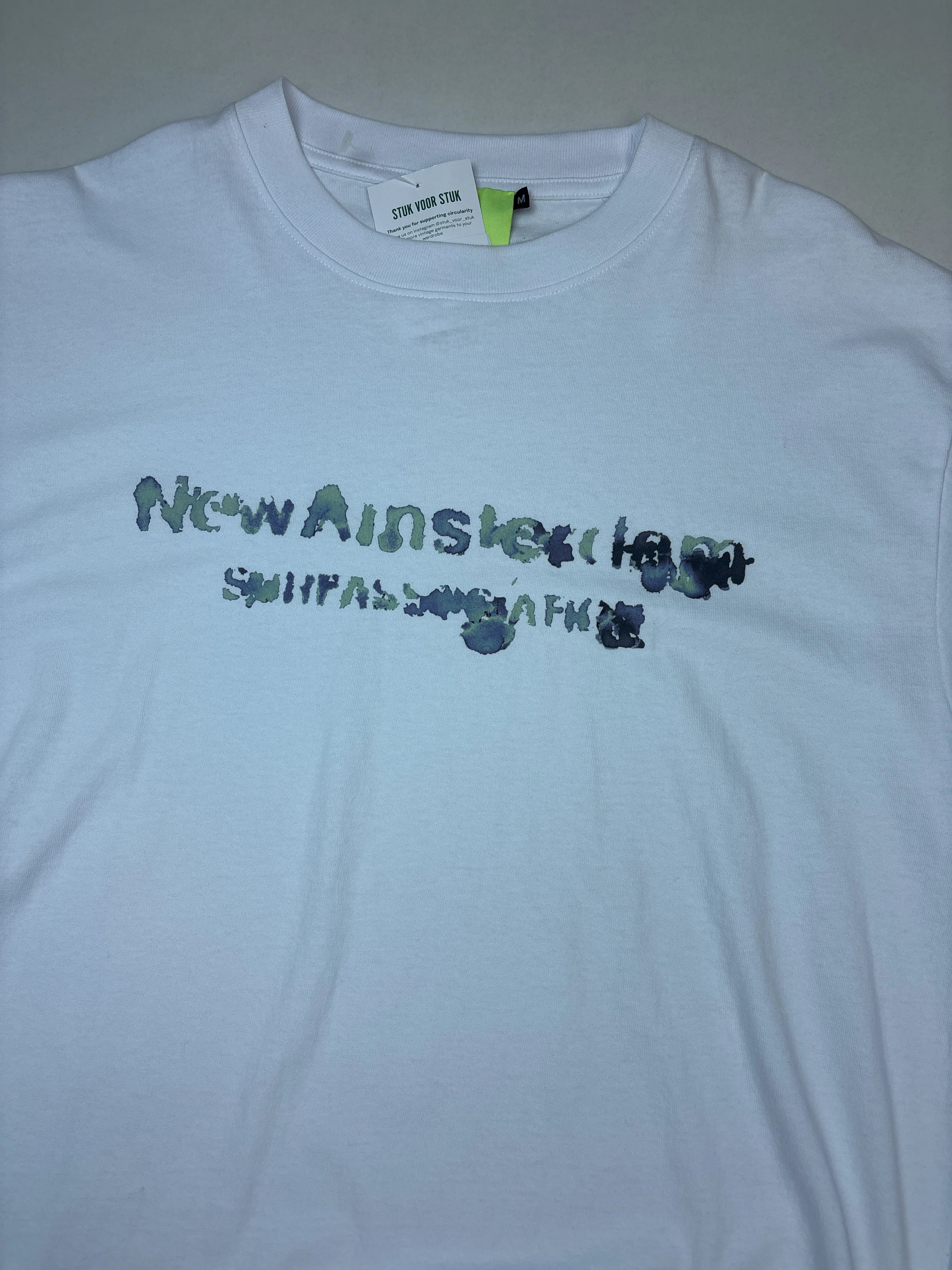 Product details: Witte katoenen T-shirt met ronde hals, korte mouwen en frontprint met tekst “New Amsterdam Surf Association” in gevlekte/gradiënt-achtige grijs-groen tinten; label in nek met Stan Ray-branding, iets boxy/oversized fit.