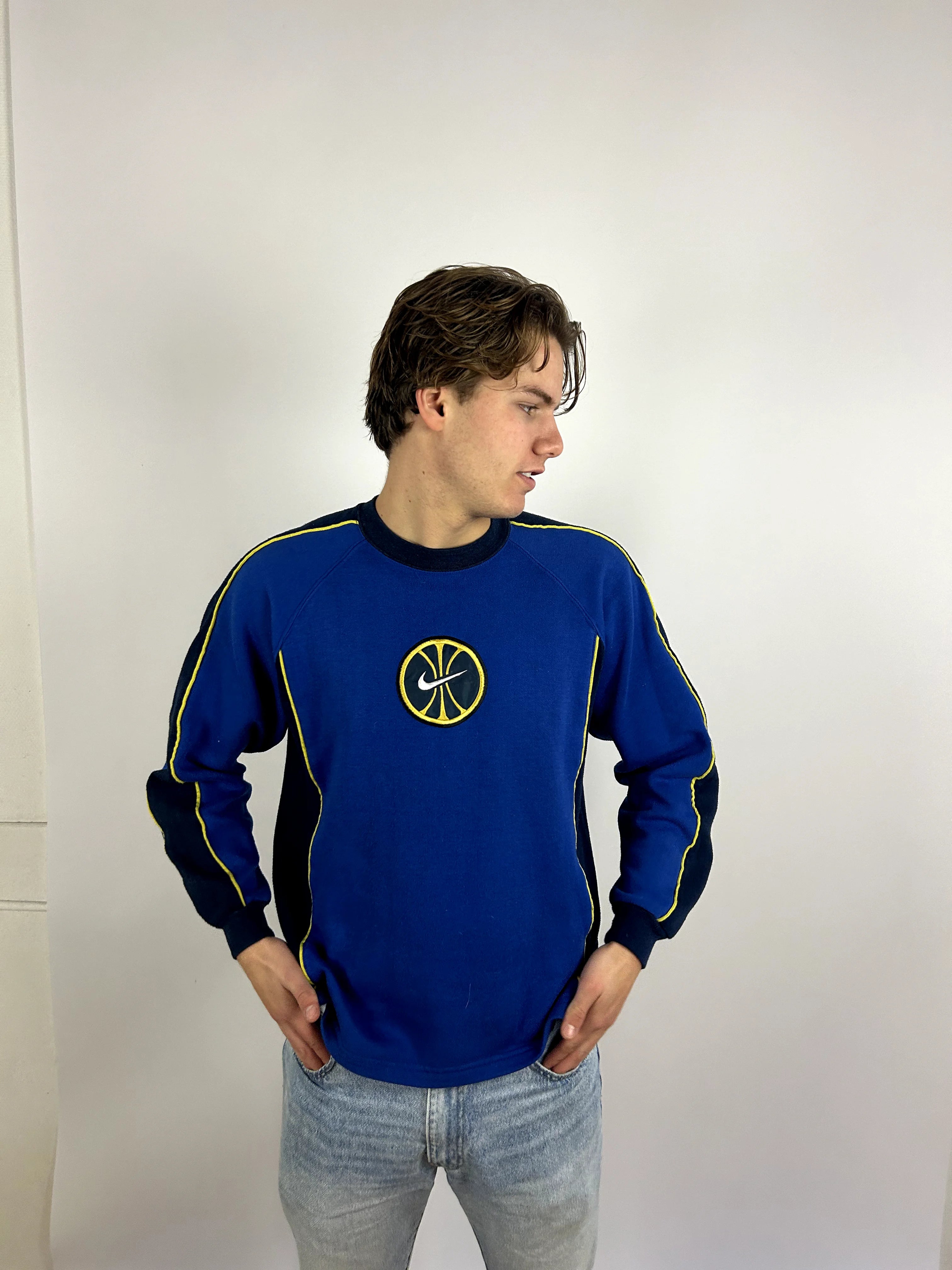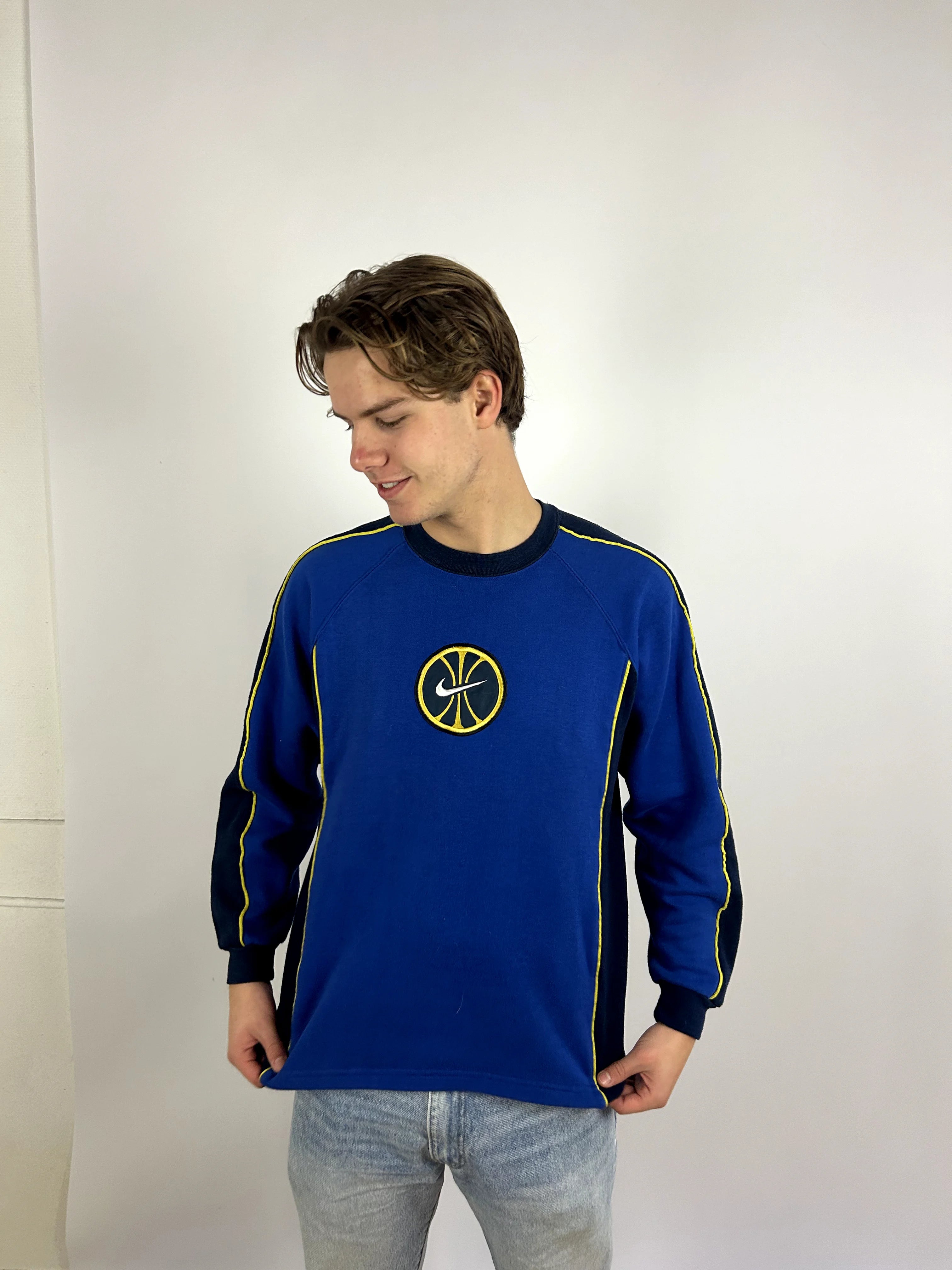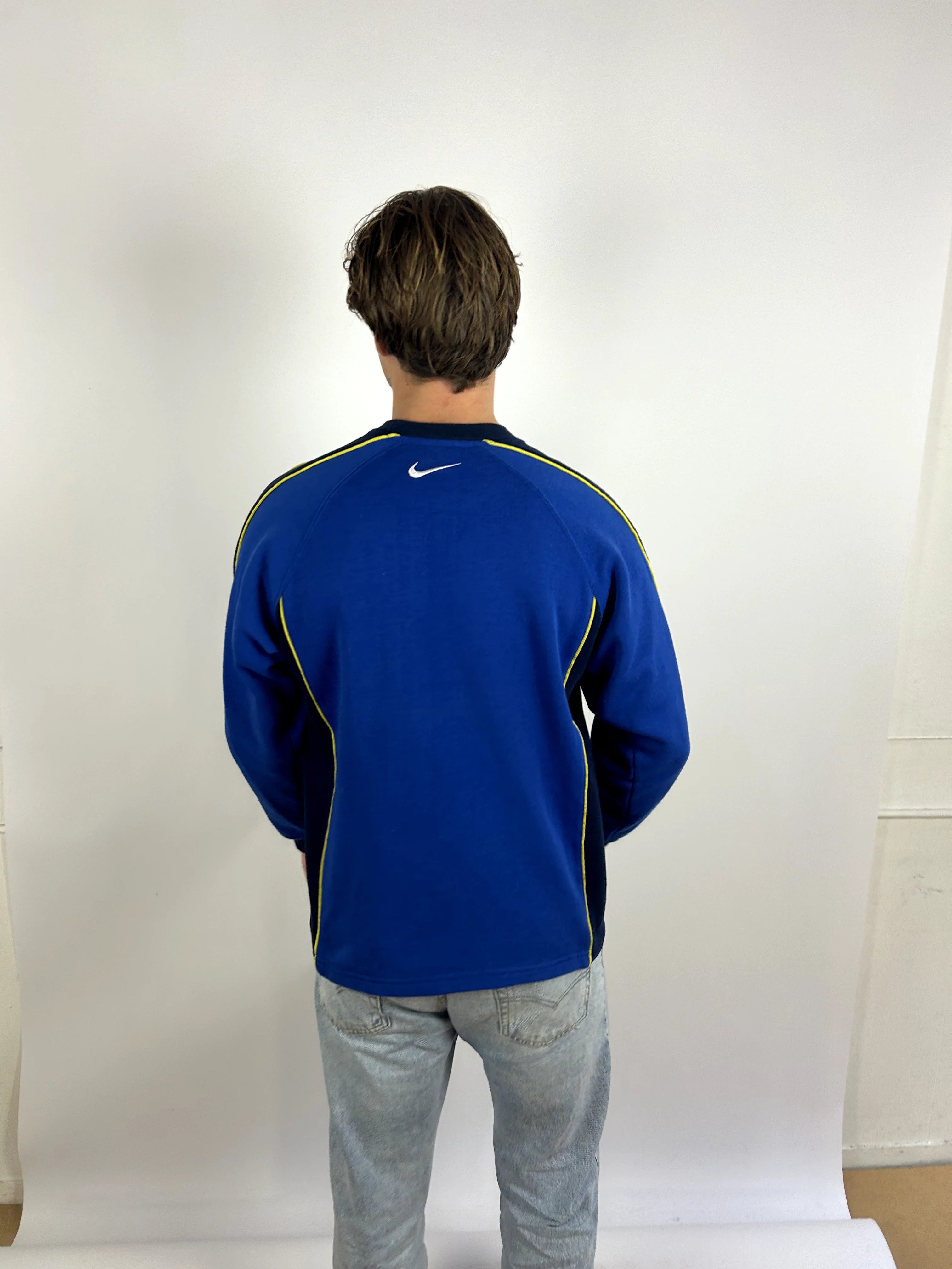 Product details: Diepblauw, raglan mouwen, gele piping, Nike-logo op borst en achterkant, retro sportstijl.