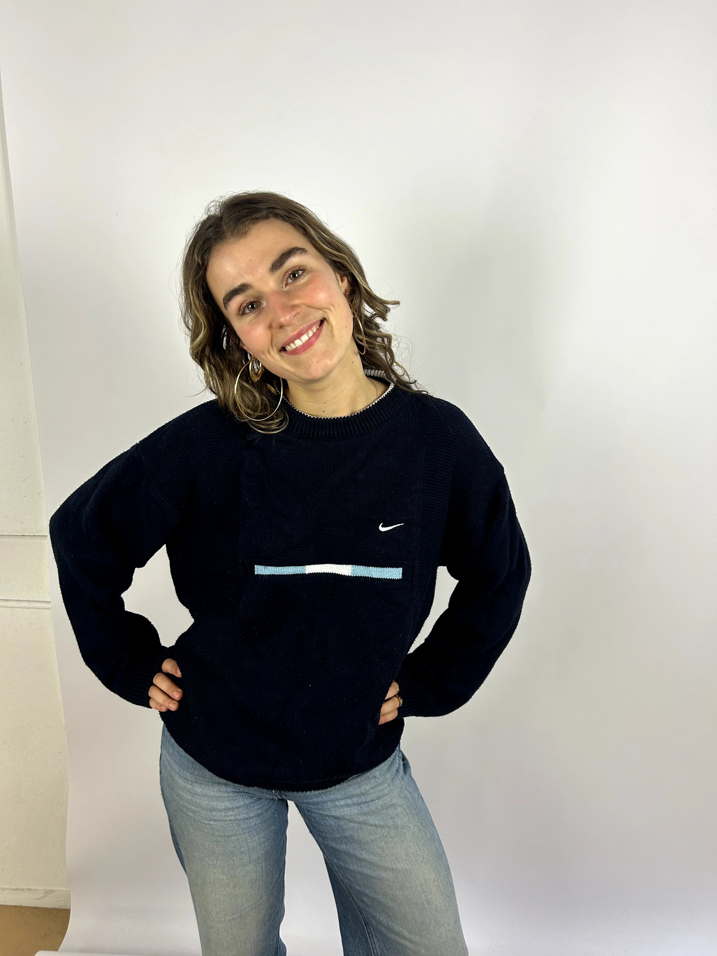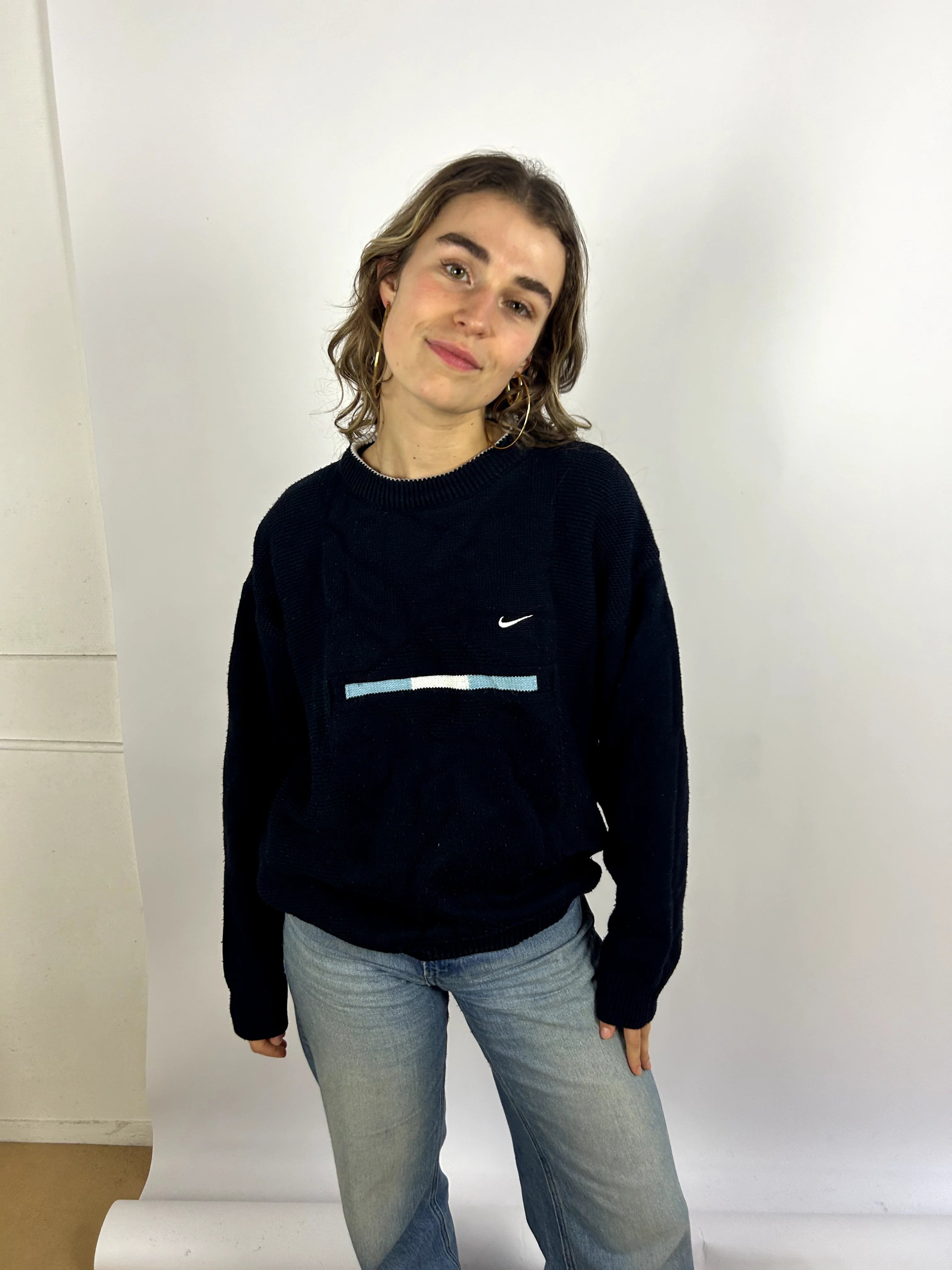 Product details: Marineblauwe sweater, gebreid, met witte swoosh en horizontale blauwe/lichte streep op de borst. Relaxed fit, klassiek sportdesign.