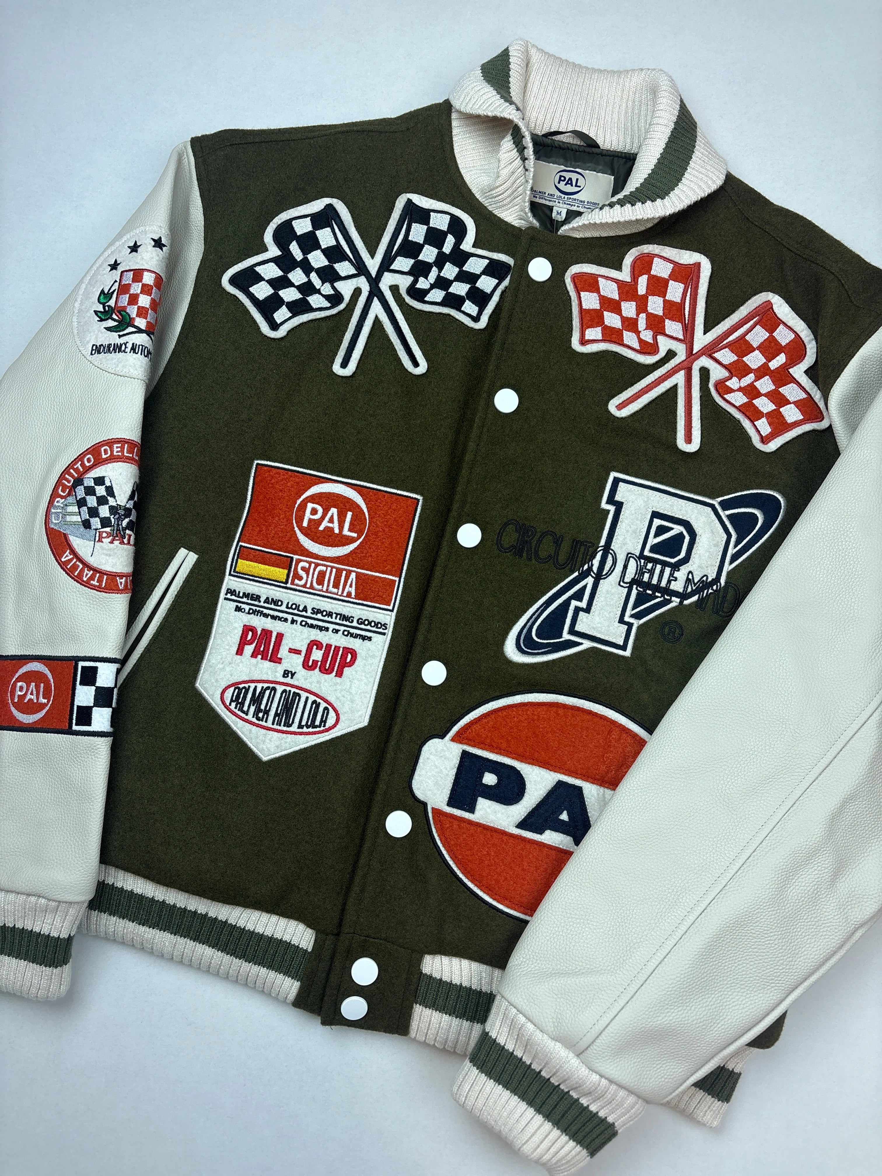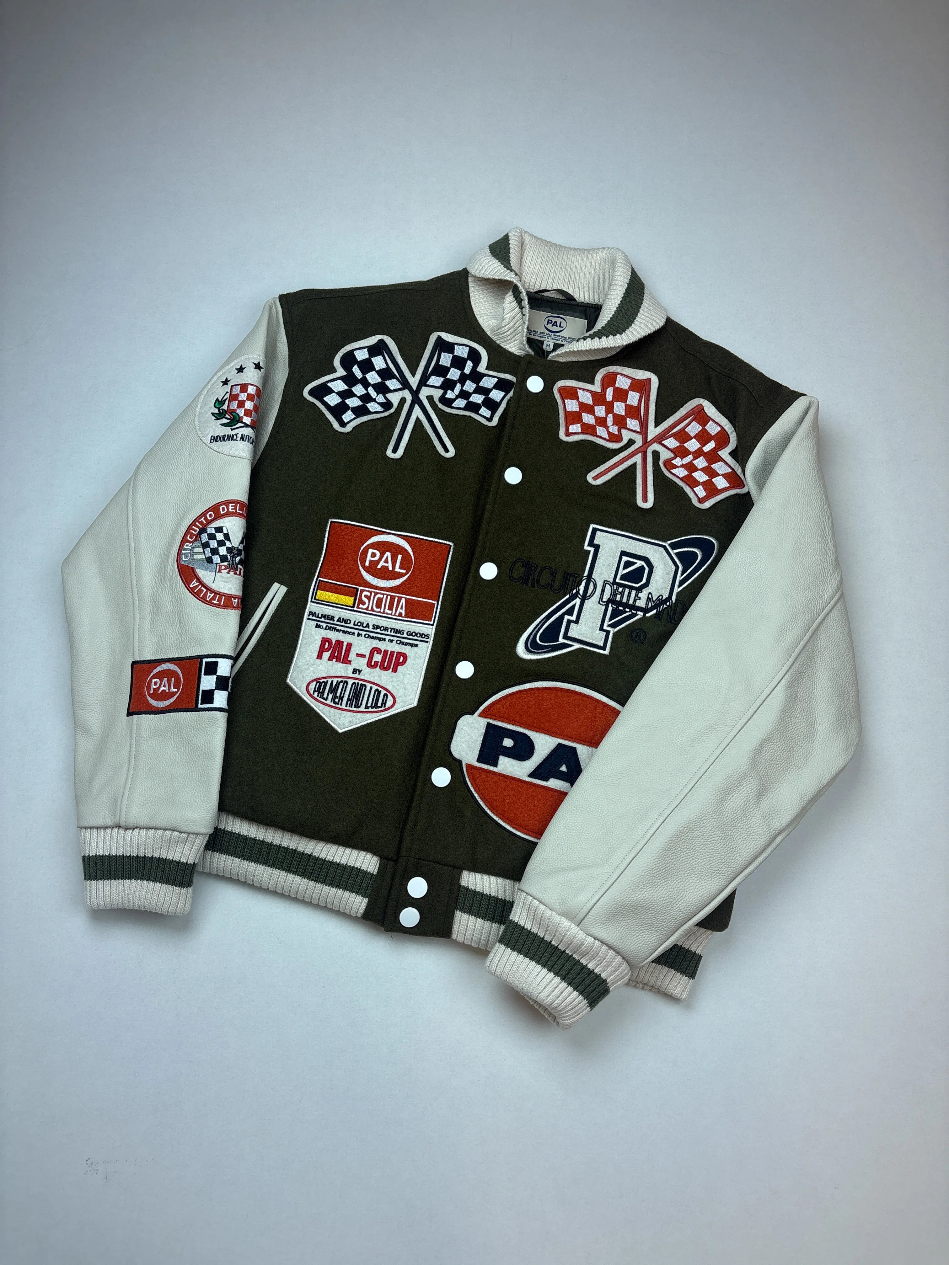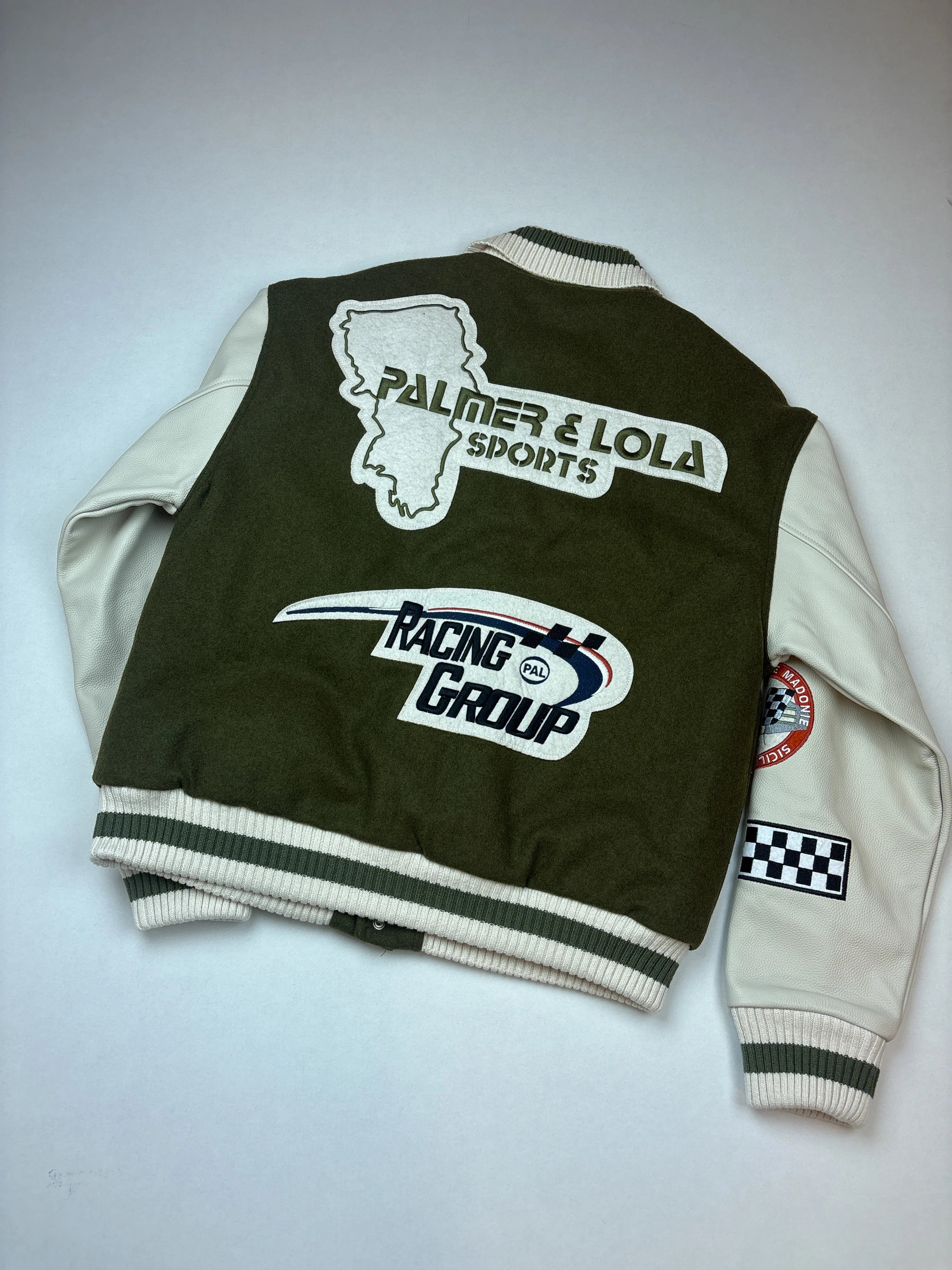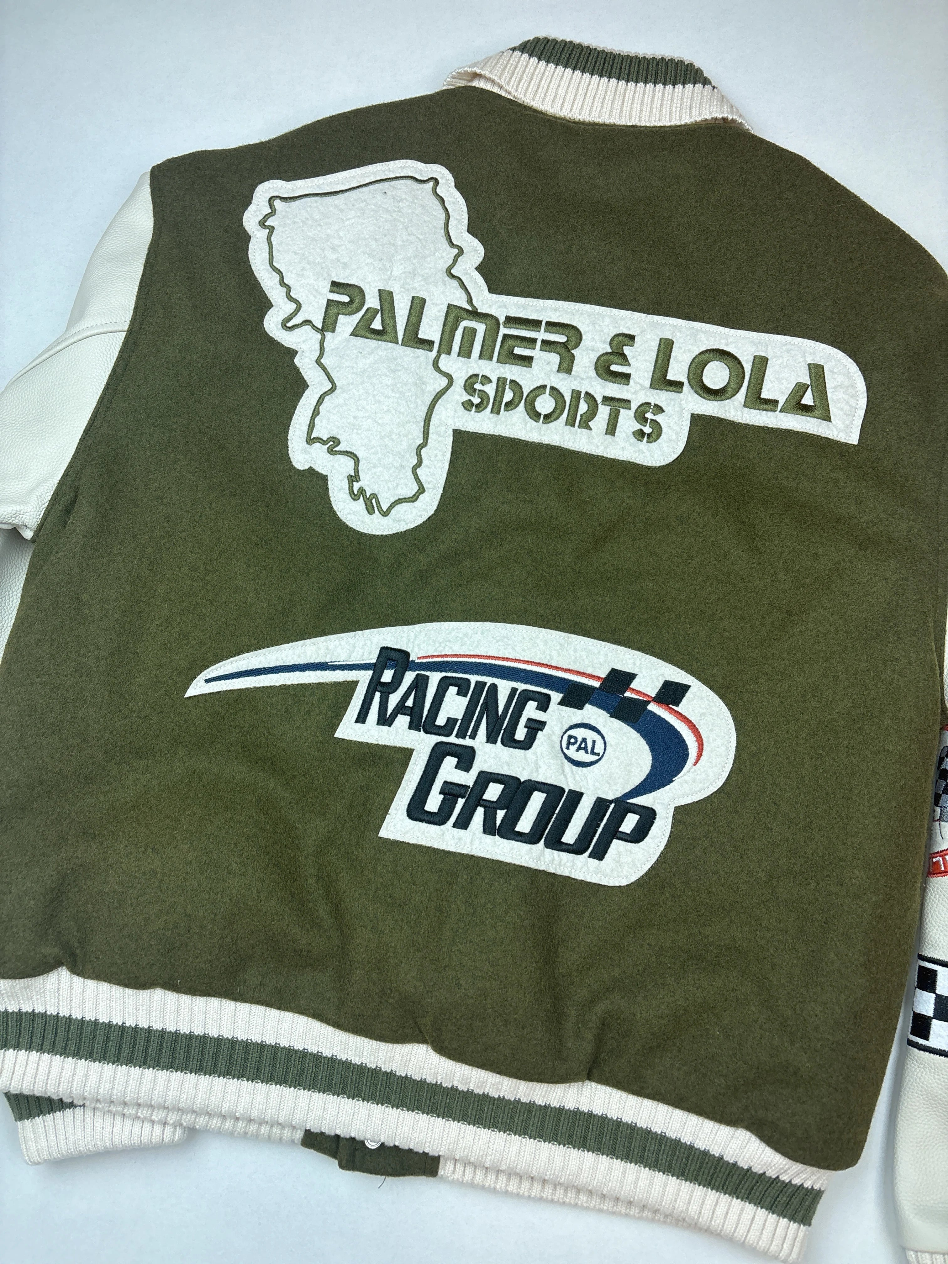 Product details: Varsity/bomber jack met legergroene body en offwhite leren look mouwen, ribgebreide kraag, boorden en zoom, drukknopen voor, grote chenille en geborduurde racing patches voor en achter, checker vlaggen, PAL- en Palmer & Lola-logo’s, contrastmouwen.