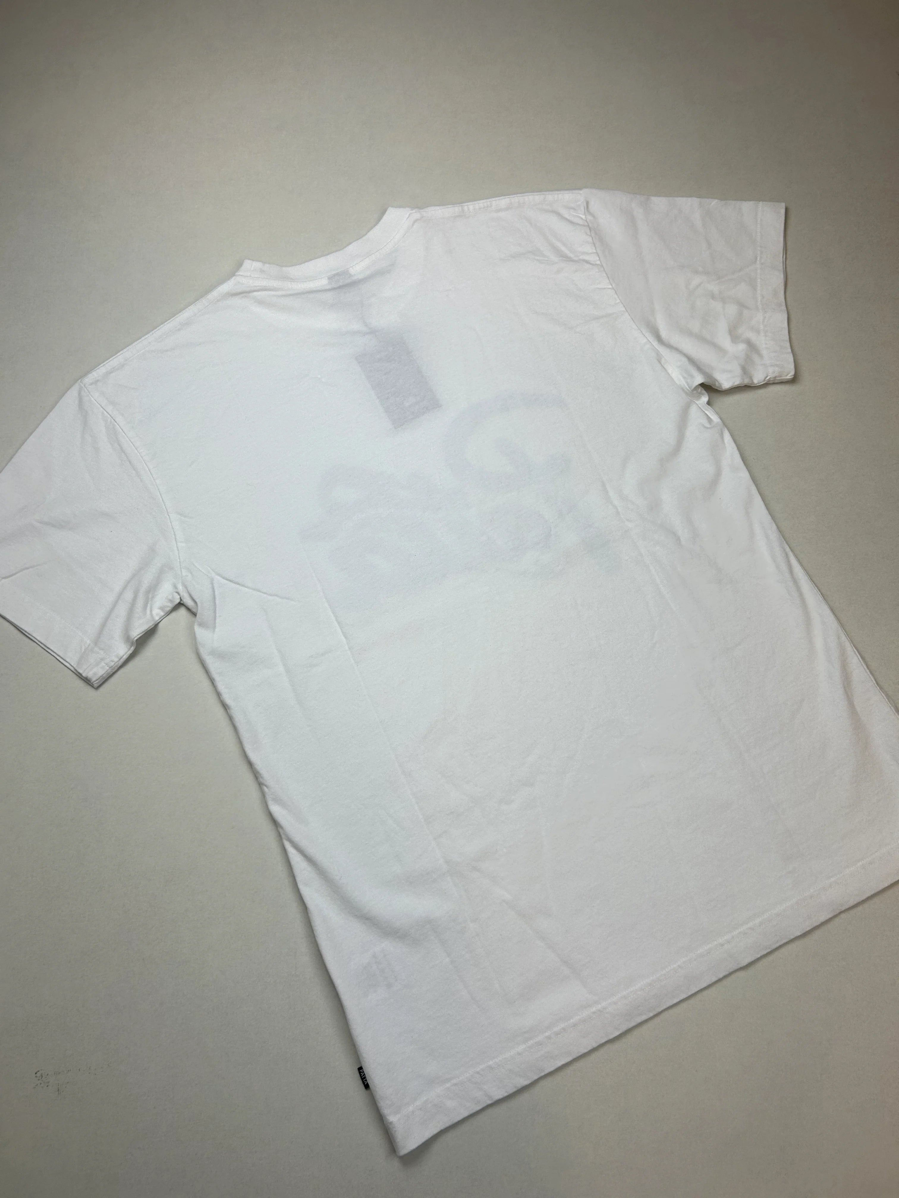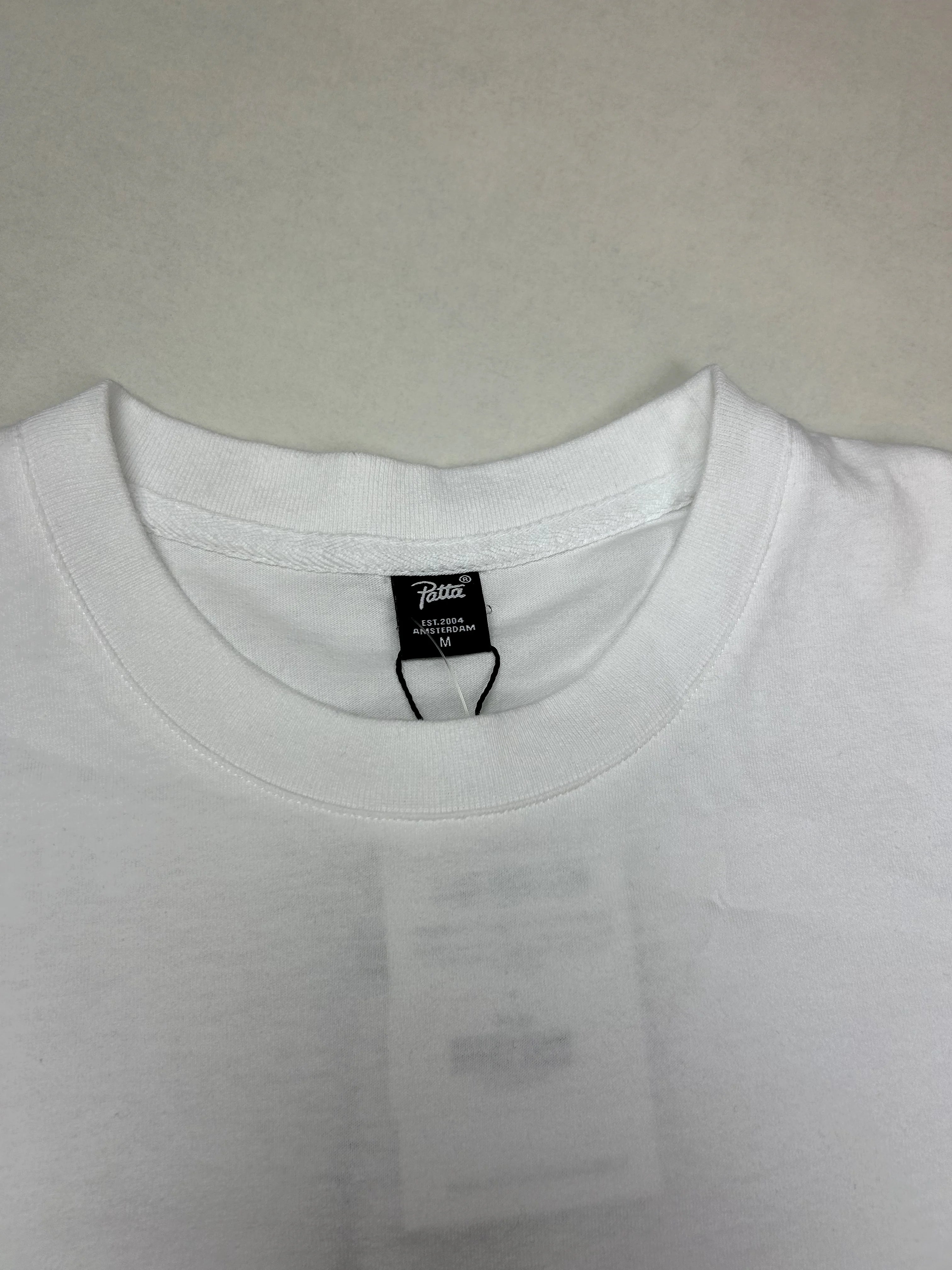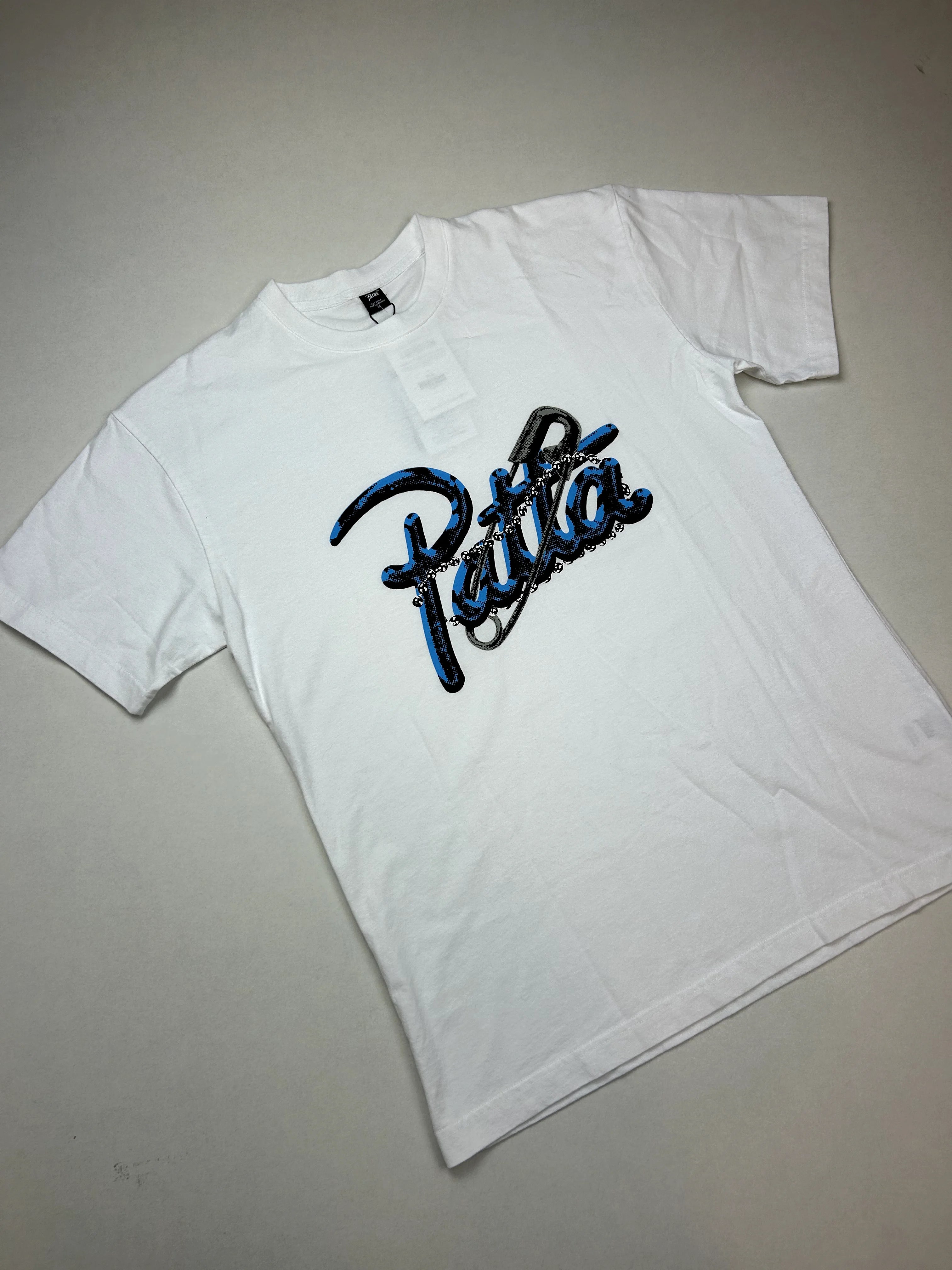 Product details: Wit crewneck T-shirt van katoen met grote Patta-scriptlogo frontprint in blauw/zwart gradient, subtiel glanzende print, ribgebreide hals en geweven Patta necklabel.