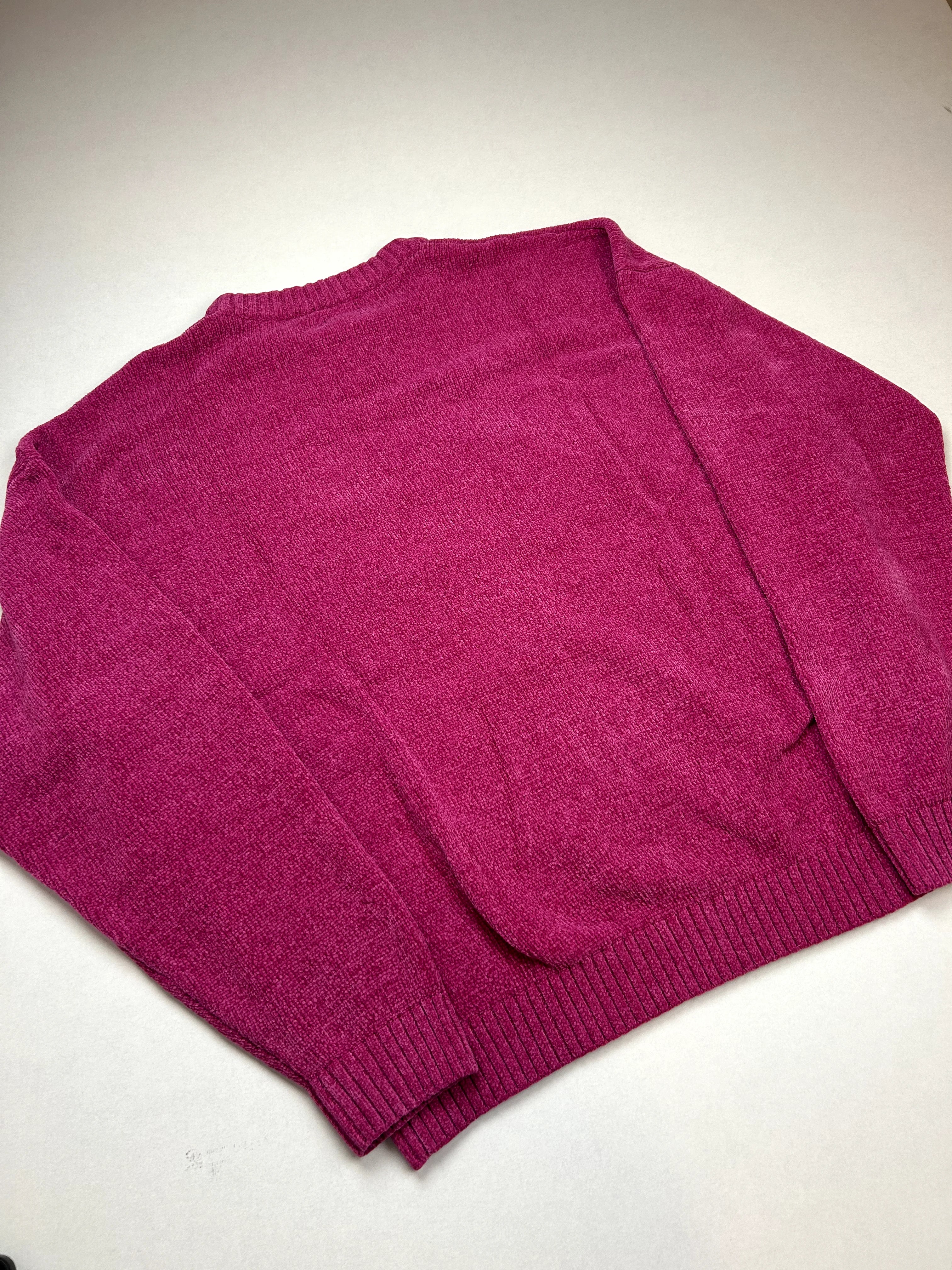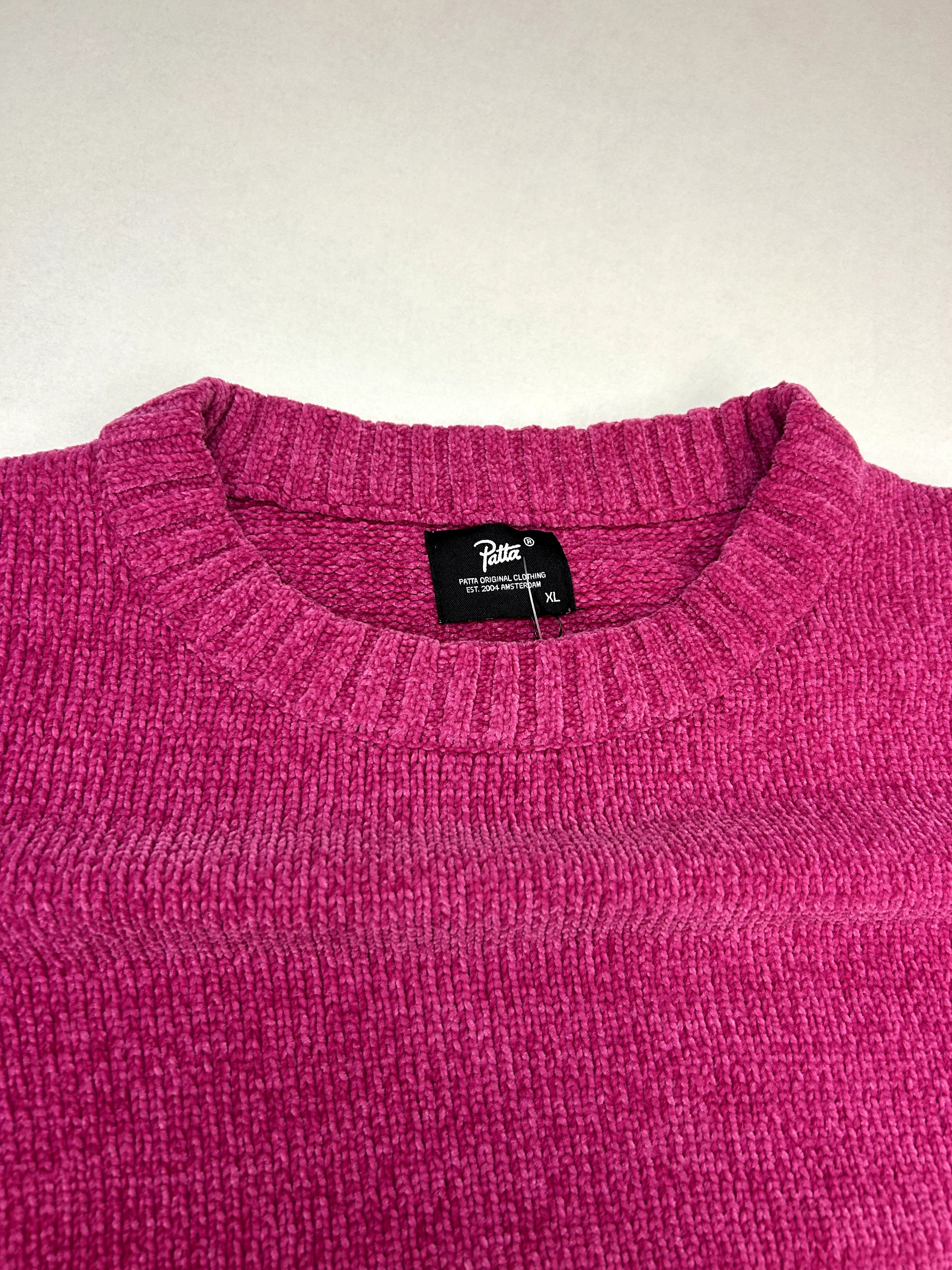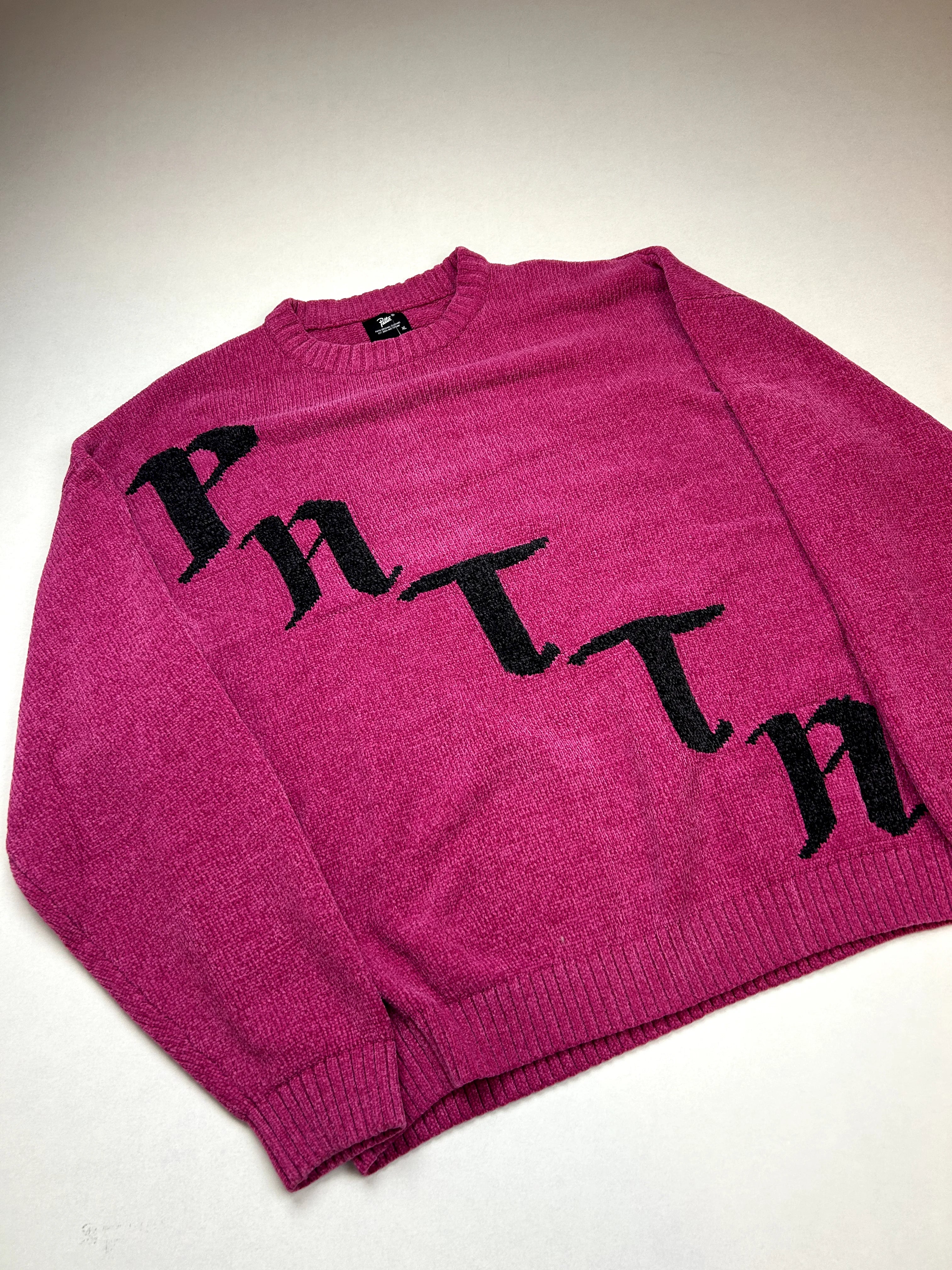 Product details: Fuchsia/felroze gebreide trui, ronde hals met ribboord, ribboorden onderaan en aan de manchetten, groot zwart ingeweven lettermotief "PITTN" diagonaal over de voorkant, maat XL volgens label.